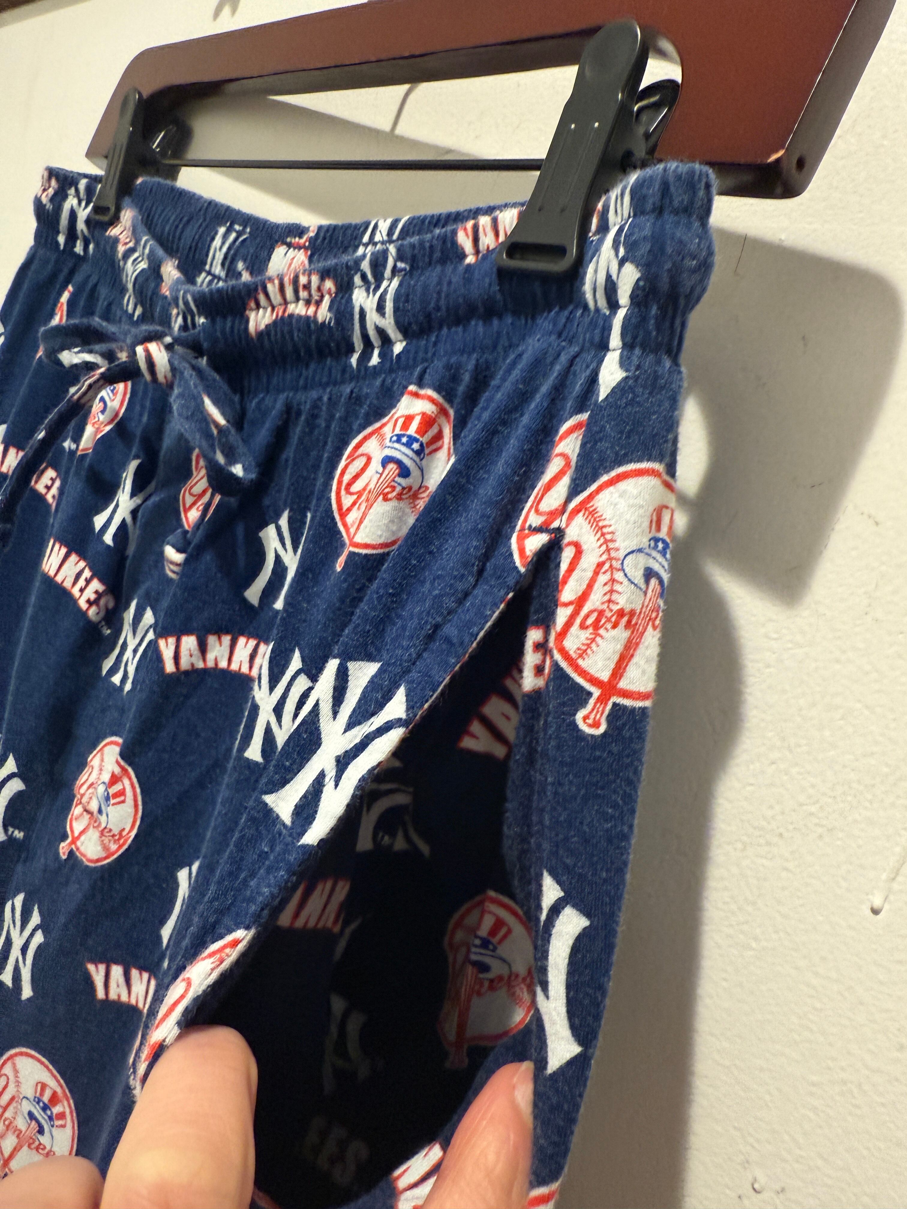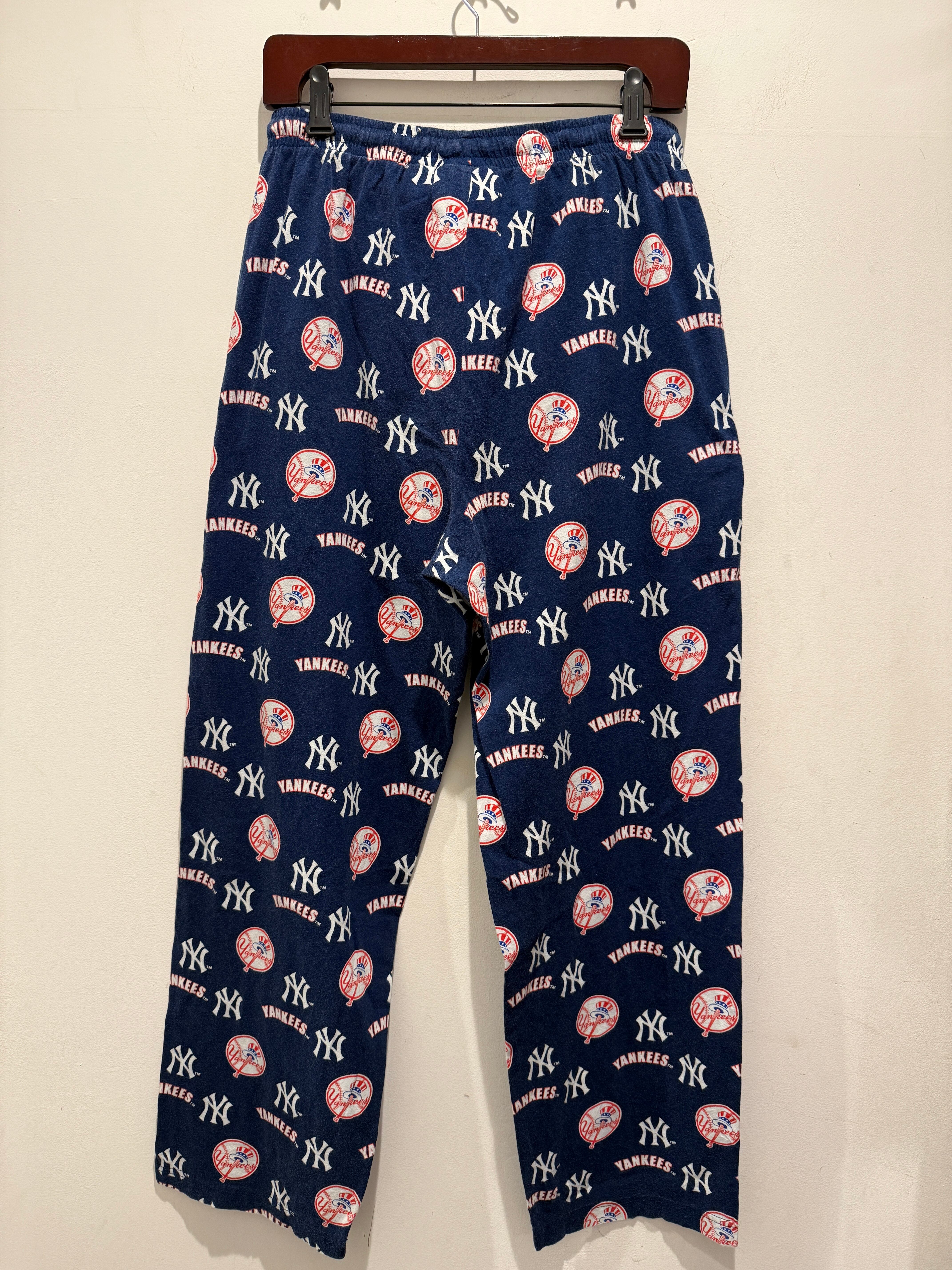 MLBニューヨークヤンキースのパジャマパンツです。ネイビーベースにヤンキースのロゴが総柄でデザインされています。薄手の生地感でウエストがゴムと紐で調整出来て楽チンに履けるのも魅力的ですね。サイドポケットもありコンディションも良くユニセックスでオススメです。