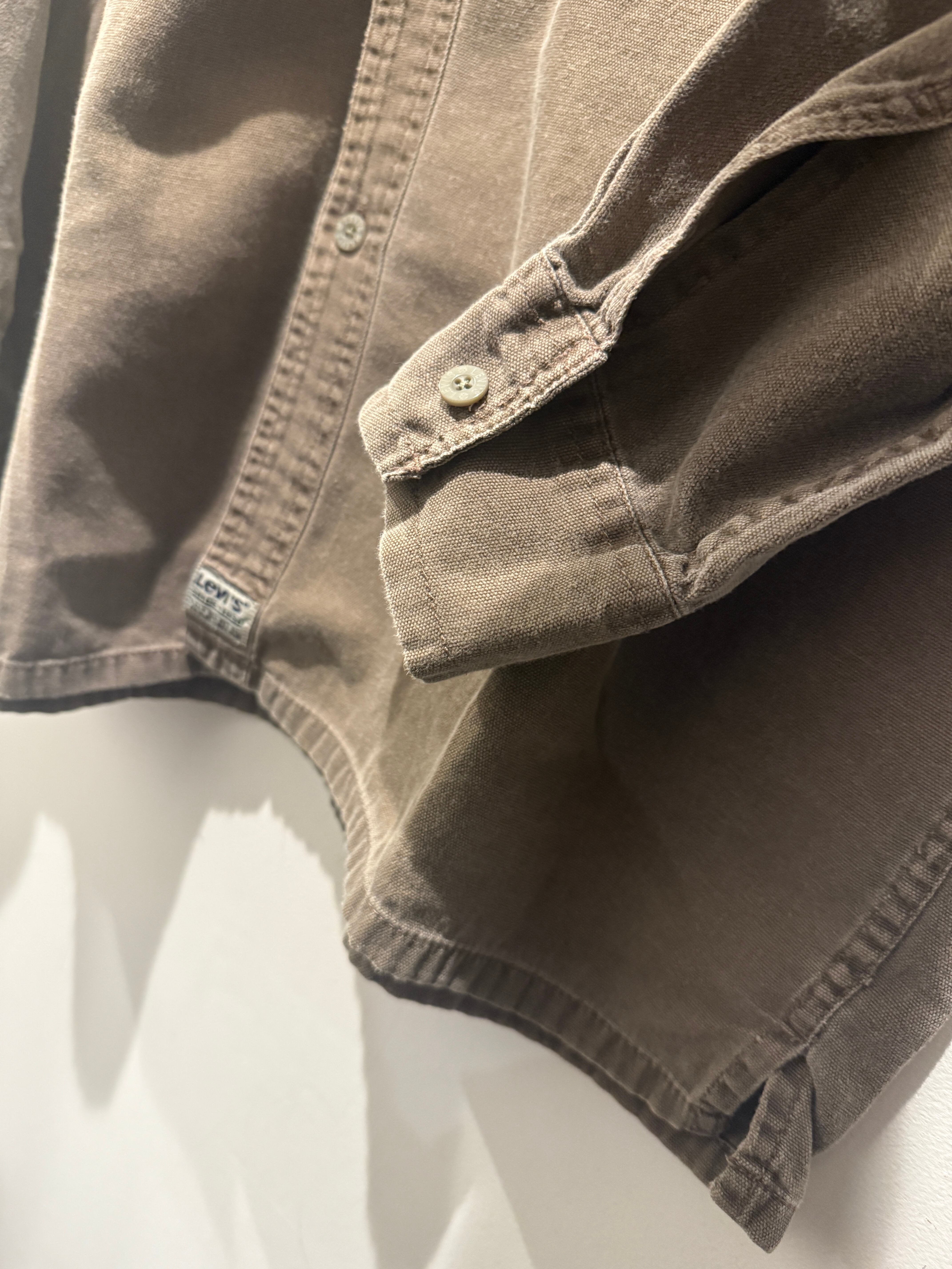 90年代リーバイスのダックシャツです。若干の薄手ですが珍しいダック地のシャツとなります。フロント2ポケットでブラウンカラーのボタンにロゴが入るのも良い感じですね。身幅もしっかりあって90年代らしいゆったりな作りとユニセックスでオススメです。