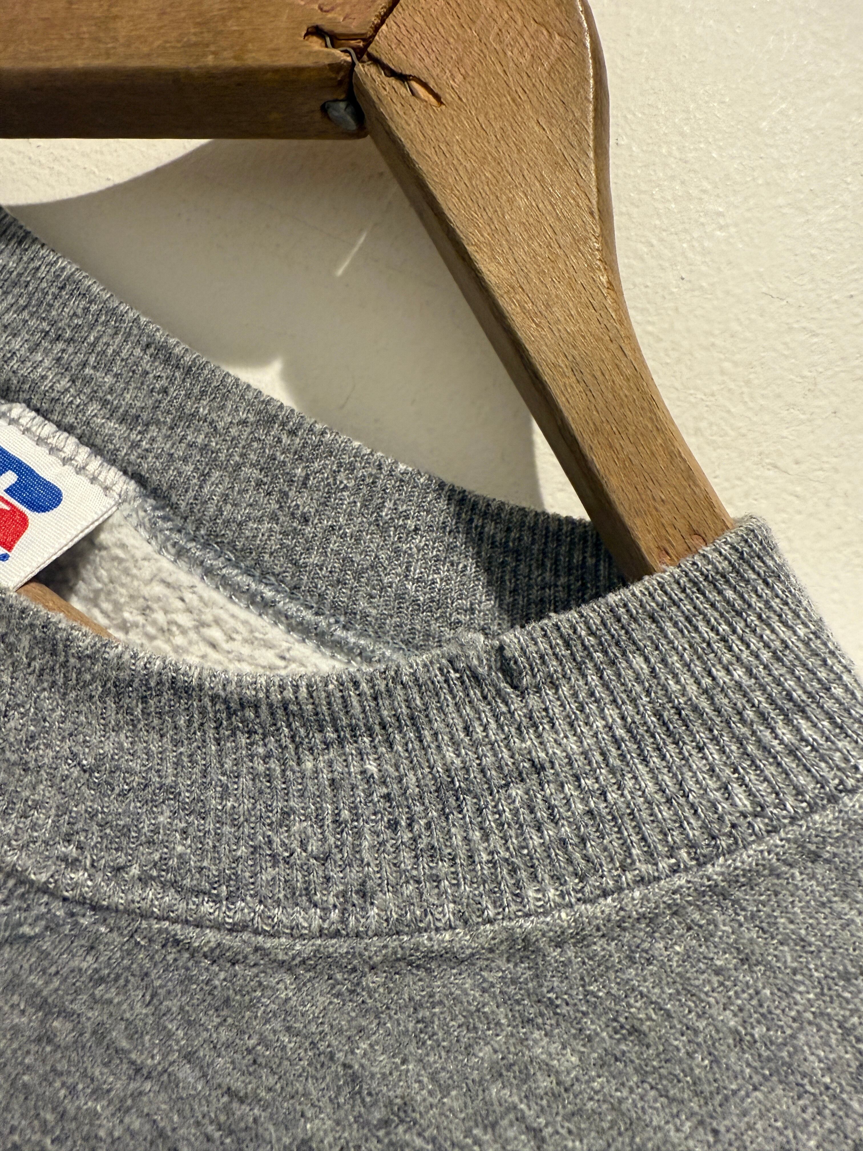 80年代アメリカ製ラッセルのスウェットです。濃いめのグレーボディにネイビーのラバープリントで、かすれたプリントがとても良い1着です。ビンテージスウェットに近い雰囲気でオールドイングリッシュのデザインもまた最高ですね。ボックスシルエットで生地感も柔らかくて着やすくユニセックスでオススメなスウェットです。