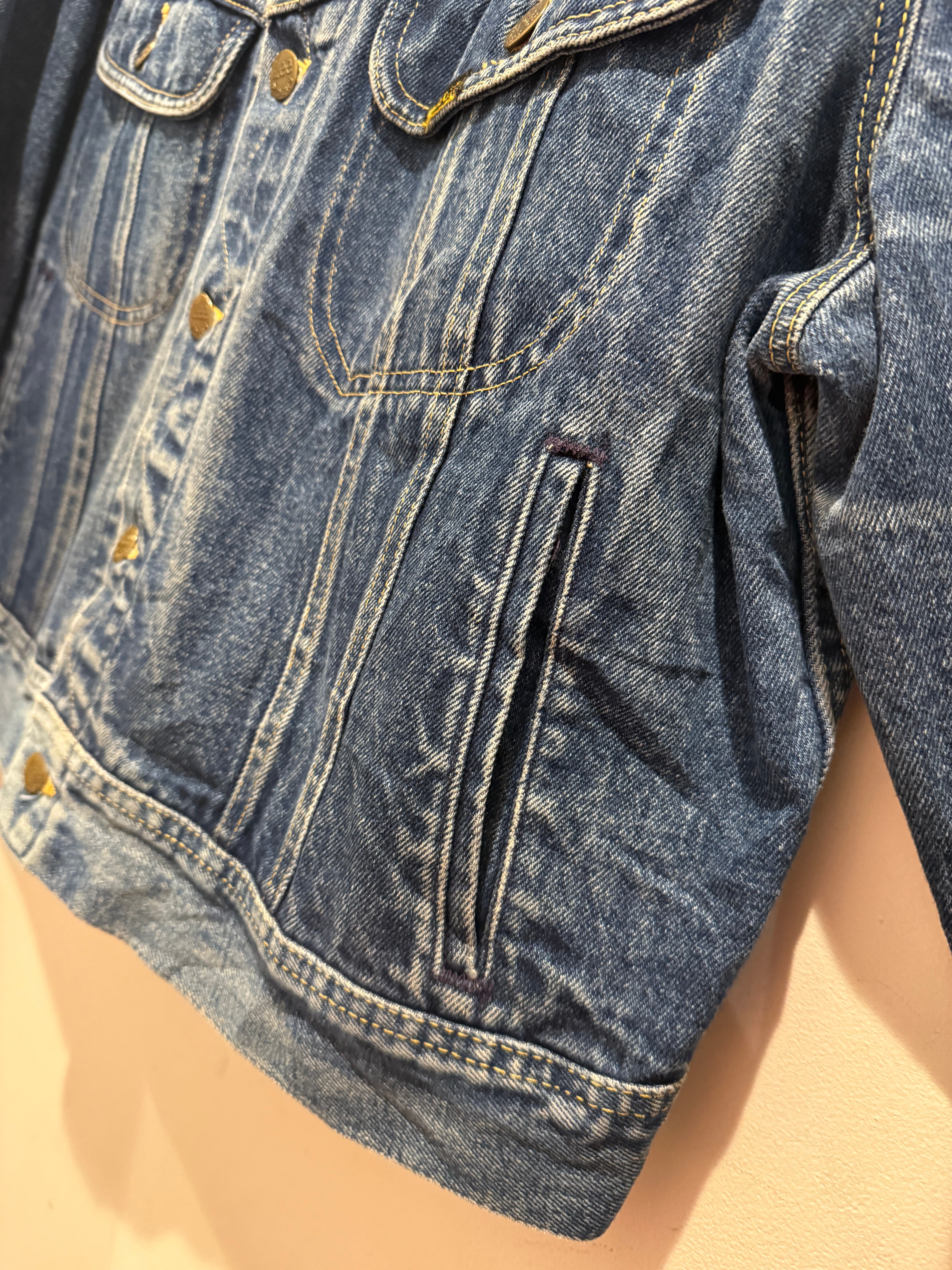 80年代アメリカ製リーのデニムジャケットです。タグ、ピスネーム共にM.R.入りでオールイエローステッチとなります。デニムパンツ同様アメリカ製のLeeは少なくなってきていて希少となってきましたね。こちらはサイドポケット付きでサイズ表記48と大きめなサイズ感となります。Leeのジージャンはリーバイスに比べて作りも小さいのでこのサイズ感はとても良いですね。袖の色落ち感も良く、色もまだ残っていて中にリバースなど組み合わせて着用するのもオススメです。