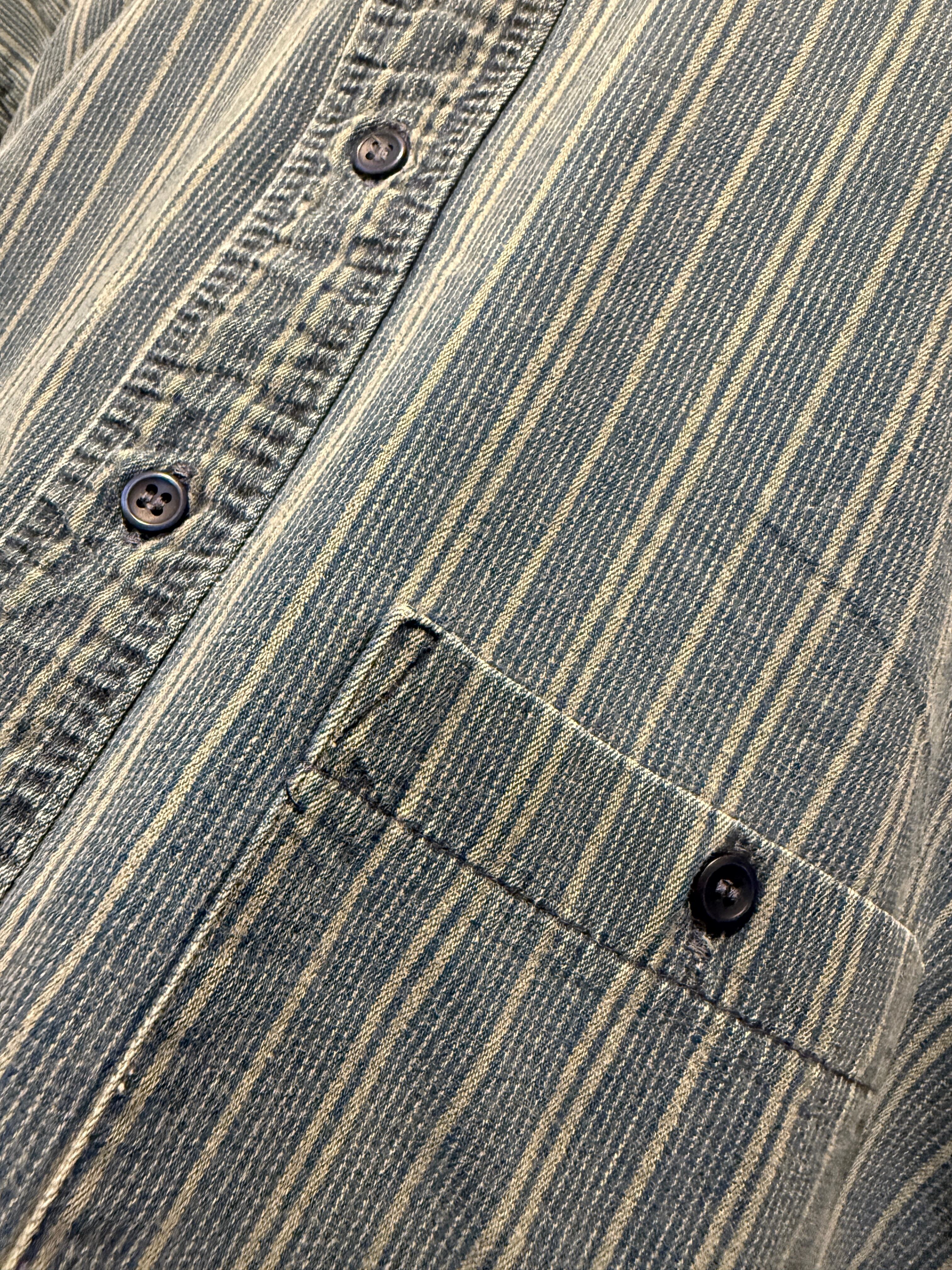 80年代アメリカ製ラングラーのデニムシャツです。デニム地のストライプで珍しいバンドカラーとなります。ボタンもデニムカラーでラングラーらしくバッグはウエスタンヨークなのも最高です。しっかりアメリカ製で着用しやすいデニムシャツとオススメな1着です。