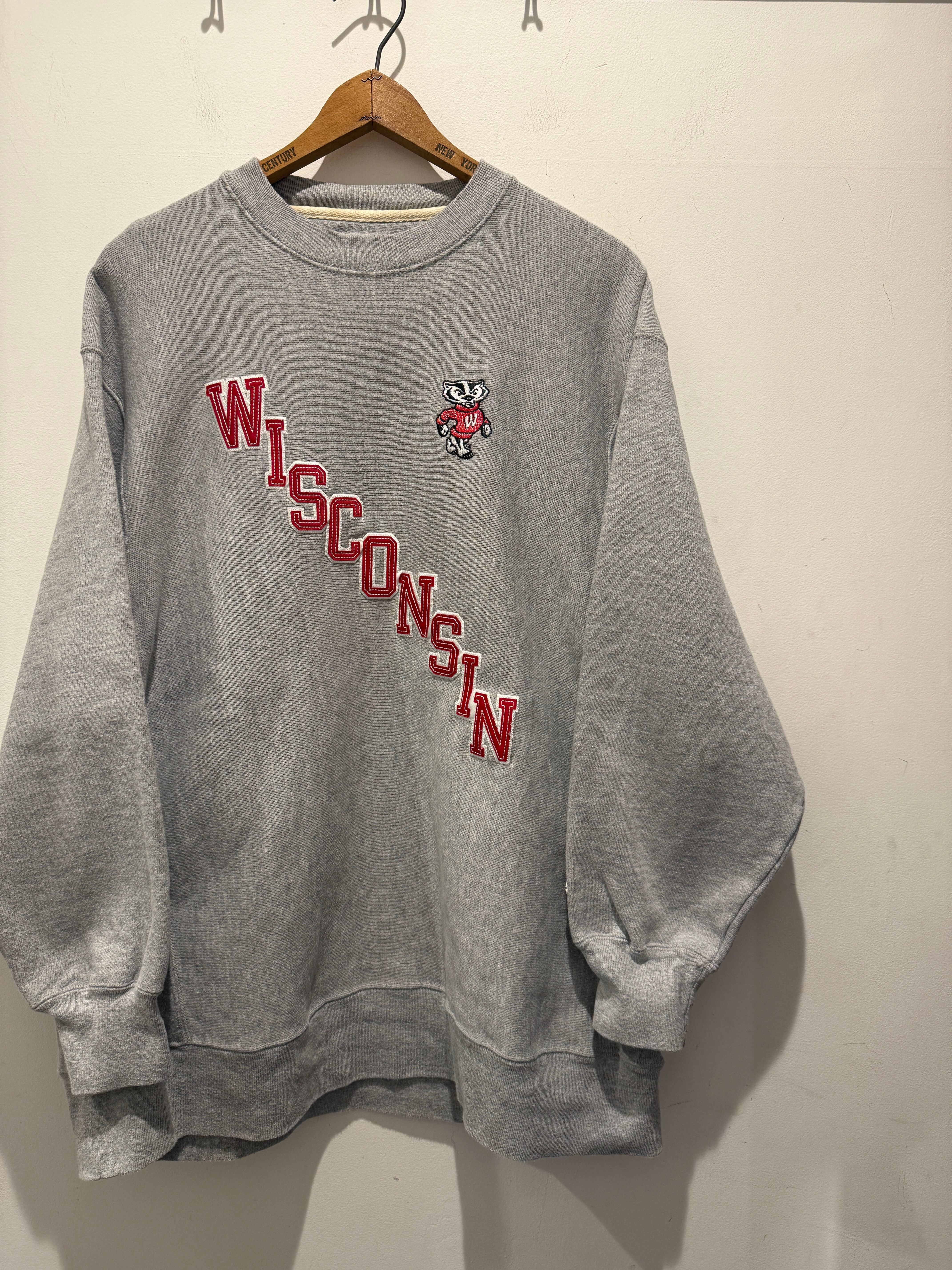 チャンピオンのプレミアムリバースウィーブスウェットです。2000年以降の物で上質な生地のプレミアムリバースウィーブ。こちらはブラックが多めの濃いグレーボディとなります。ウィスコンシンのカレッジ物となりますがパッチ&刺繍のデザインがあまり見ないパターンでバッキー君がデザインされているのもとても良いですね。コンディションも良くユニセックスでオススメなリバースです。