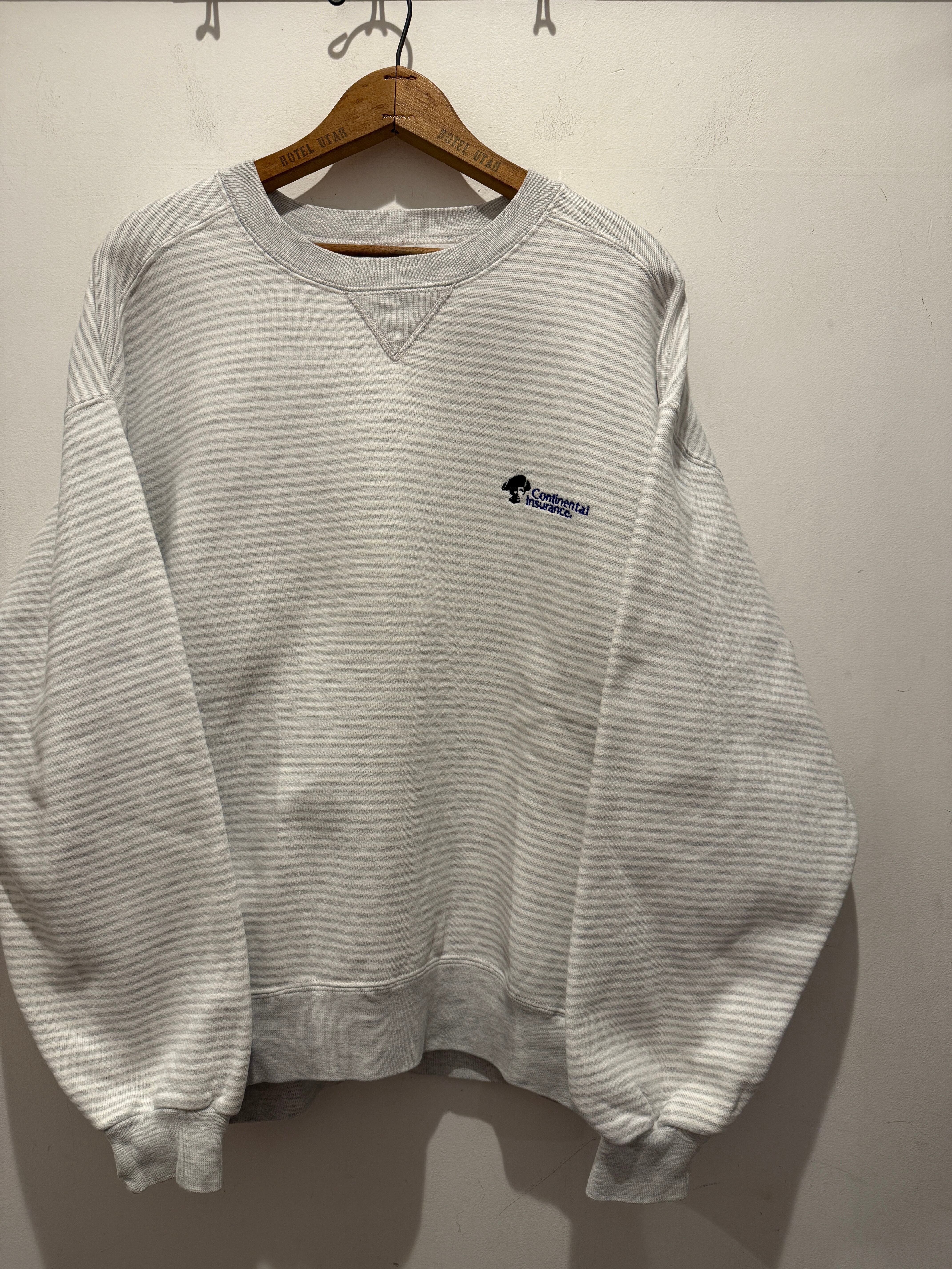 90年代アメリカ製ラッセルのスウェットです。ホワイト×グレーのボーダーパターンでHIGH Cottonシリーズと生地が肉厚なタイプとなります。企業系のワンポイント刺繍もアクセントになっていてあまり見ないボーダーパターンがとても良いですね。コンディションも良くユニセックスでオススメなスウェットです。