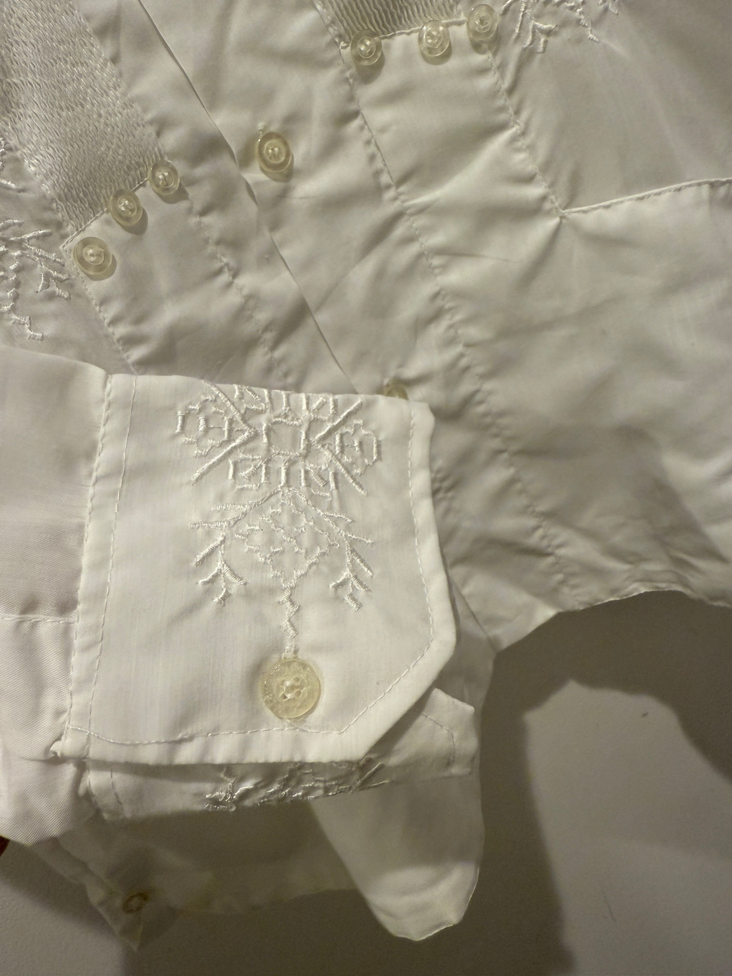 70年代の長袖白キューバシャツです。珍しい2つポケット仕様で袖にも豪華に刺繍がはいります。キューバシャツといえば半袖がほとんどですが、こちらは数少ない長袖のキューバシャツとなります。またライトブルーやイエローなどが多い印象ですがこちらはホワイトカラーなのもポイントですね。白ベースですがコンディションもとても良くユニセックスでオススメな1点です。