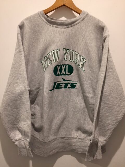 80年代のアメリカ製チャンピオンです。カラーはグレーで3段プリント仕様です。こちらはNFLのニューヨーク•ジェッツ物でアメフトのリバースウィーブはなかなか無く珍しいですね。コンディションの良いリバースは少なくなってきているので非常にオススメです。