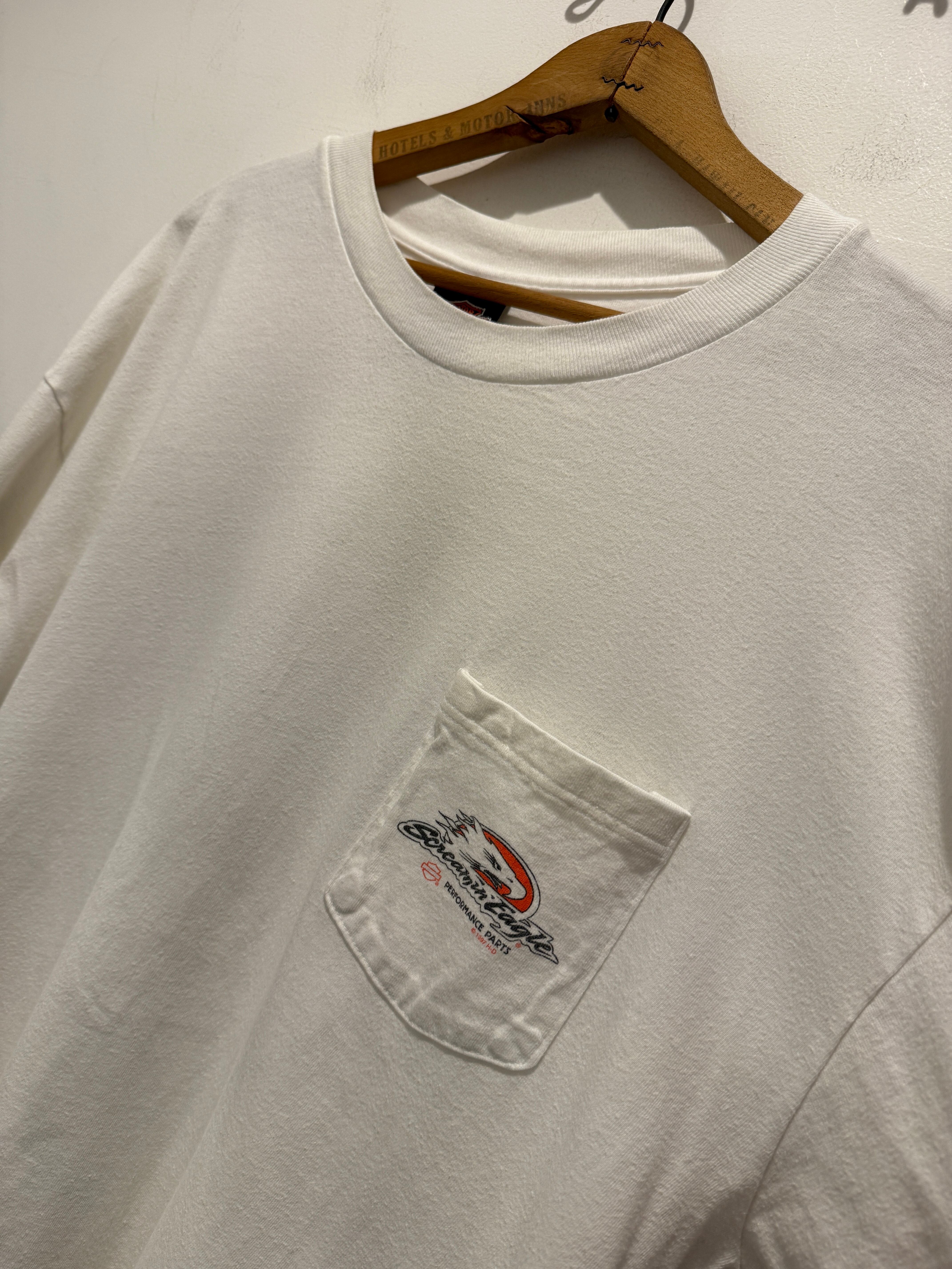 90年代アメリカ製のハーレーTシャツです。ハーレーTといえばブラックボディが多い中、こちらはホワイトボディとなります。フロントはイーグルプリントが入るポケット付きでバッグプリントがバイクとファイヤーフレイムスの車プリントととてもカッコイイ1着です。袖、裾ともにダブルステッチ仕様となります。ヘインズのBEEFYボディでアメリカ製とオススメなTシャツです。