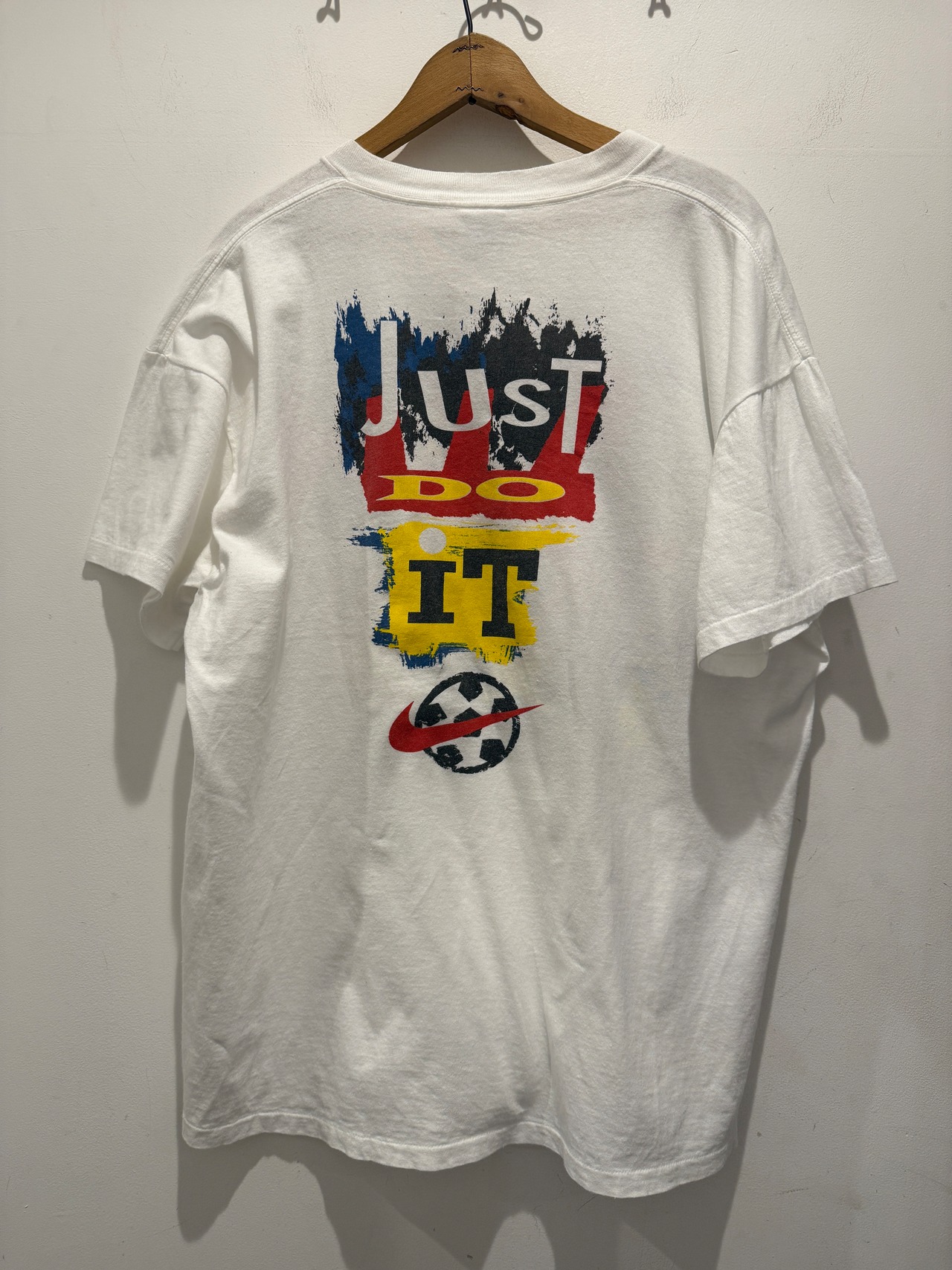 90年代アメリカ製ナイキのTシャツです。白ボディにフロントとバッグにプリントが入るインパクトある1着です。90年代らしいプリントのカラーリングとサッカーモチーフなのが最高ですね。袖、裾共にシングルステッチとなります。コットン100%のアメリカ製とユニセックスでオススメなTシャツです。
