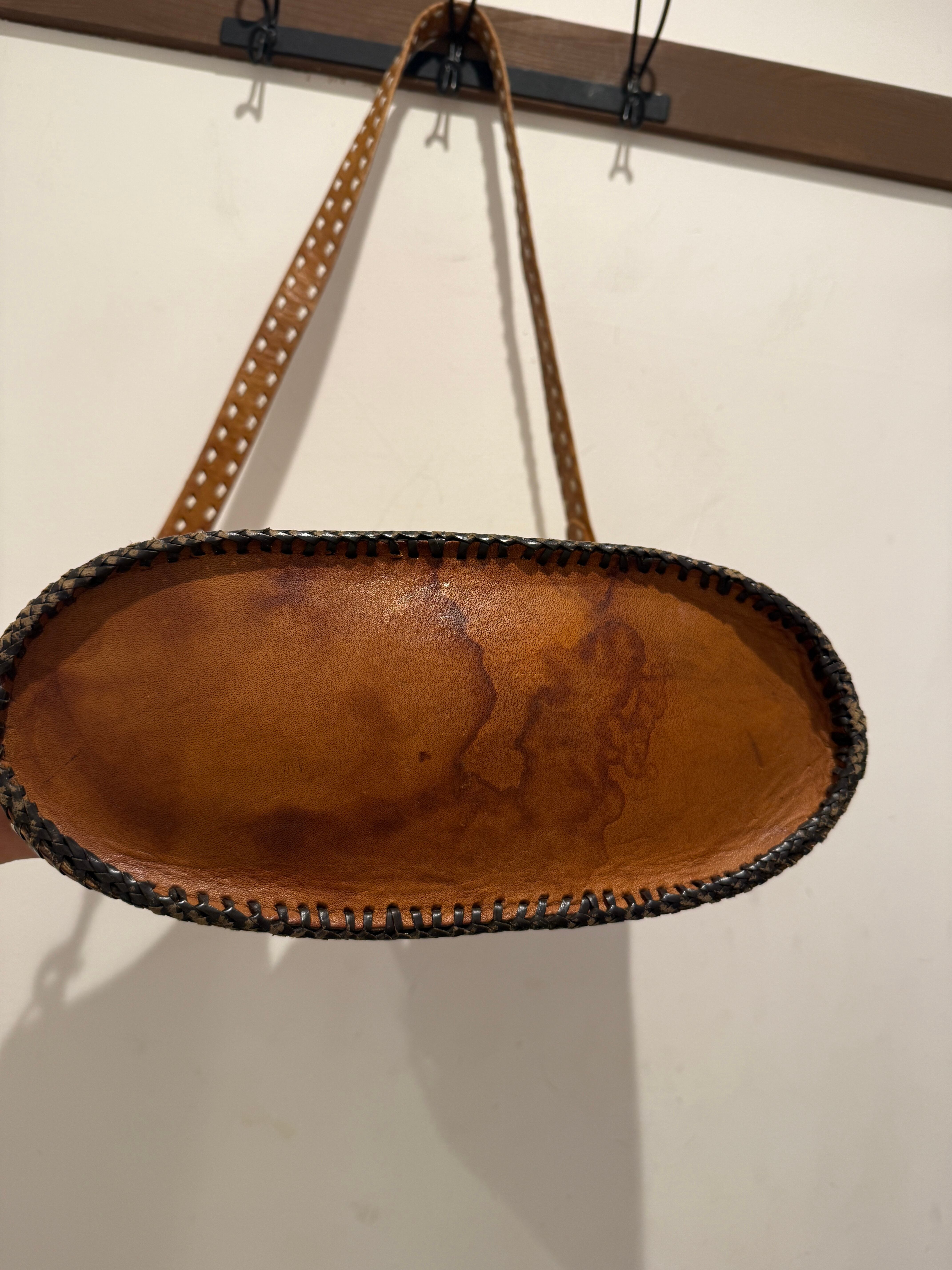 70年代ビンテージのレザー2Wayバッグです。フラワー柄の型押しやハンドステッチもレザーと細かいところもしっかりした作りとなっています。また犬のデザインが前後で変わるのも面白いですね。中のジップポケットはブラス製のTEEジッパーが使われております。ショルダーバッグとしても使えますし、ベルトレザーを外すとハンドバッグとしも使えてオススメです。