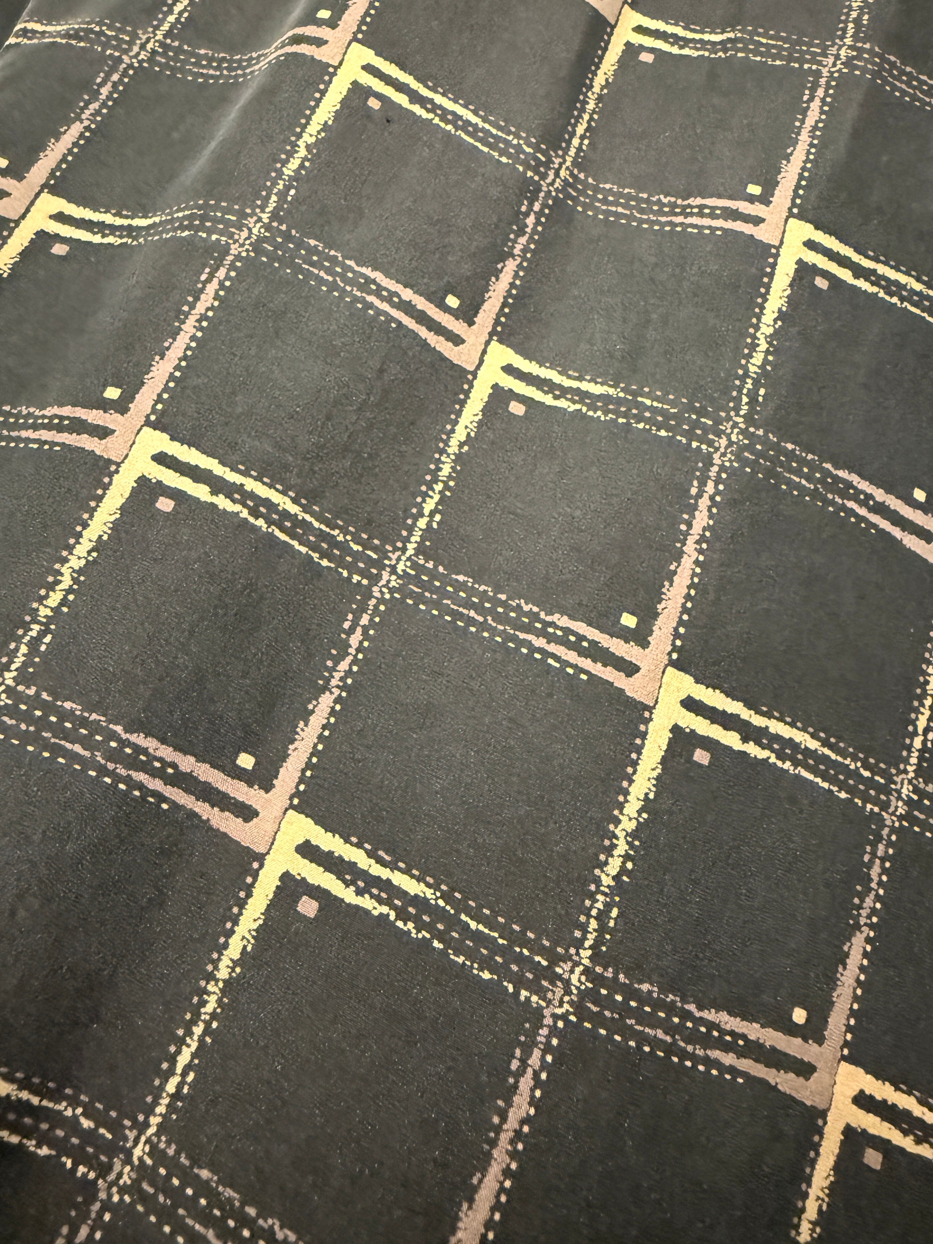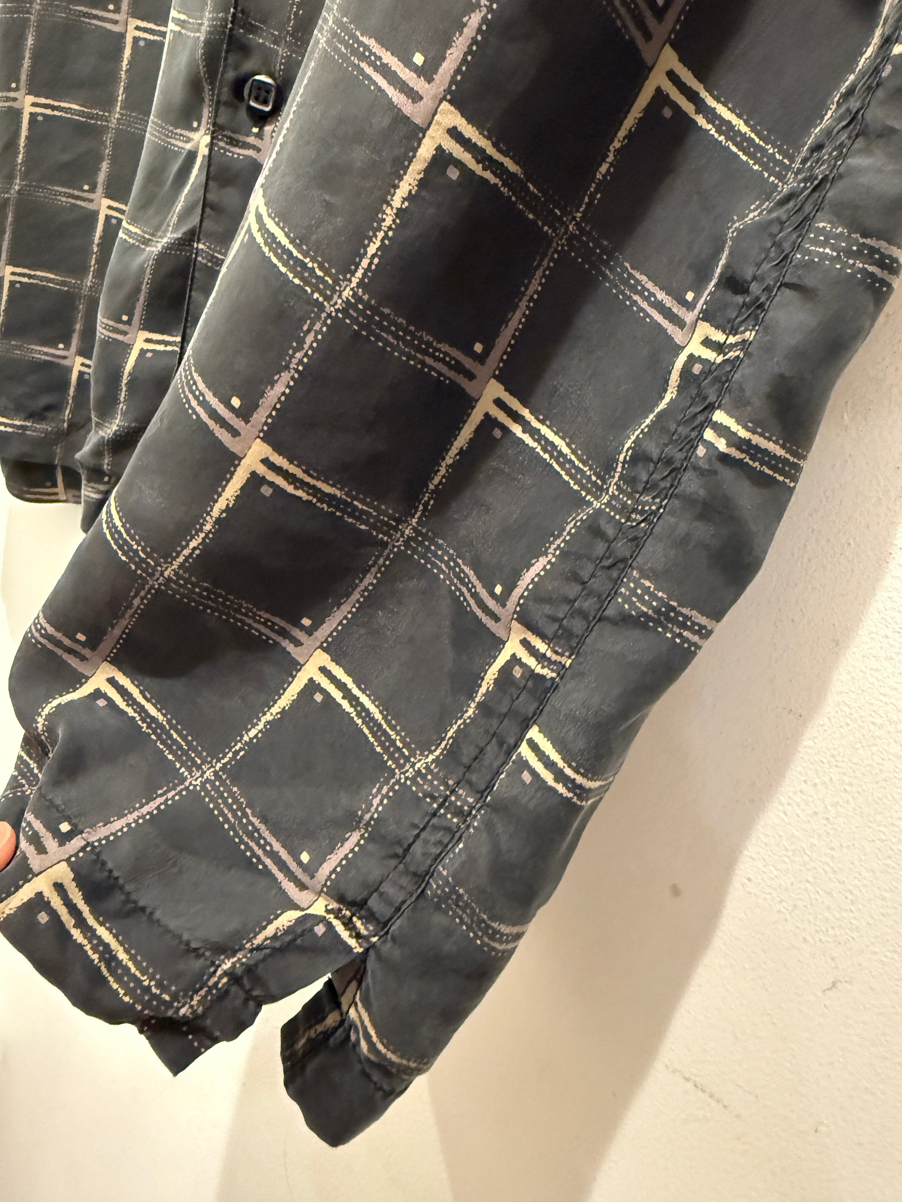 90年代のデザイン半袖シルクシャツです。ブラックベースにチェック柄の様なブロック状の総柄がお洒落なデザインです。ボタンも丸の中に四角いデザインと細かい所も良い感じですね。シルク100%と質感も良く着てて気持ちの良いシャツとユニセックスでオススメです。