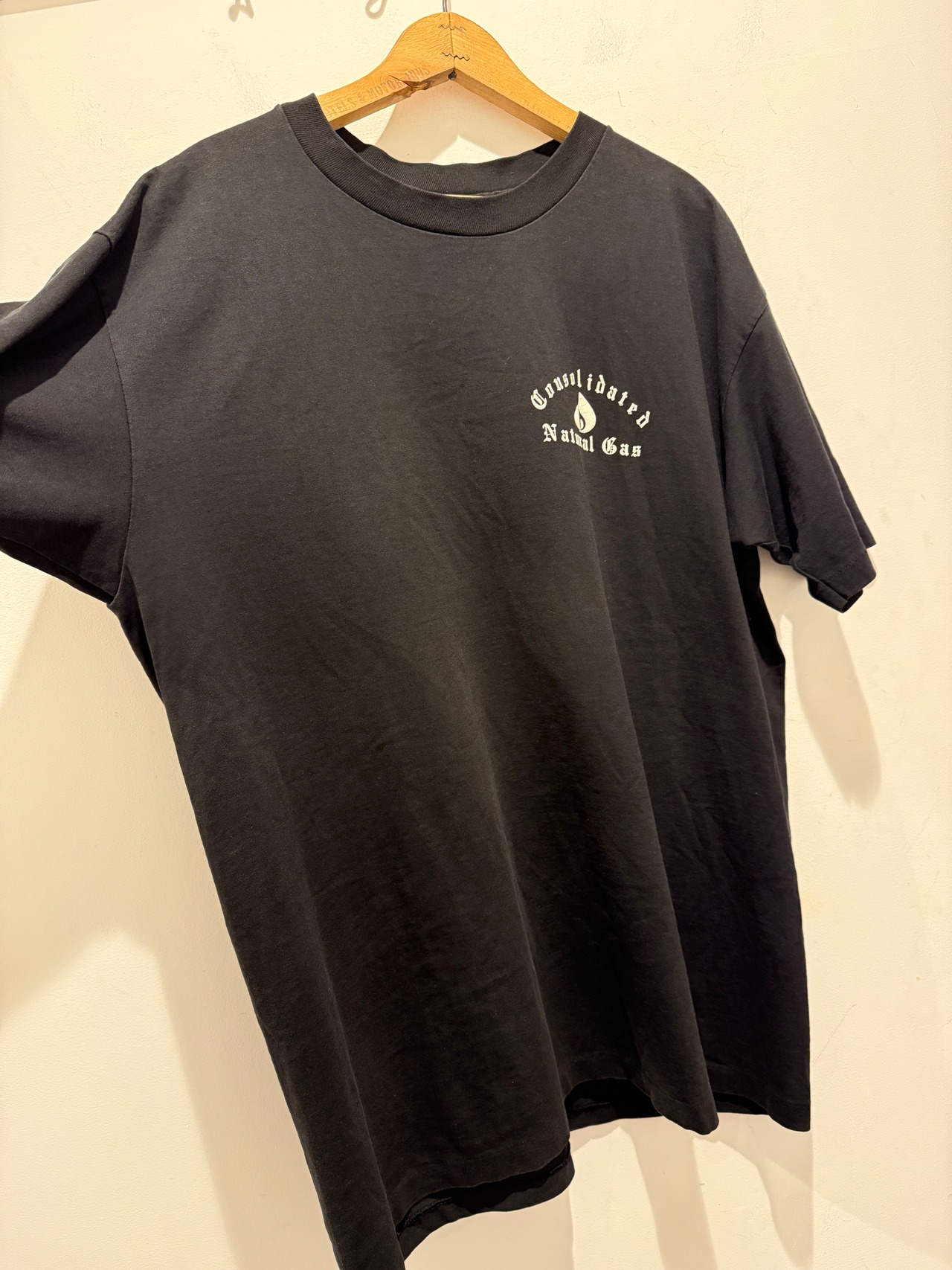 80年代〜90年代アメリカ製ヘインズのTシャツです。ブラックボディで胸にプリントが入るシンプルなTシャツです。アメリカの天然ガス会社の制服だったと思われる1着ですがオールドイングリッシュの書体と企業物でとてもカッコイイですね。袖、裾共にシングルステッチとなります。コンディションも良くシンプルでオススメなTシャツです。
