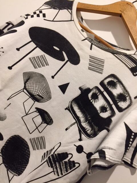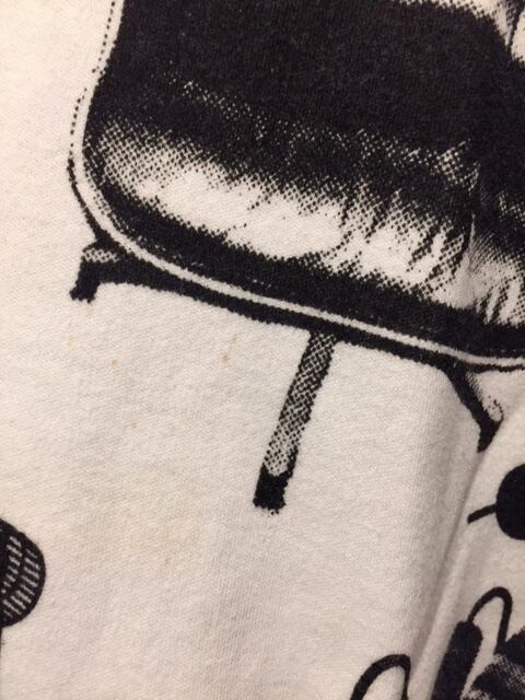 Used商品では希少な白ボディのTシャツです。ミッドセンチュリーのデザインでイームズなどの家具など大変オシャレな1着です。総柄なので1枚でも存在感があり際立ちますね。なかなか出てこないのでお好きな方にはオススメです。