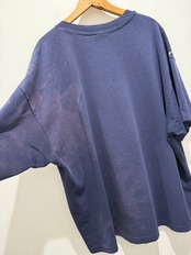 90年代ヘインズのプリントTシャツです。フェードしたネイビーボディにBLUE DEVILとデビルプリントがとてもカッコイイ1着です。身幅たっぷりで着丈短めのボックスシルエットも最高ですね。袖、裾共にシングルステッチとなります。フェードした茄子紺カラーとペンキの雰囲気も良くオススメなTシャツです。