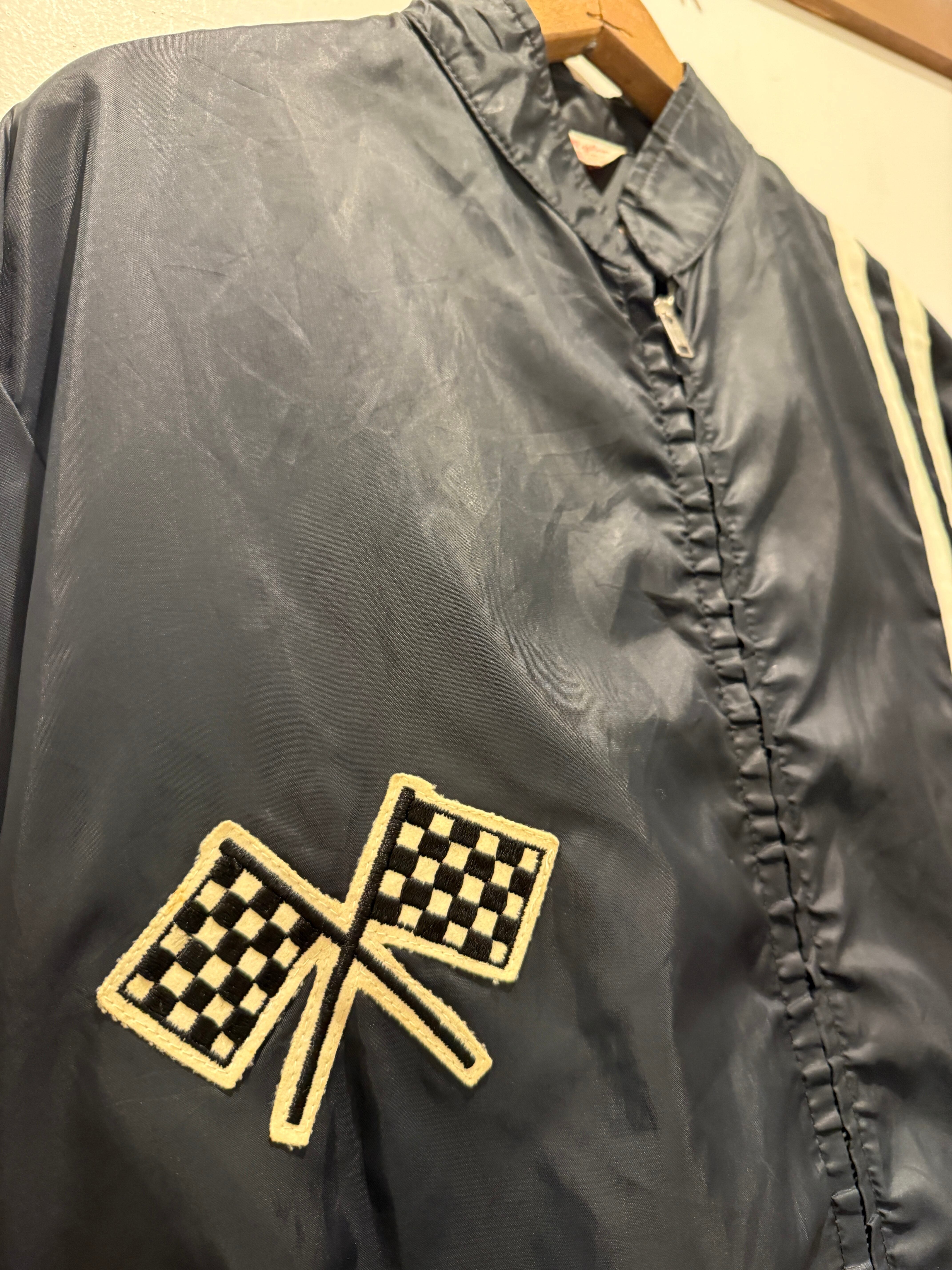 60年代〜70年代アメリカ製のレーシングジャケットです。ダークネイビーカラーで白の2本ラインとチェッカーフラッグのワッペンとシンプルですがとても格好良い1着です。ジッパーもSERVALの片爪めのアルミジッパーと最高ですね。身幅も広く着丈短めのボックスシルエットと形も良くオススメです。