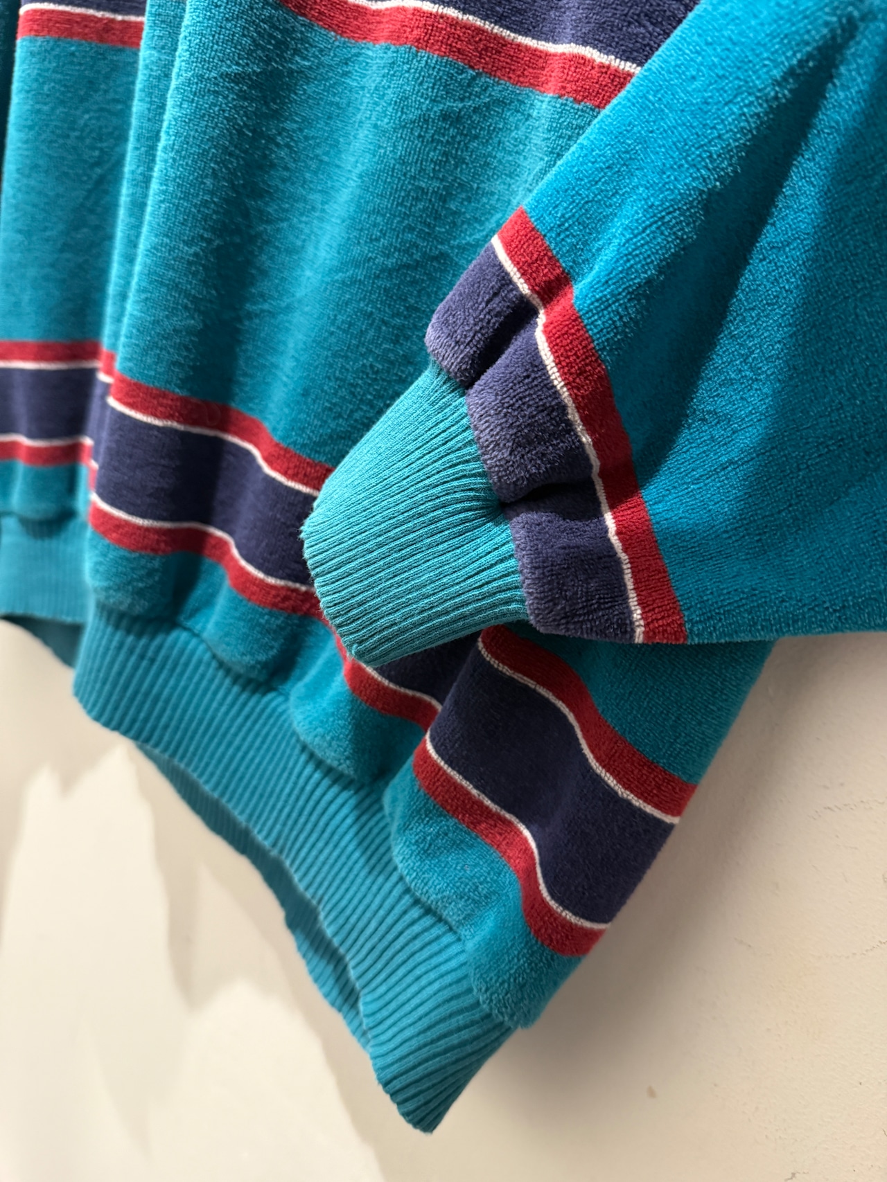 80年代アメリカ製のボーダーパイルスウェットです。珍しいパイル地のスウェットでボーダーパターンがとても良い1着です。首リブも二重になっていて身幅も広く大きめなサイズ感なのもポイントですね。しっかりアメリカ製のアイテムとオススメです。