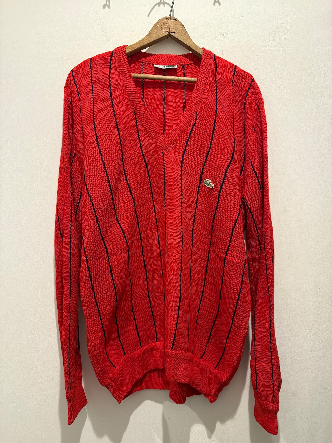 70年代フランス製ラコステのコットンニットです。赤ベースにネイビーのストライプが入りVネック仕様となります。無地が多い中、ストライプが入るデザインは珍しいですね。またアクリル素材が多い中、こちらはコットン100%なのも珍しくユニセックスでオススメなアイテムです。