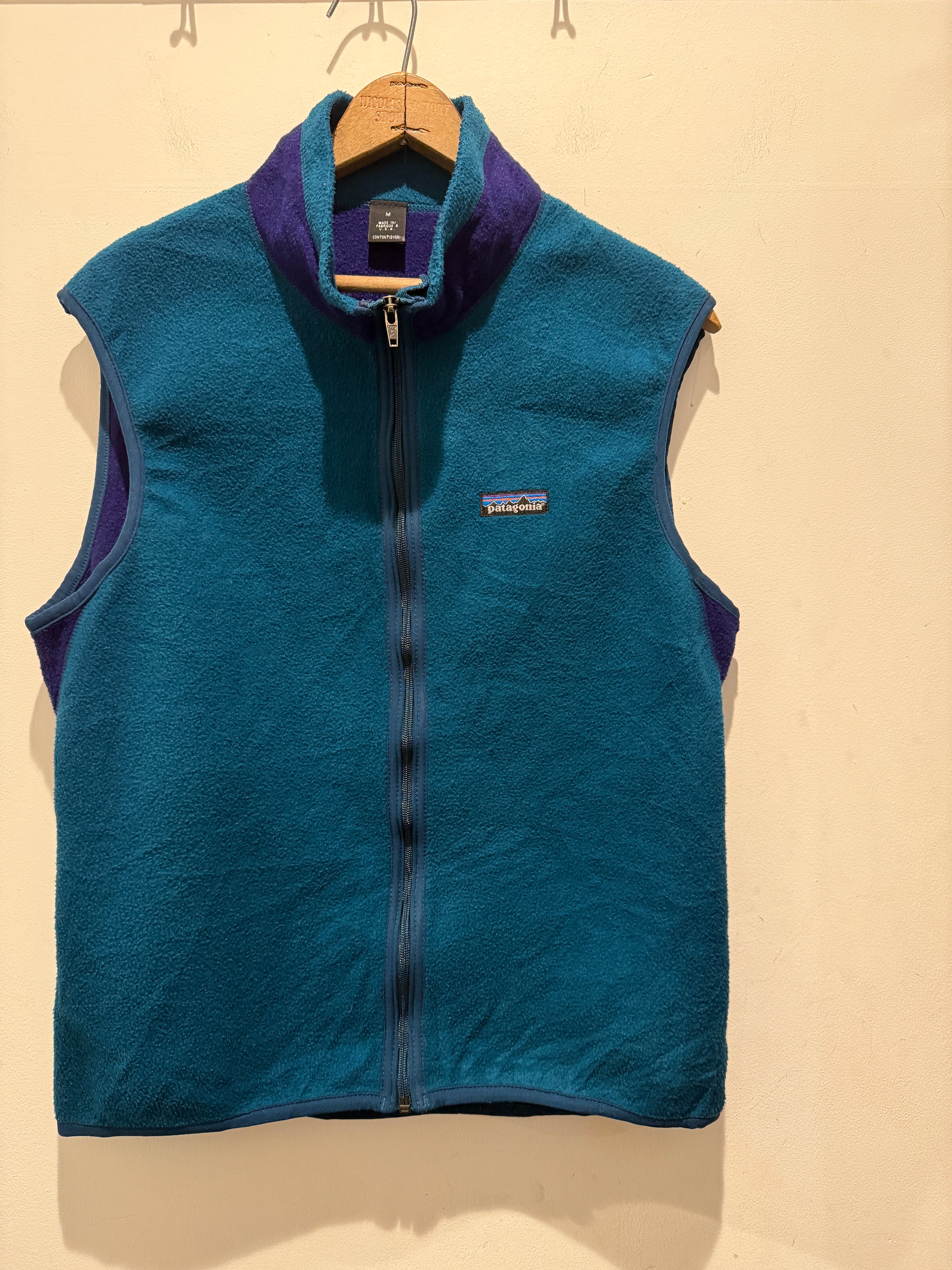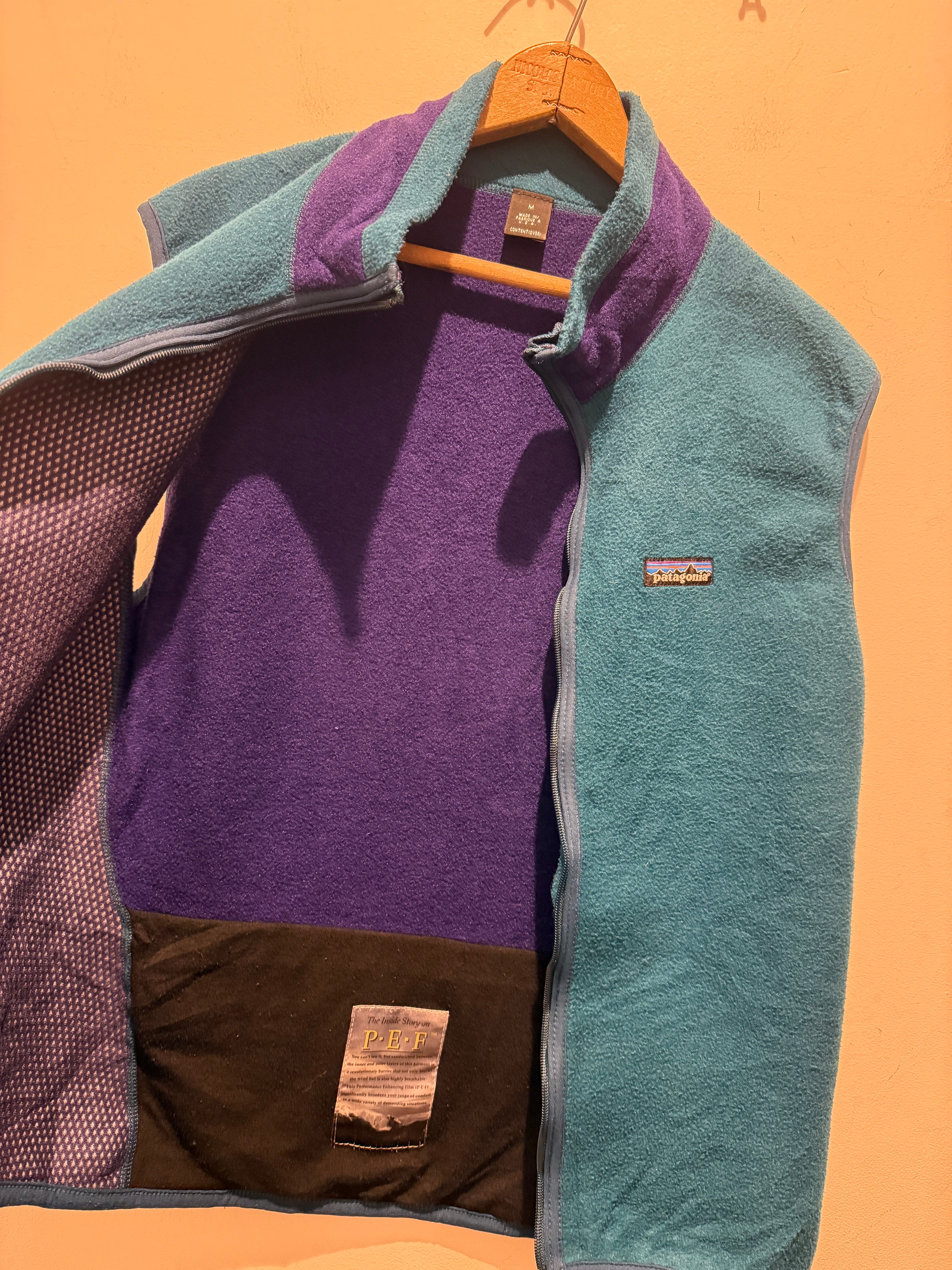 90年代アメリカ製パタゴニアのフリースベストです。フロントがグリーンでバッグが濃いパープルのツートン仕様となります。またバッグにジップポケットがあるのがとても良いですね。1995年製のパタゴニアで古いレトロXに良く採用されているP・E・Fが使われています。アメリカ製のパタゴニアでサイズの合う方にはオススメなアイテムです。
