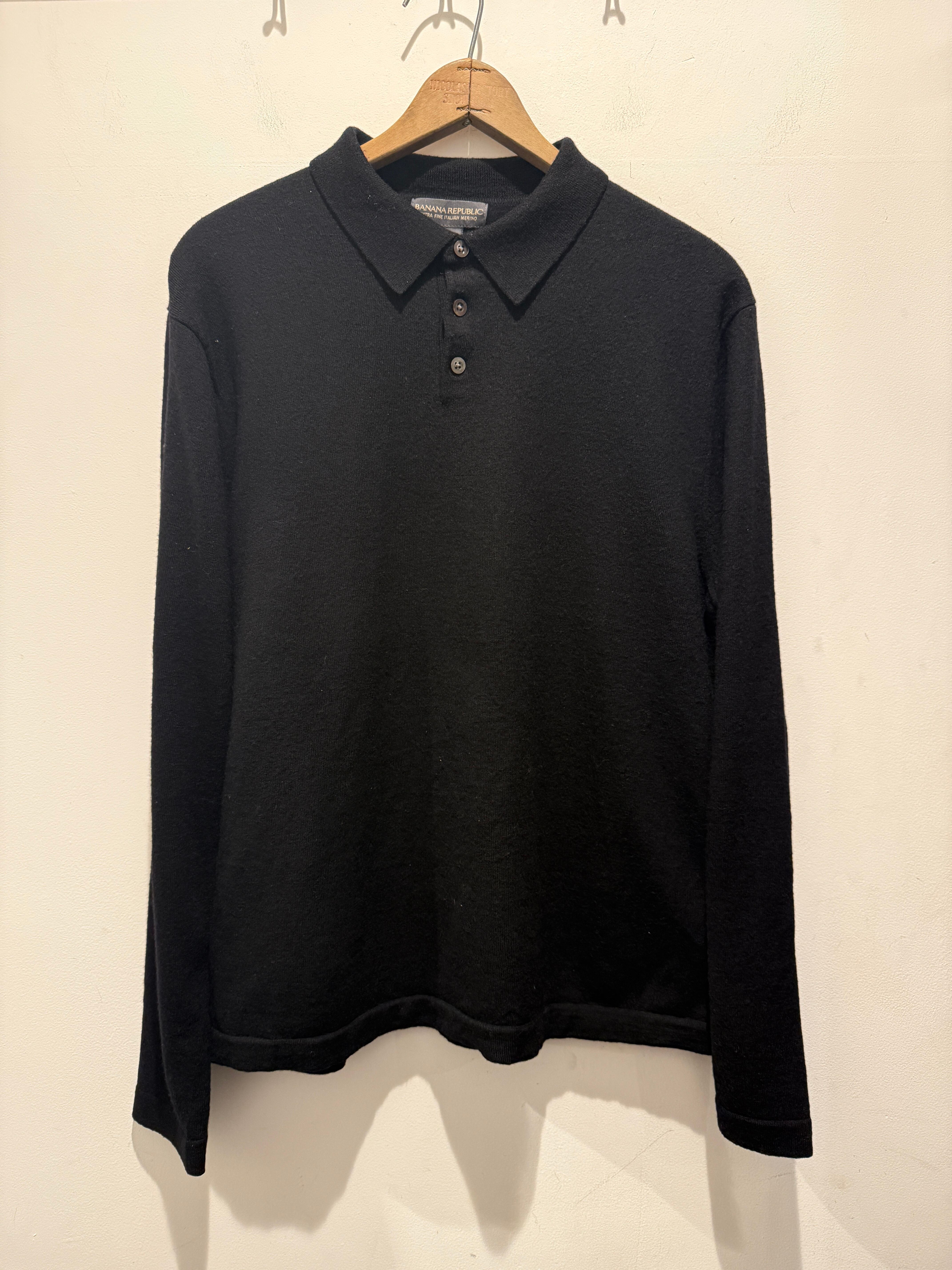 2000年代バナナリパブリックのブラックニットです。ブラックカラーで襟付きのタイプとなります。EXTRA FINE ITALIAN MERINO WOOLと生地感がとても良く上質な1着となります。2002年製造の物でボタンも良い感じのを使ってますね。着丈が短めなシルエットも良く、ユニセックスでオススメなニットです。