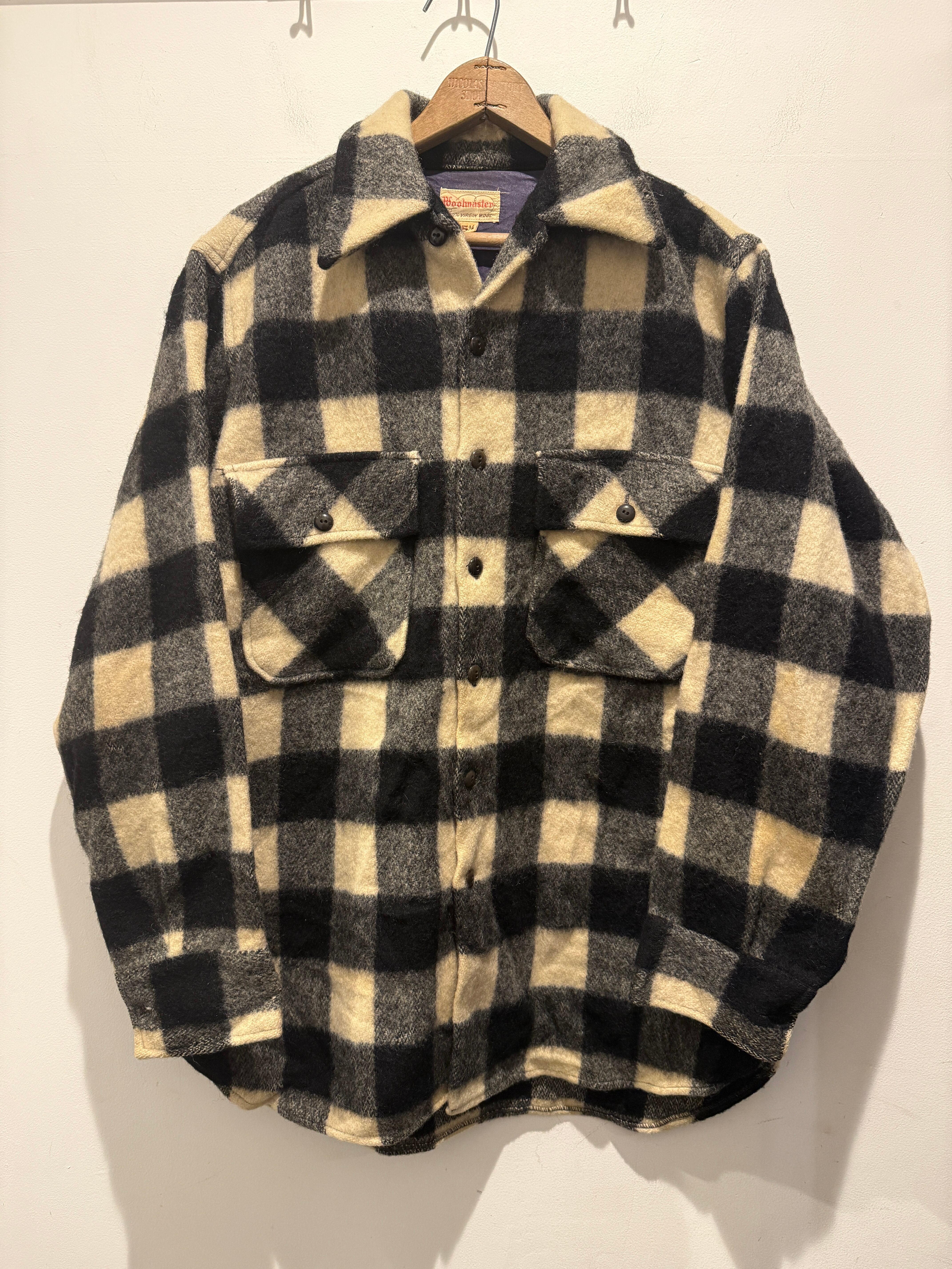 50年代ヴィンテージウールマスターのウールジャケットです。ブラック×オフホワイトのバッファローチェックでとても良い配色です。2つ穴の古いボタンでタグもオールドイングリッシュなのが最高ですね。縮みも無く、形も整っていてオススメなアイテムです。