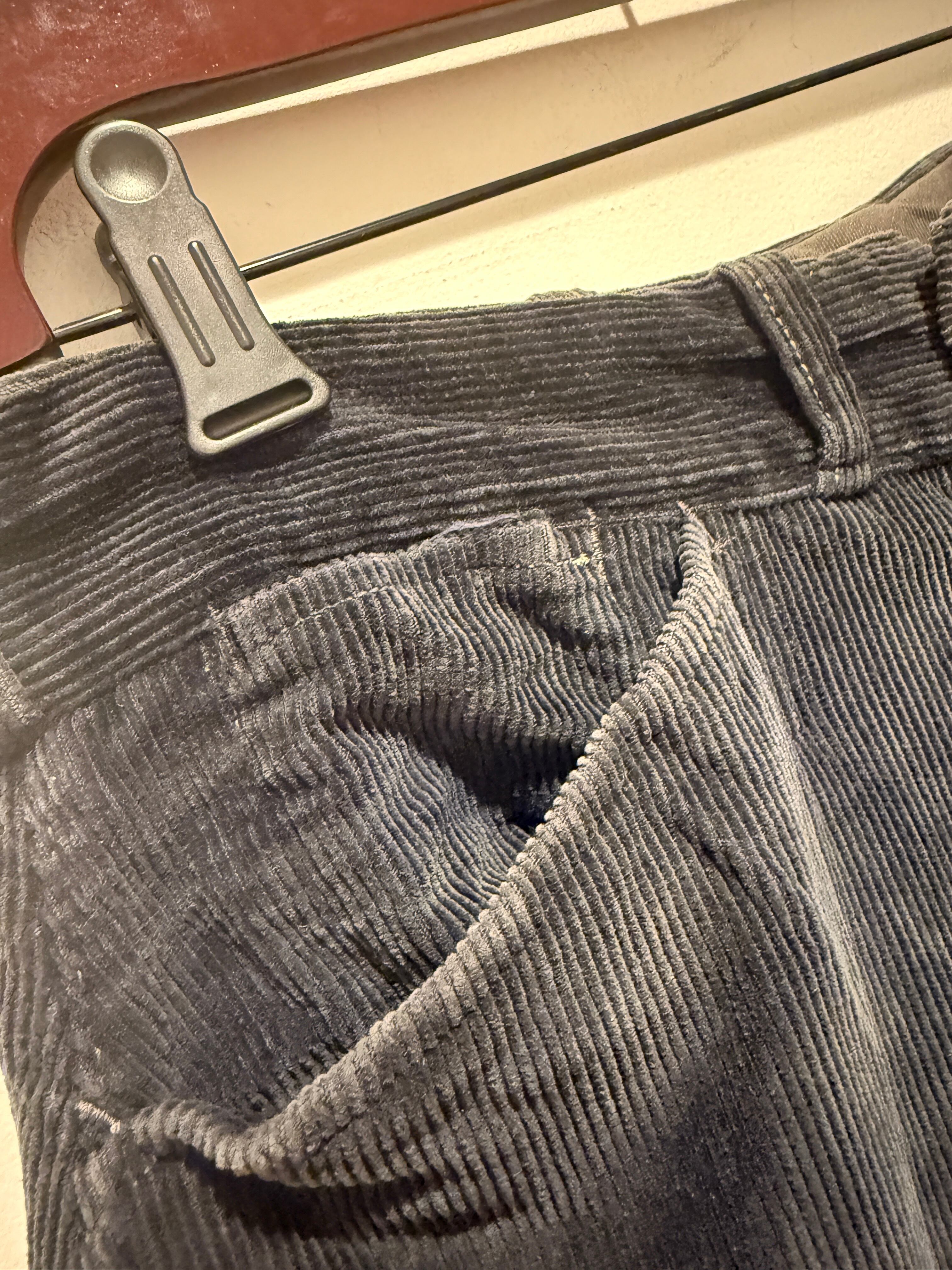 50年代〜60年代ヴィンテージのコーデュロイジョッパーズパンツです。ブラックコーデュロイでボタンフライとなります。タグはありませんがスレーキスタンプがあり、ファイブブラザーのウィップコードのスタンプと同じのが付くのでアメリカ製の物と考えられます。古いブラックコーズで内側の当て布なども古いブラックコットンと雰囲気も良くオススメなパンツです。
