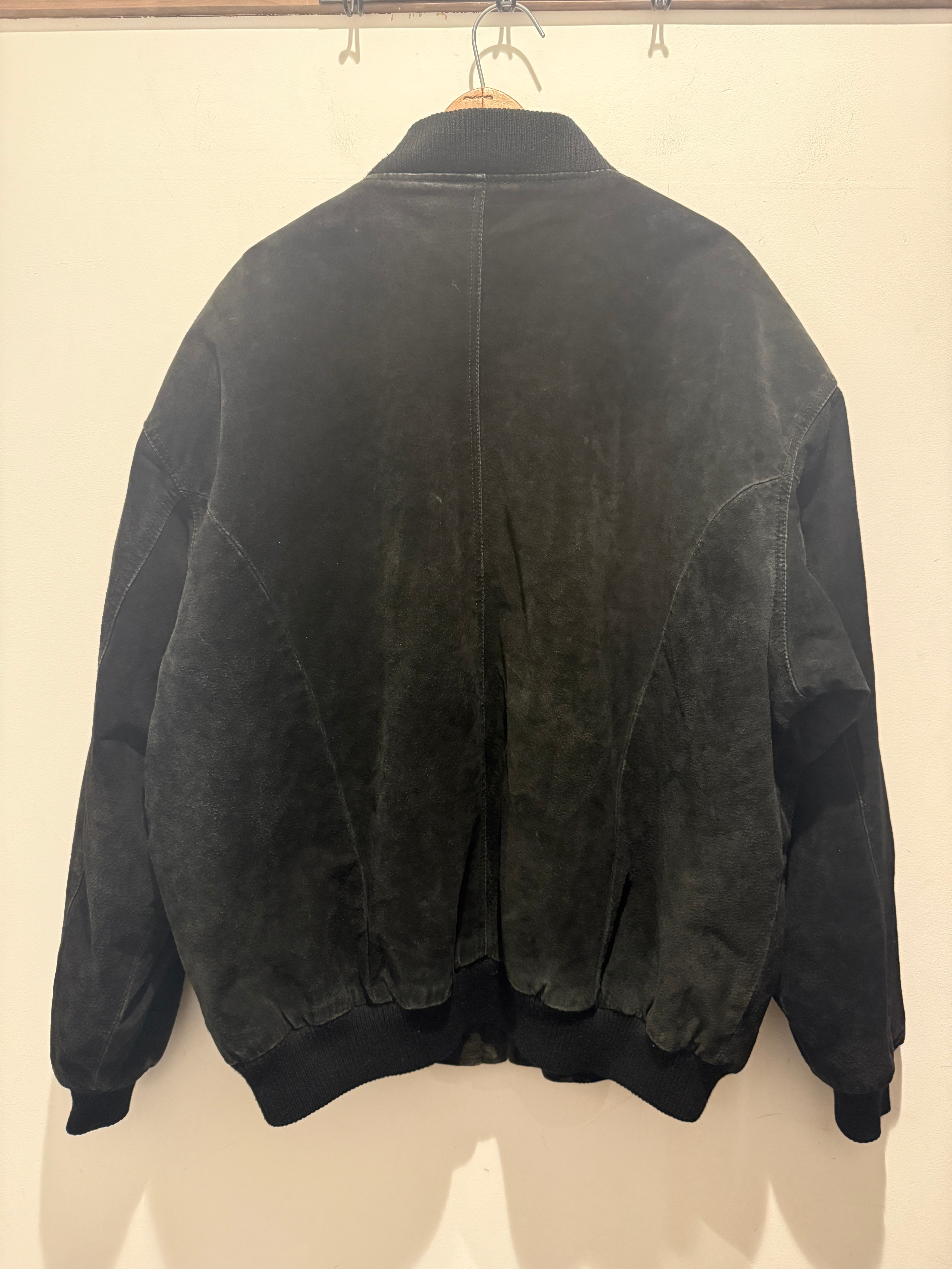90年代のブラックレザージャケットです。ブラックのレザーでボンバージャケットタイプとなります。ジッパーはブラスのYKKで裏地はキルティング仕様と着用しやすくなっています。デザインがミリタリー のMA-1に近く、身幅広めのボックスシルエットとオススメな1着です。