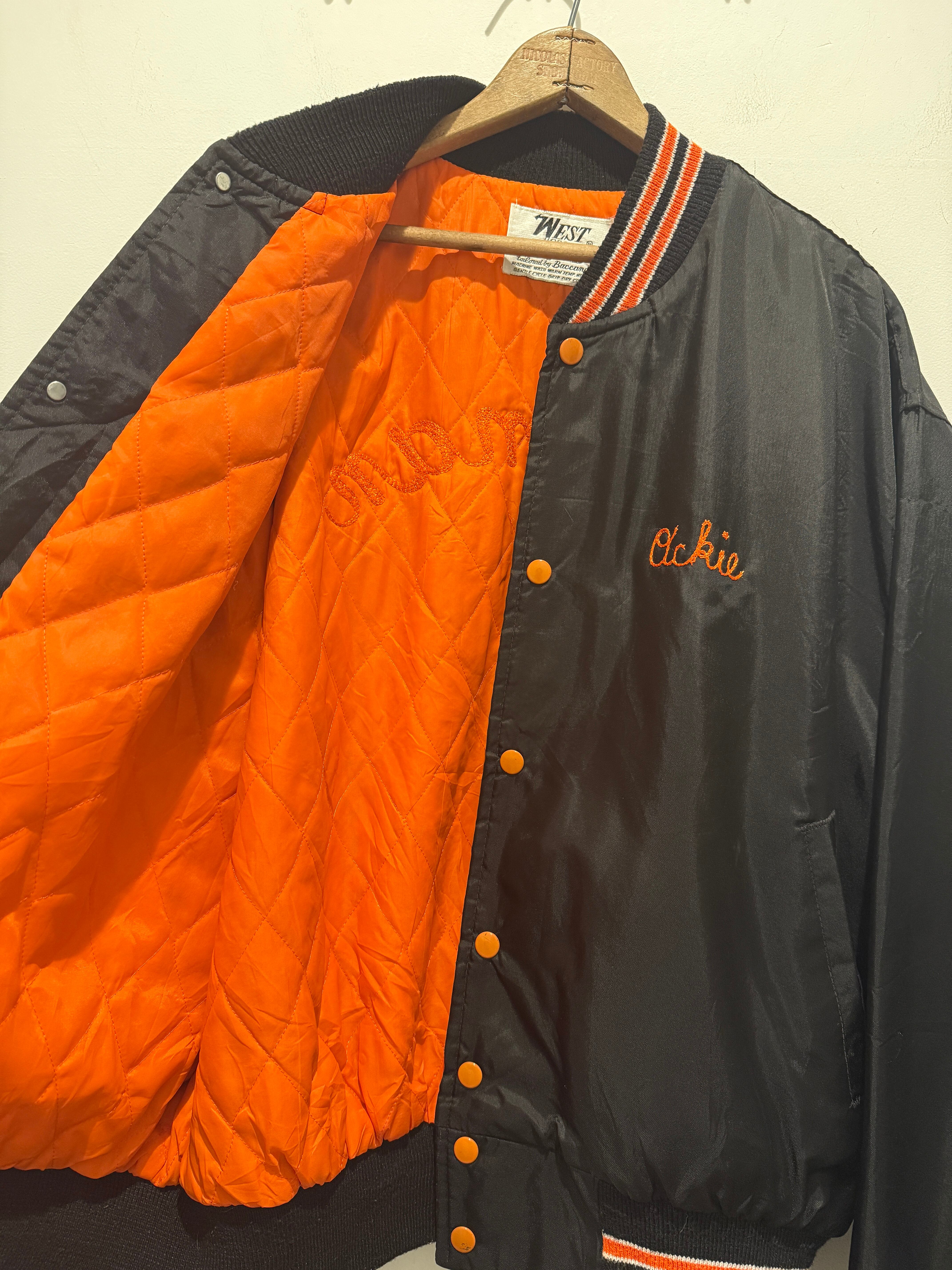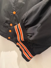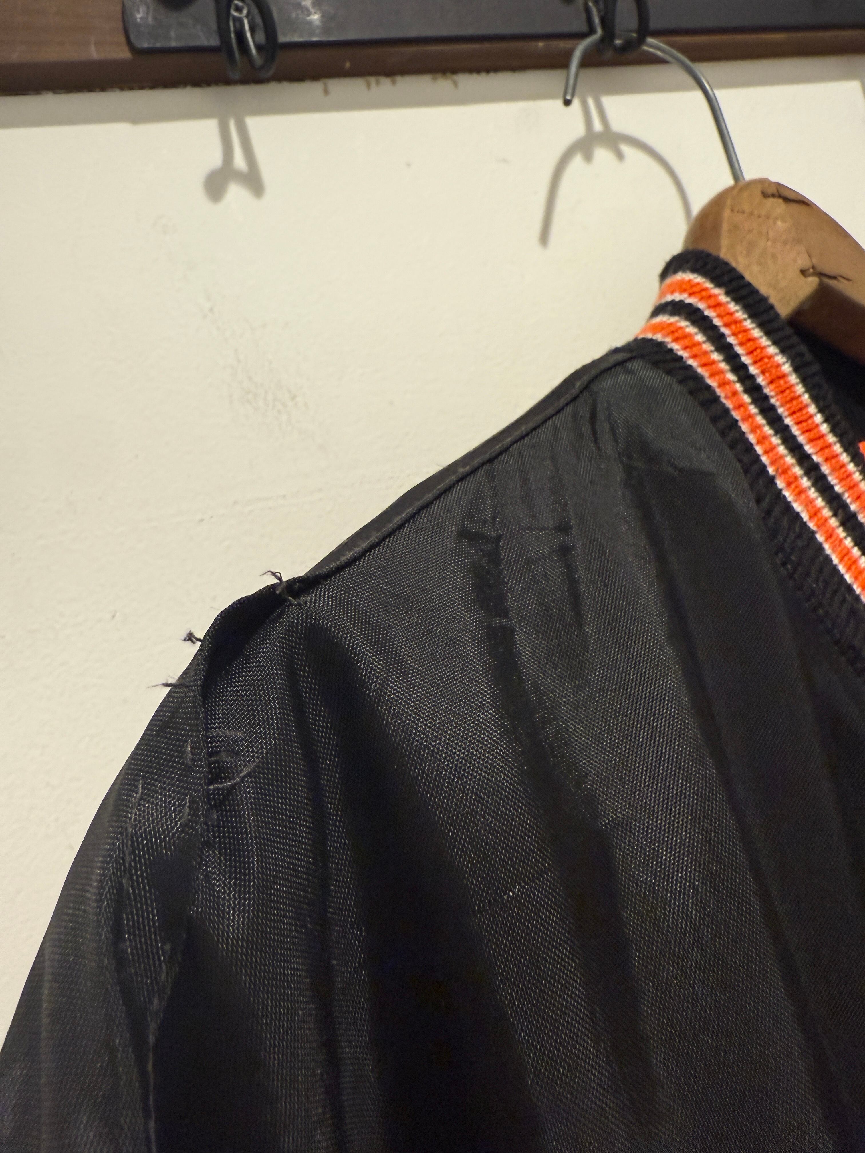 80年代のナイロンスタジャンです。ブラックボディにオレンジのチェーンステッチがフロントとバッグに入り格好良い1着です。ブラック×オレンジの配色もとても良いですね。裏地もキルティング仕様で暖かさもあり、着丈短めなシルエットとオススメなアイテムです。