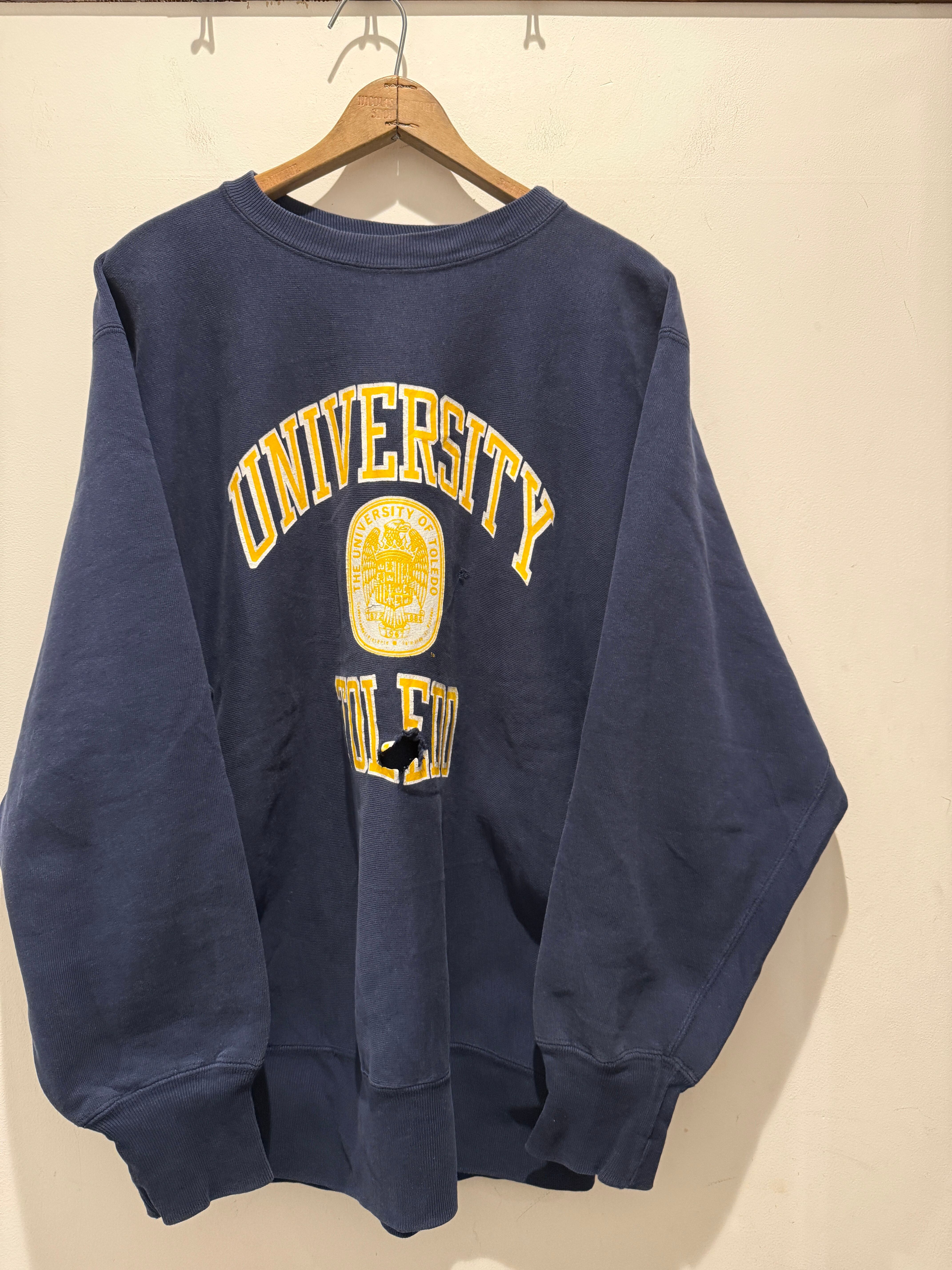 90年代アメリカ製チャンピオンのリバースウィーブです。刺繍タグが付く90年代の物でしっかりアメリカ製のリバースとなります。ネイビーカラーでフロントにダメージがありますが中にTシャツやサーマルなどレイヤードを楽しんでも面白いですね。フェードしたネイビーボディの雰囲気も良くダメージ系が気にならない方にはオススメな1着です。