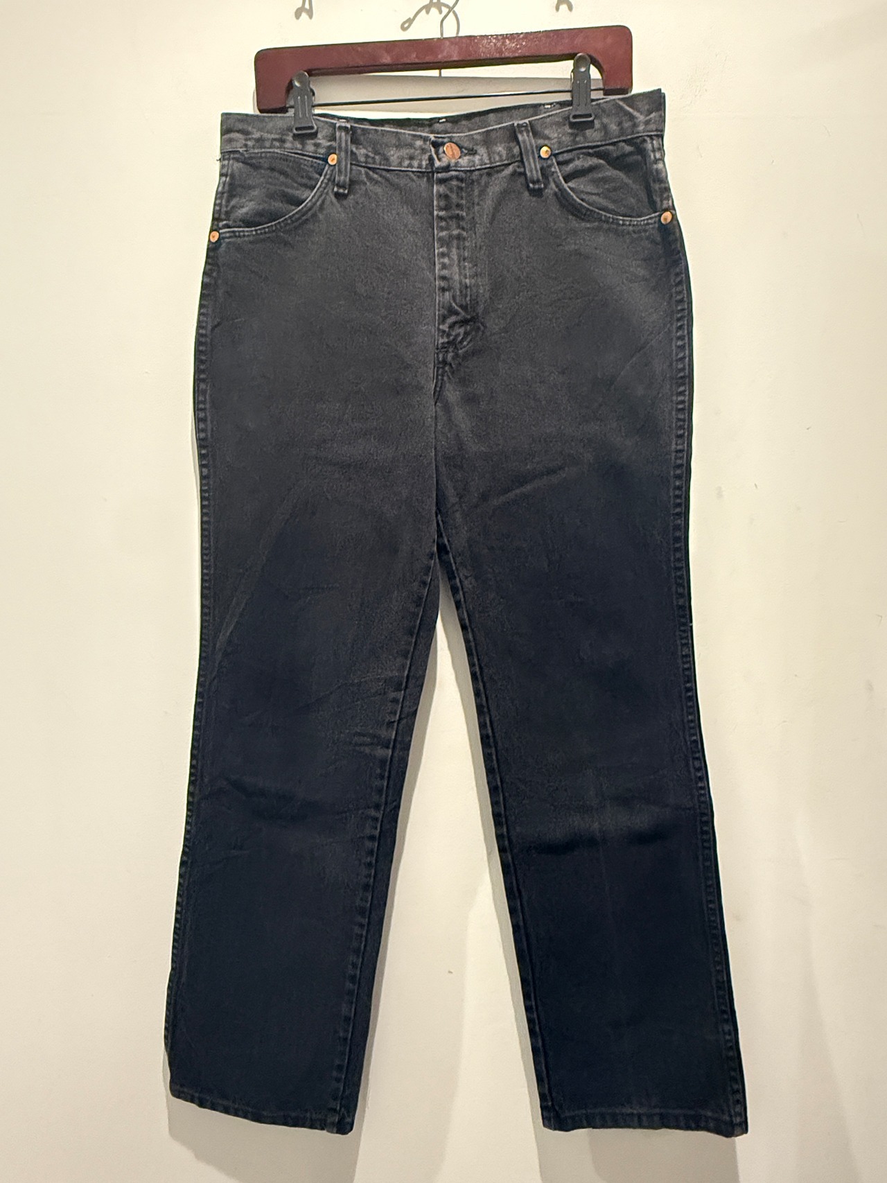 2000年代ラングラーのブラックデニムパンツです。ラングラーといえばリーバイス501に近いシルエットの13MWZが有名ですが、こちらはそれよりスリムなシルエットとなります。アメリカ製直後のアメリカ生地のメキシコ製なのもアメリカ製と変わらない感じで良いですね。実寸W33×L30とサイズ感も良くオススメなブラックデニムです。