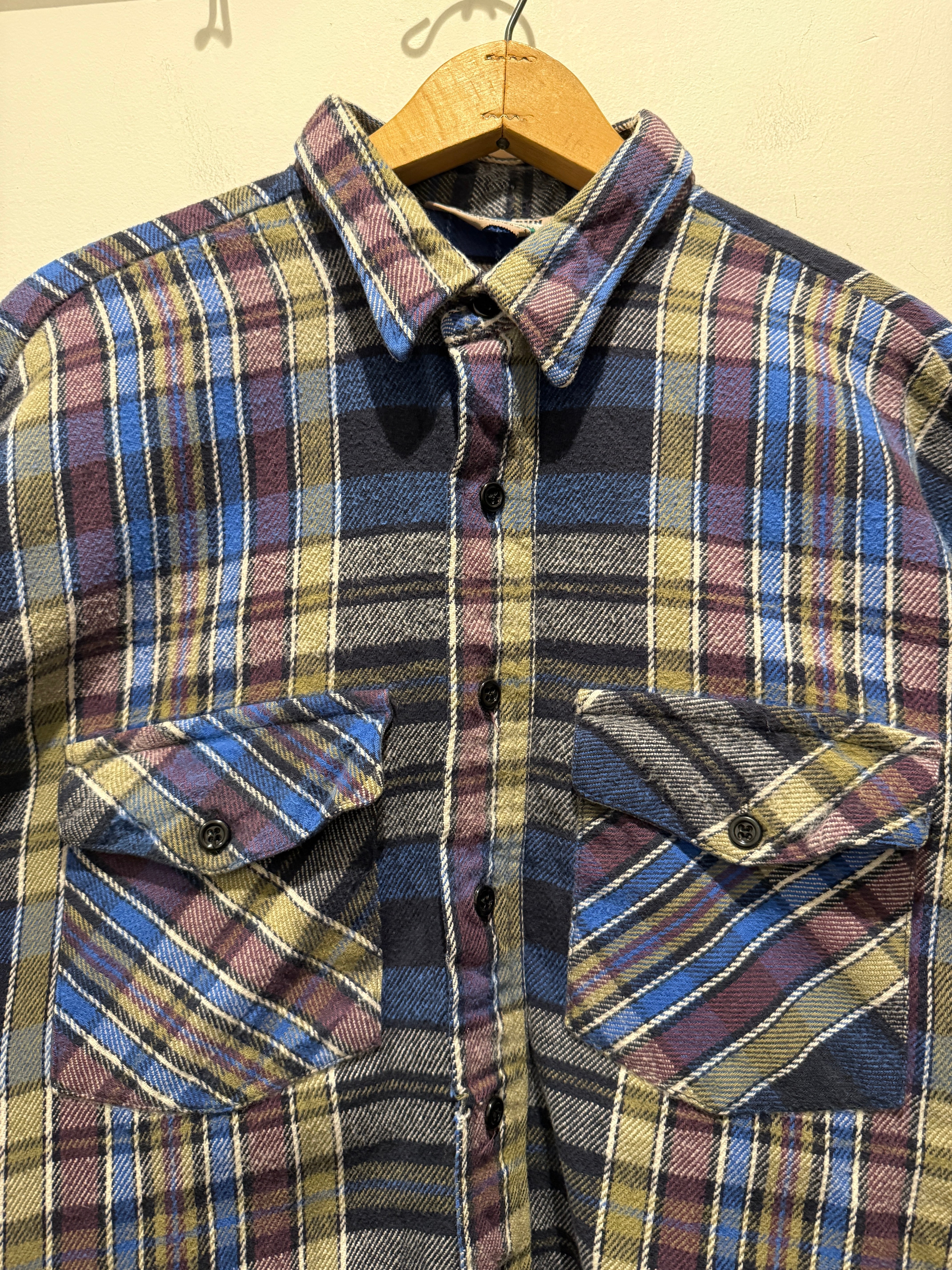 70年代〜80年代アメリカ製ウインターランのネルシャツです。パープル・ブルー・ブラックなどのカラーが入る良い配色のネルシャツです。フラップ付きポケットでボタンがブラックなのも最高ですね。そしてXLと大きめなサイズ感のネルシャツとオススメな1着です。