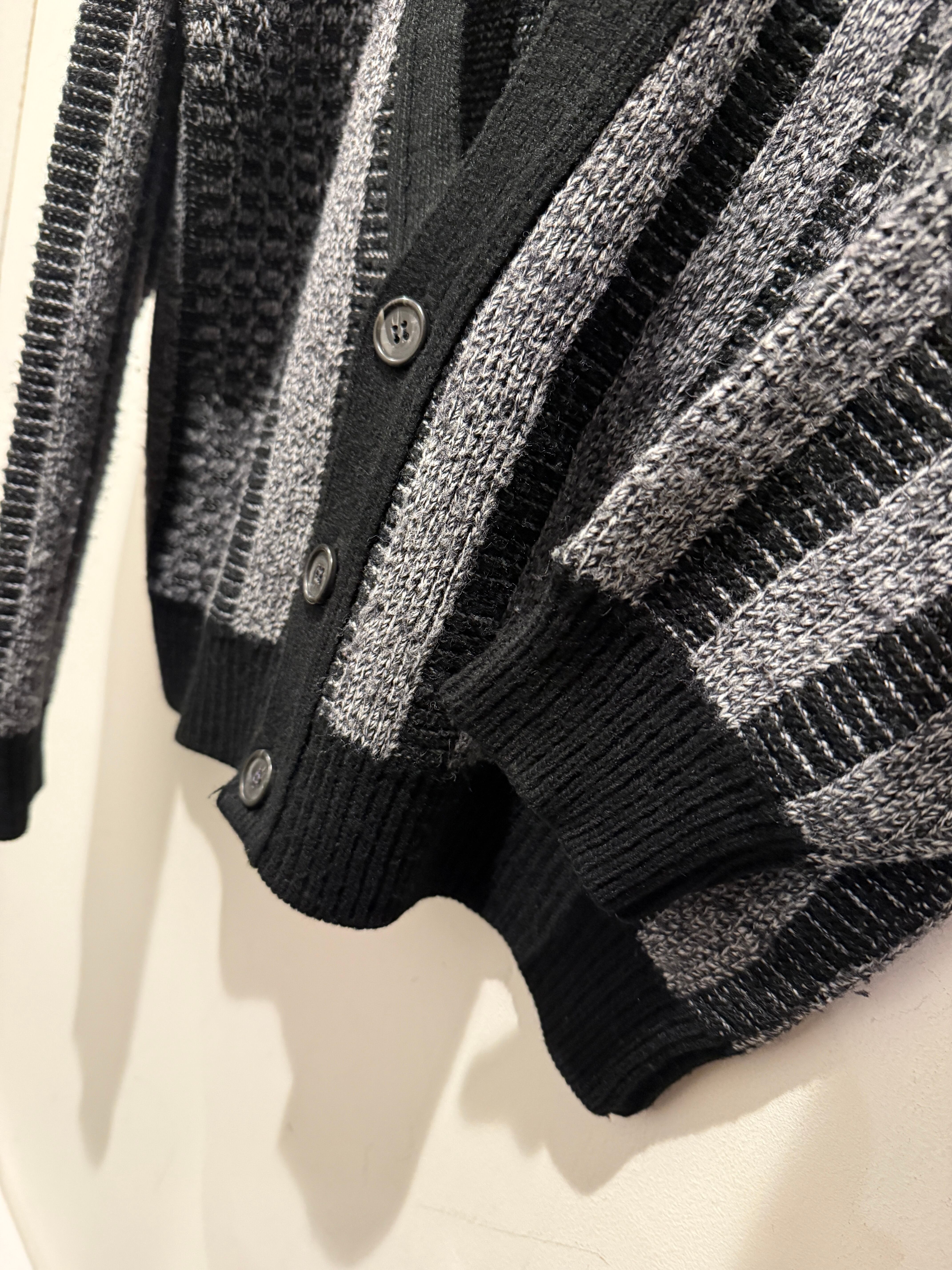 80年代アメリカ製ジャンセンのニットカーディガンです。ブラック×グレーのモノトーンカラーがとても良い1着です。身幅もしっかりあって着丈短めなボックスシルエットなのも最高ですね。コンディションも良くユニセックスでオススメなアイテムです。