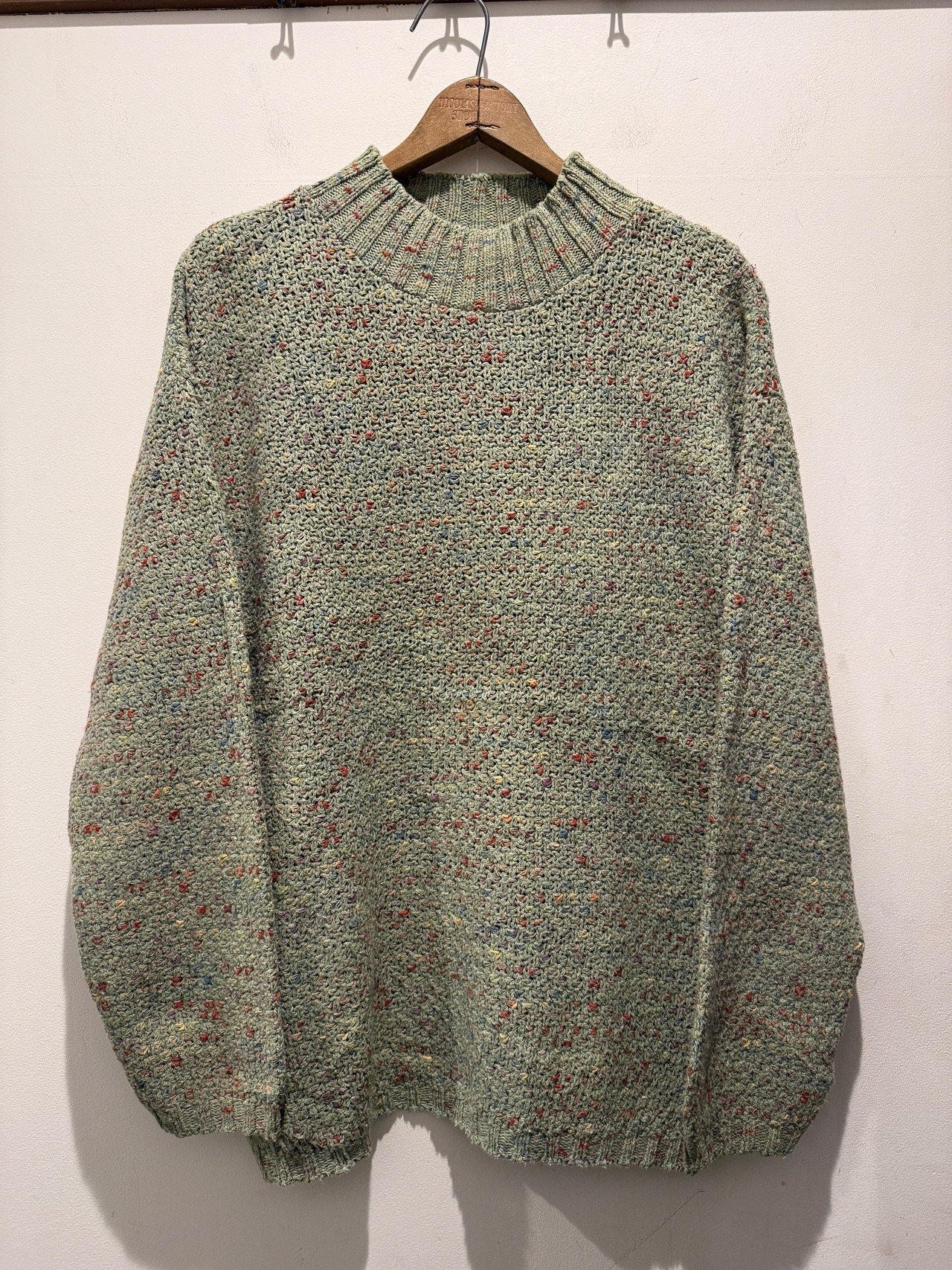 80年代アメリカ製のデザインコットンニットです。淡いウグイスカラーにカラフルなニットがミックスされているお洒落な1着です。モックネックに袖、裾リブは短めなのも面白いですね。コットンニットと着用しやすくユニセックスでオススメです。