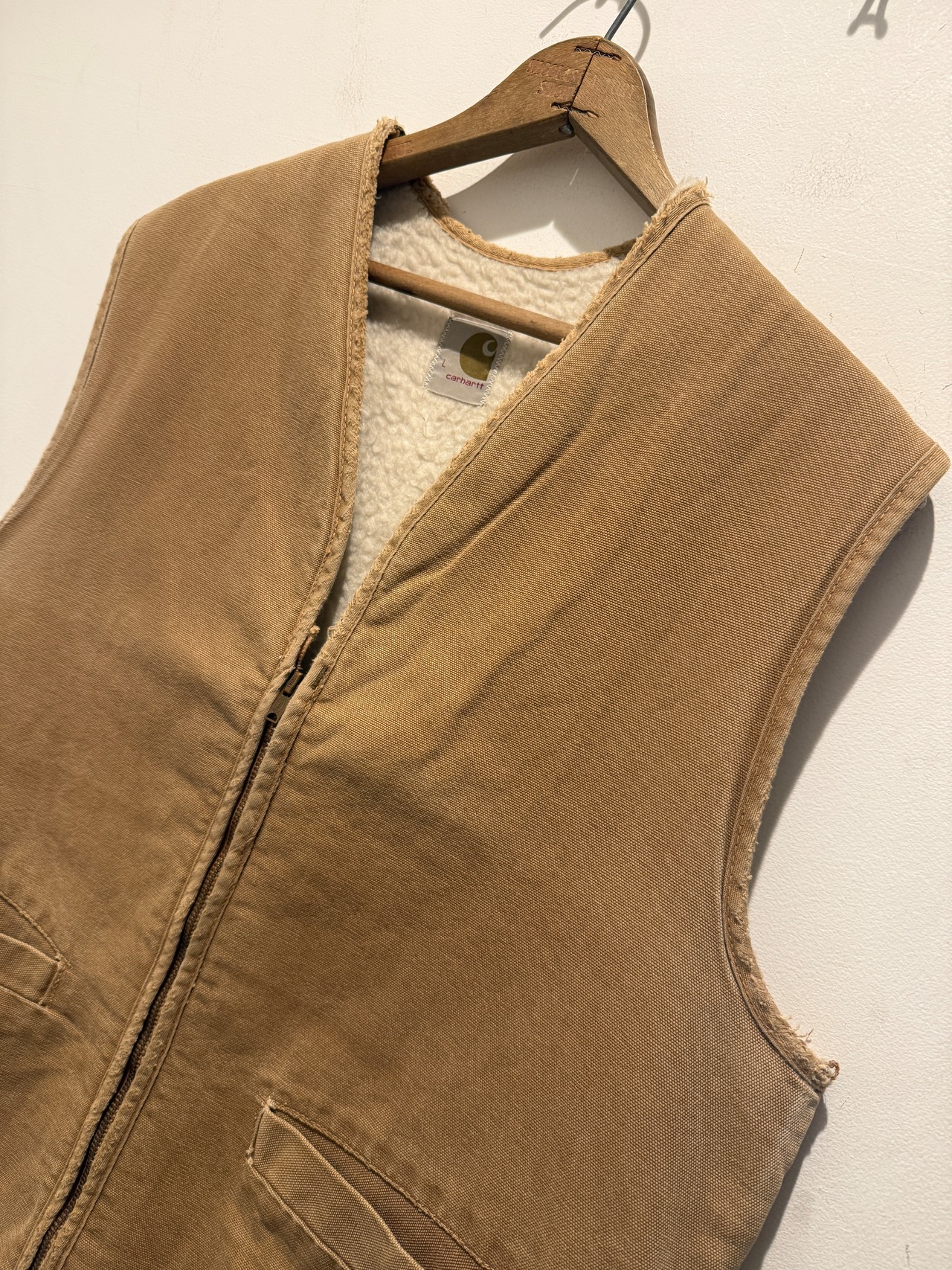 70年代カーハートのダックベストです。フェードしたダック地がとても良い1着です。ジッパーはSCOVILLでポケット中にはユニオンチケットもあります。裏ボア仕様でフロントにタグなども付かない無地なのもポイントですね。レイヤードに大活躍なベストでオールドのカーハートとオススメです。