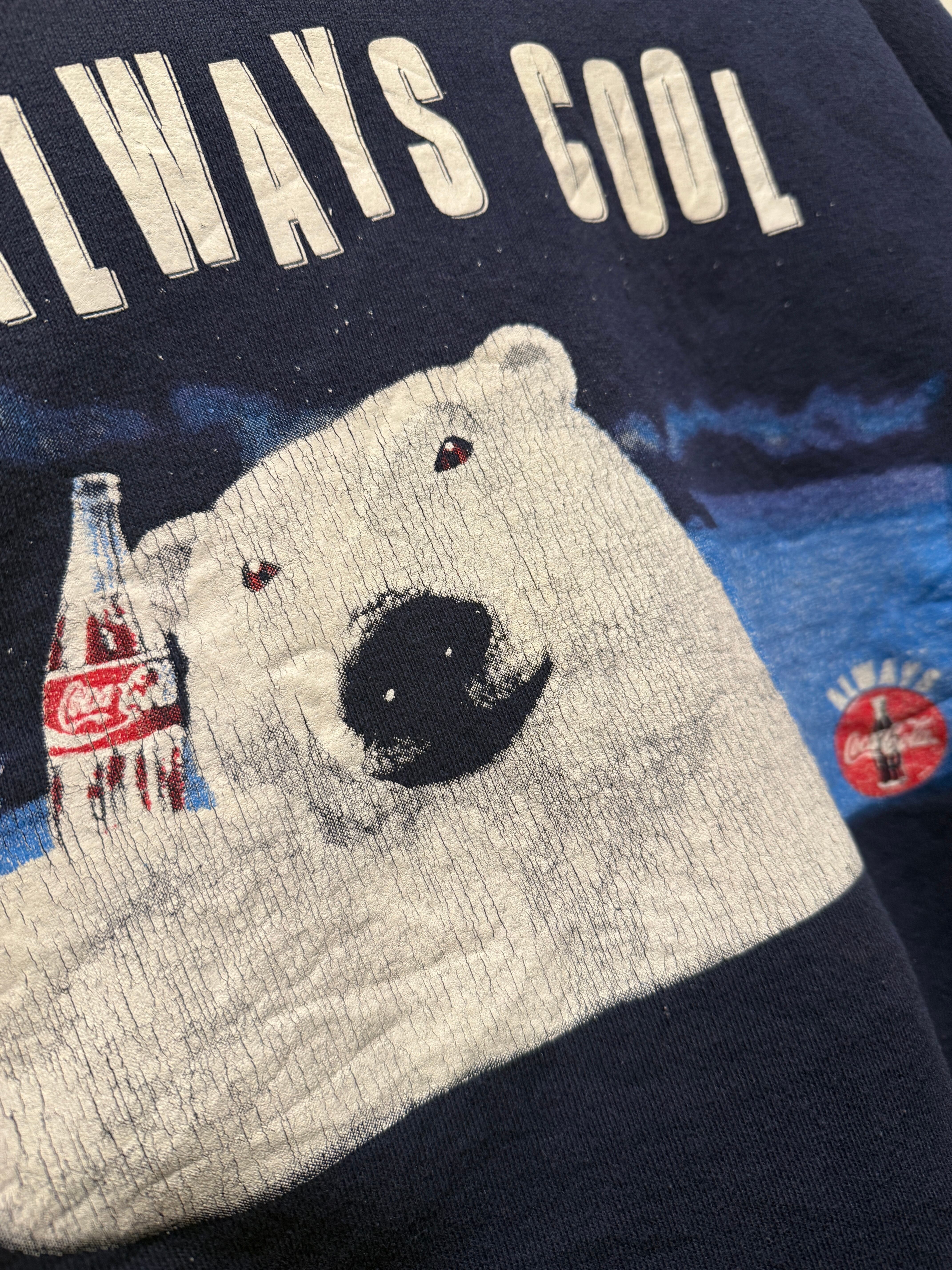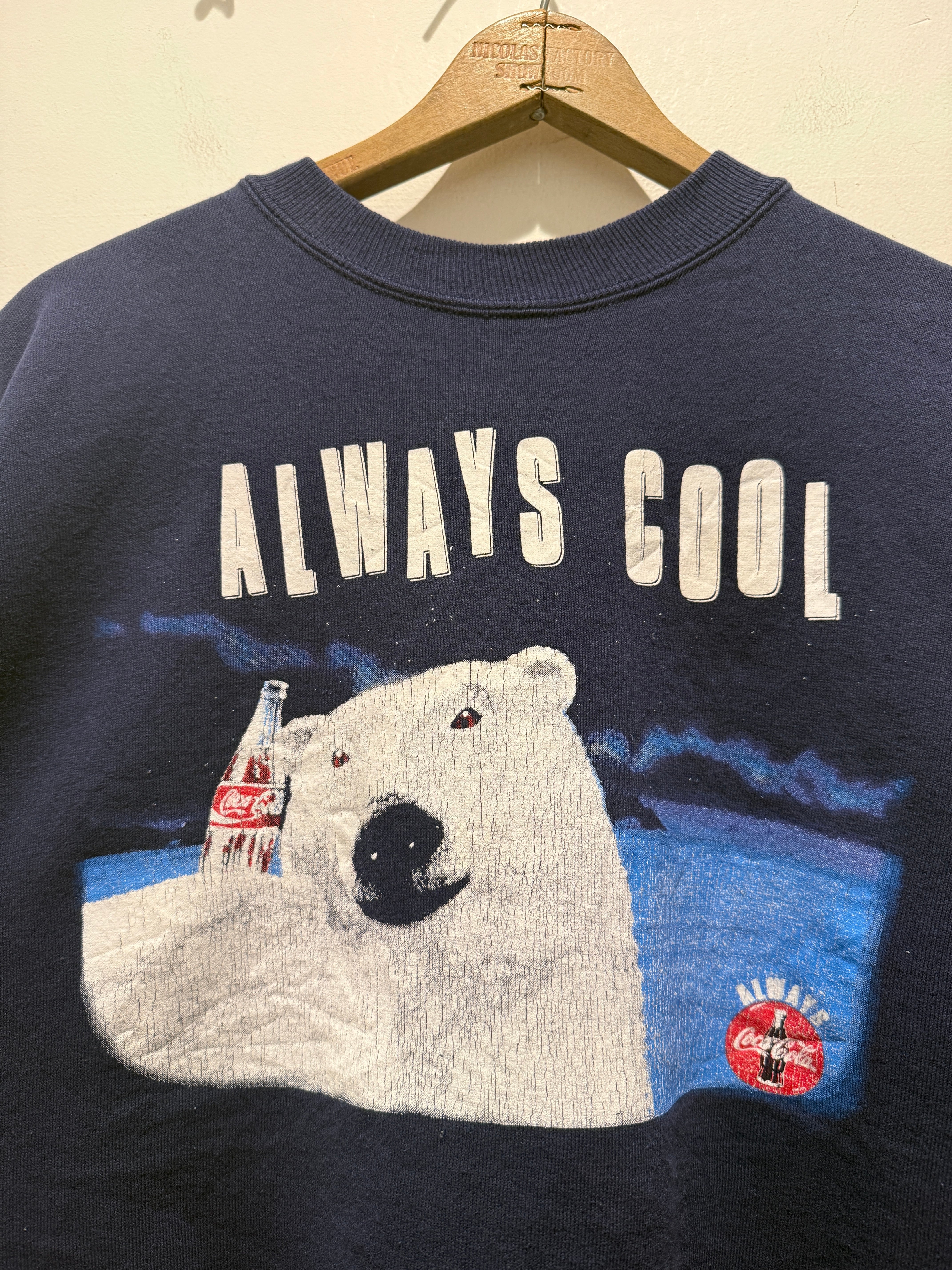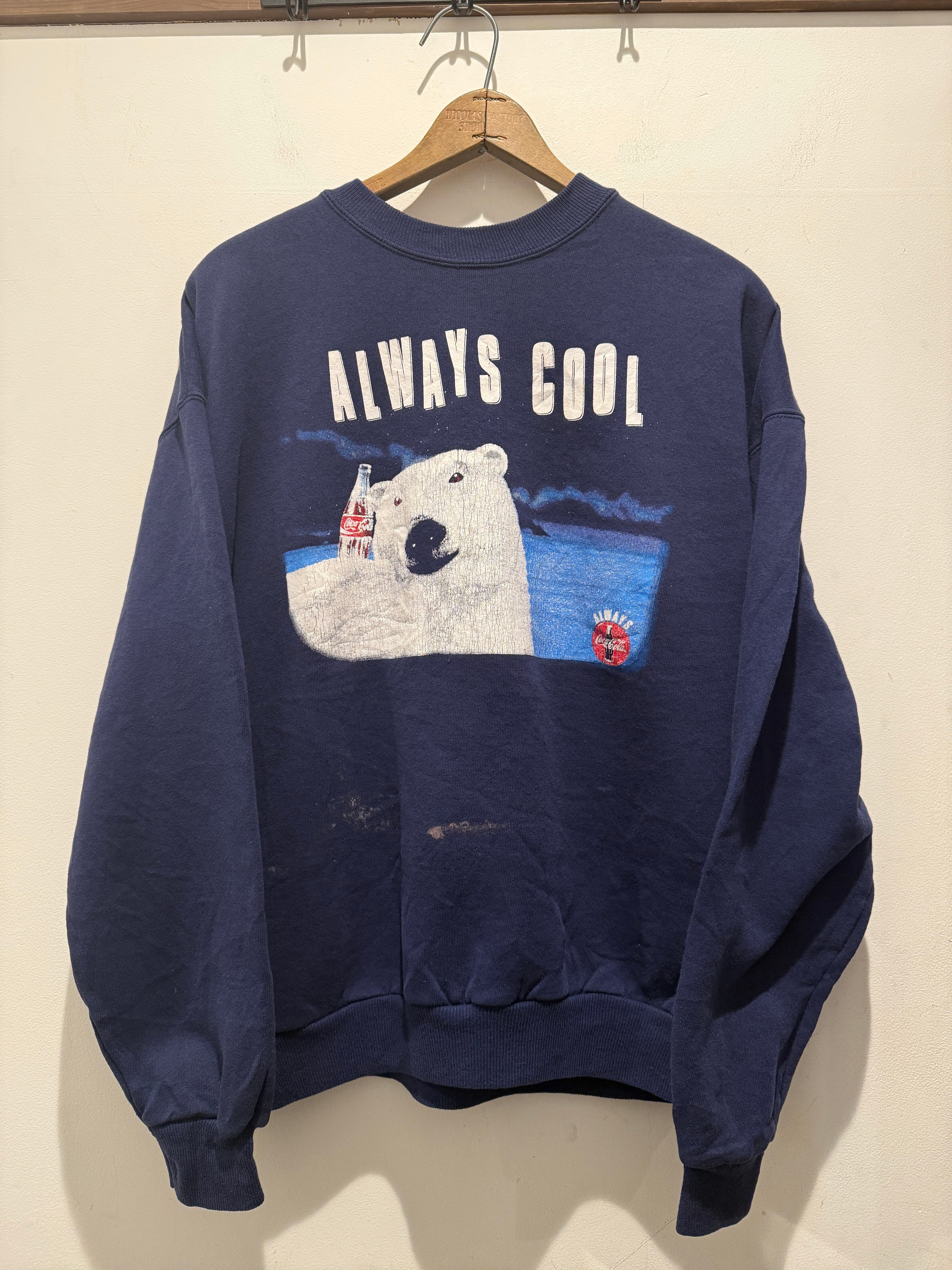 90年代コカコーラのスウェットです。ネイビーボディにシロクマがコーラを持ったデザインが可愛い1着です。ヘインズボディでプリントのかすれ具合も良い雰囲気ですね。デザインも良くユニセックスでオススメです。
