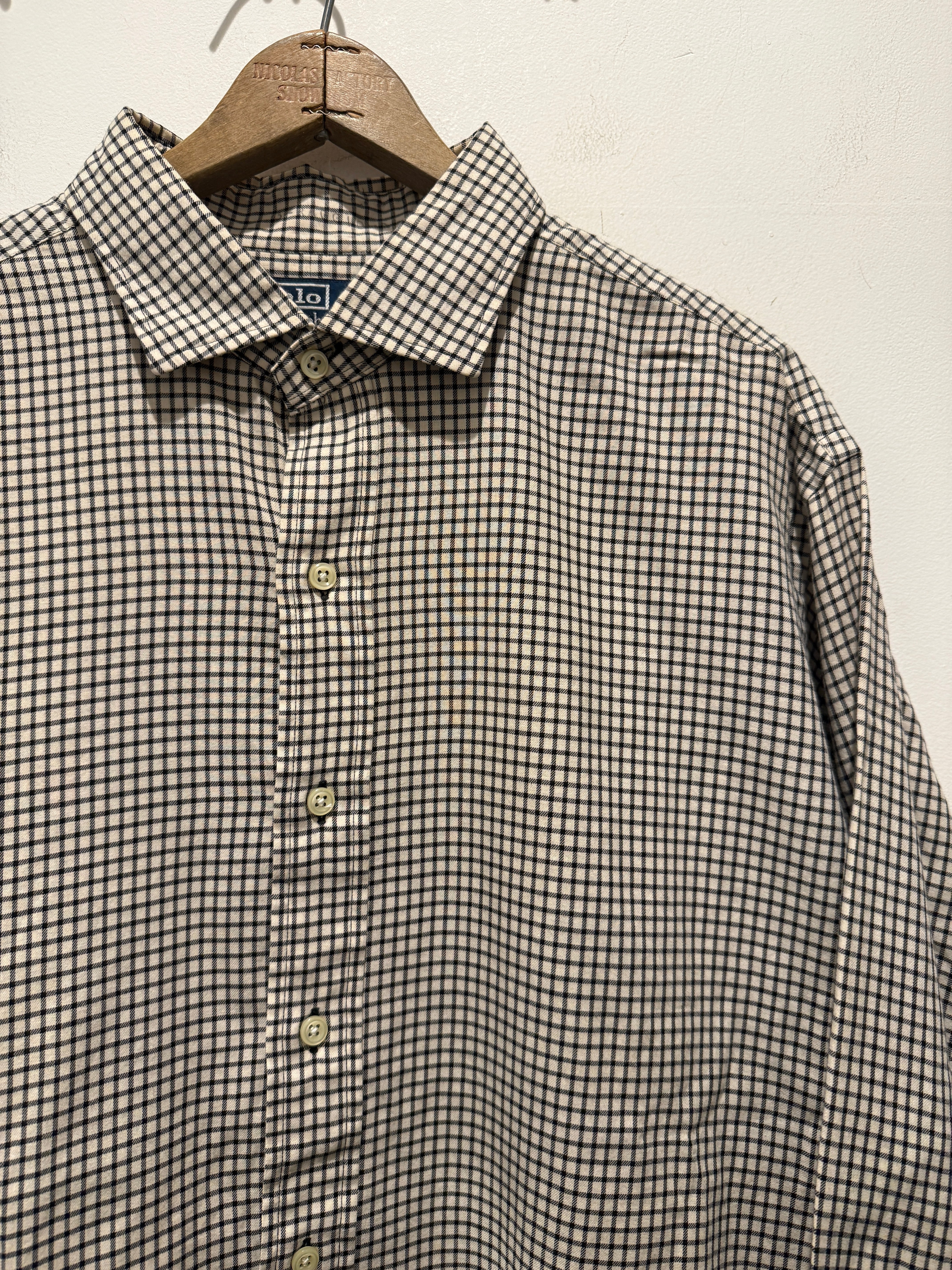 ラルフローレンのシャツです。ホワイト×ブラックのギンガムチェックでモノトーンカラーがとても良い1着です。またポニーマーク無しとなってるのもポイントですね。身幅広めで着丈も長すぎず形も良くオススメです。