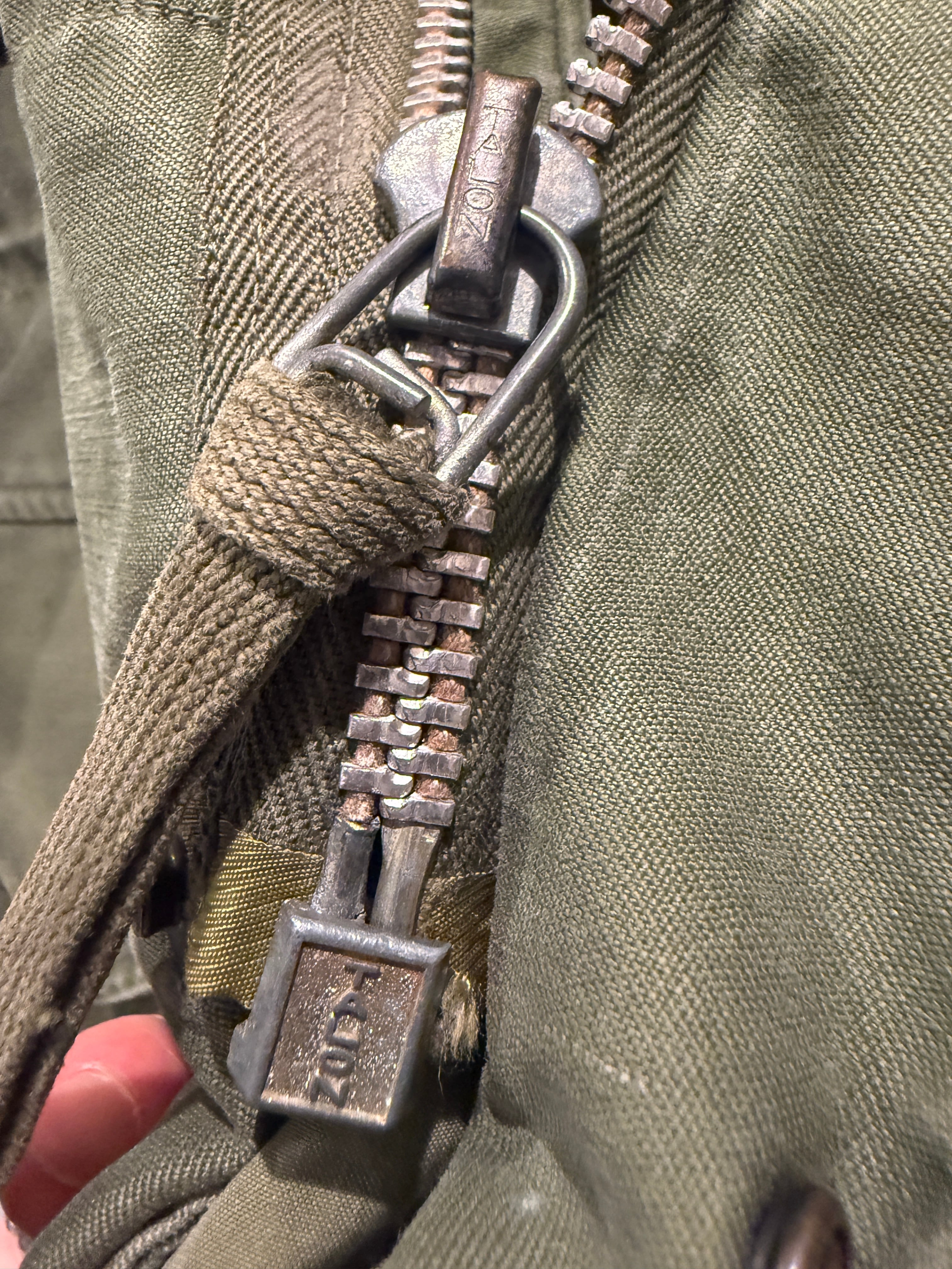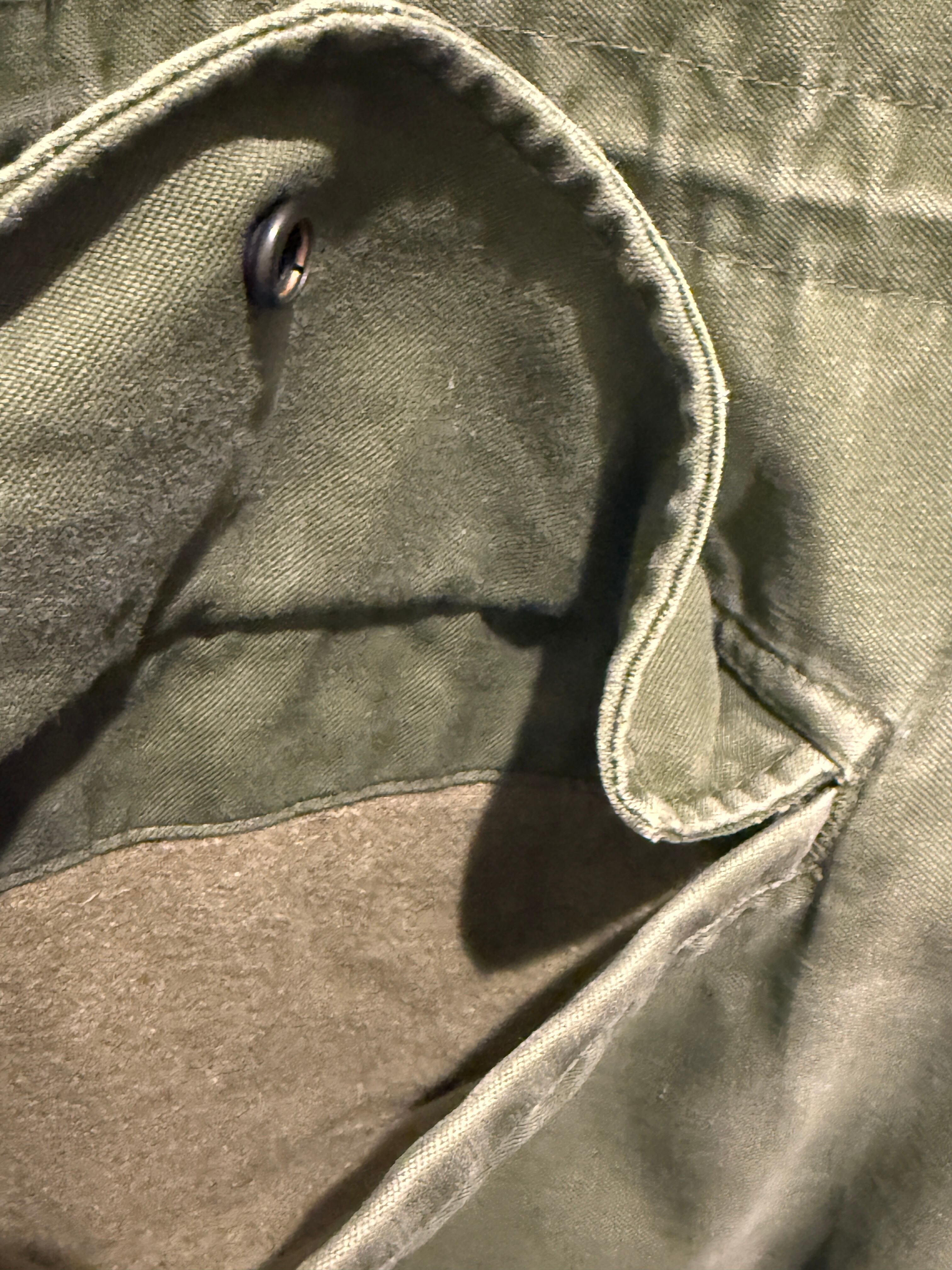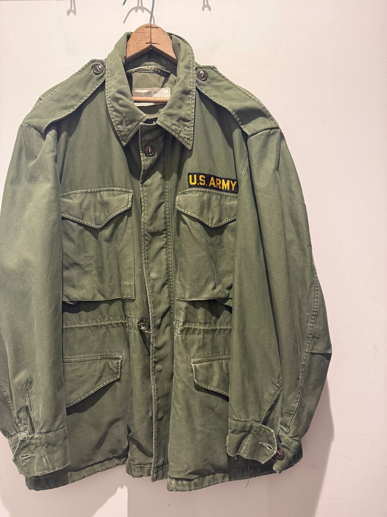 50年代アメリカ軍のMー1951フィールドジャケットです。1951年からMー65が登場するまで軍で採用された50年代を代表するUS ARMYのフィールドジャケット。こちらはチンストラップの付かない初期型でTALONのアルミジップを使用しております。生地感のハリもあり色もまだ濃く魅力的な1着となります。MEDIUM-SHORTと良いサイズ感で雰囲気も良くオススメなアイテムです。