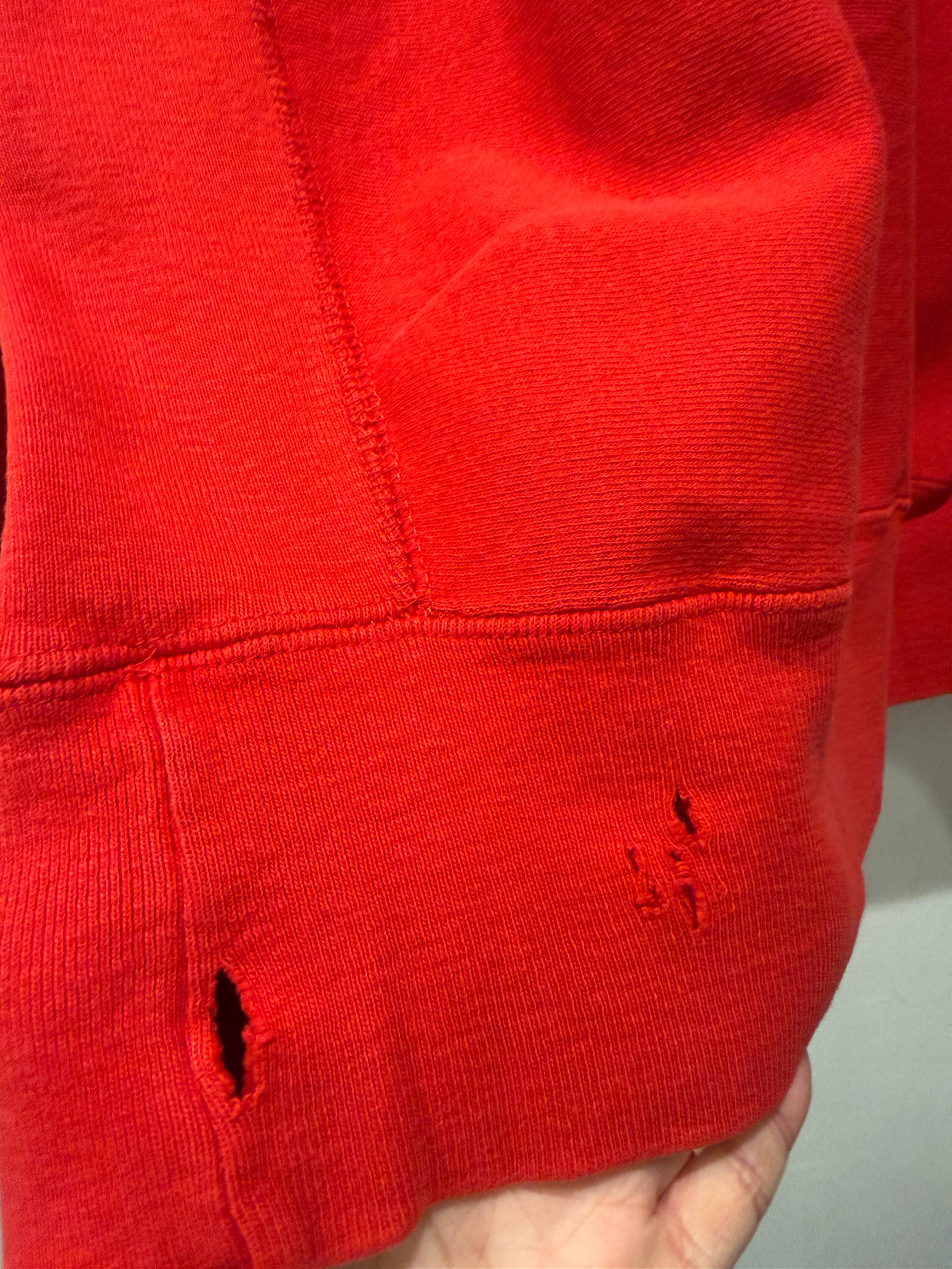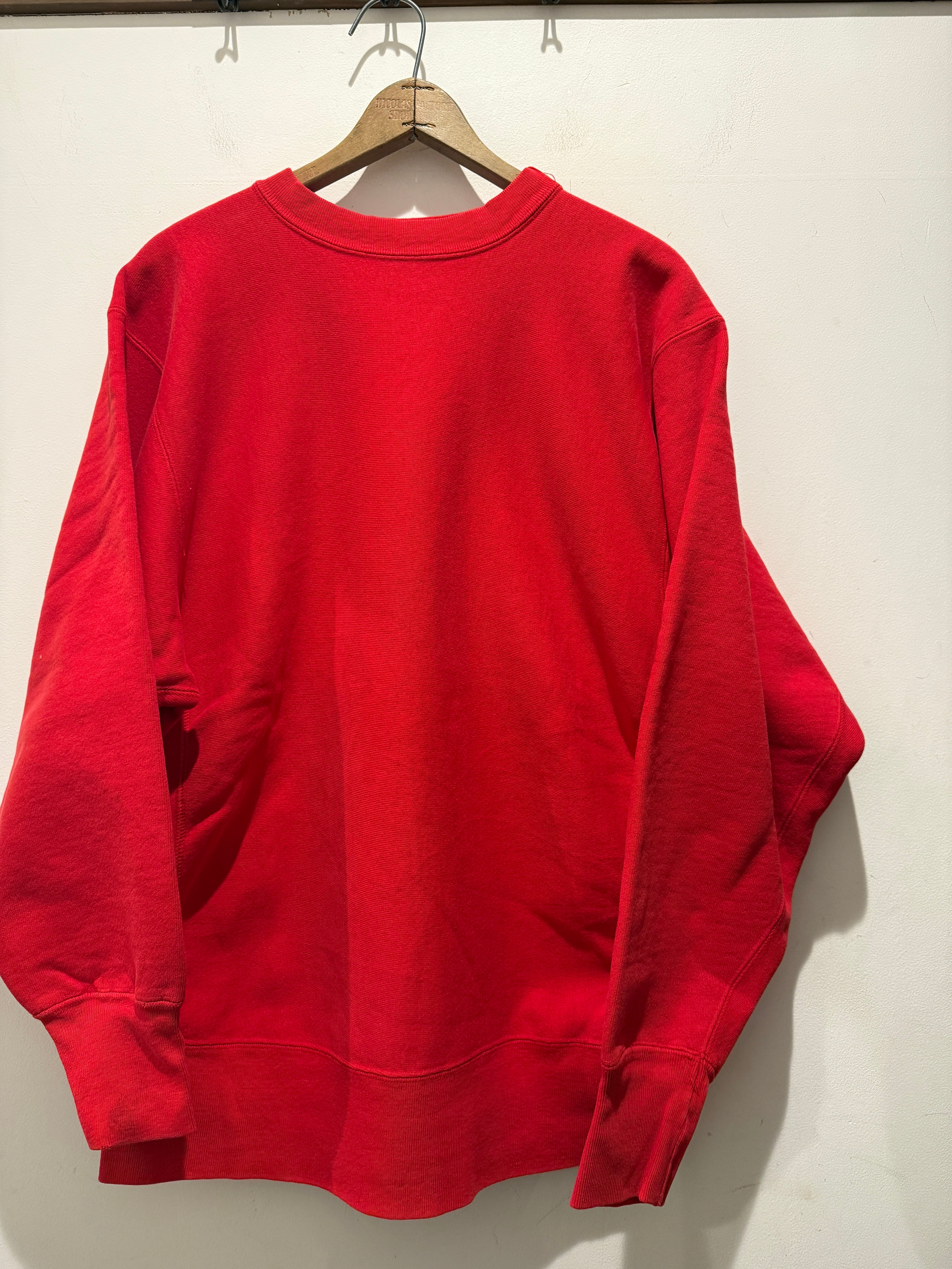 80年代アメリカ製チャンピオンのリバースウィーブです。トリコタグが付く80年代の物でしっかりアメリカ製のリバースとなります。目無しと呼ばれる無地のリバースで色は赤となります。トリコタグなので少し生地感が柔らかく、身幅があって着丈も長すぎないシルエットが魅力的でオススメです。