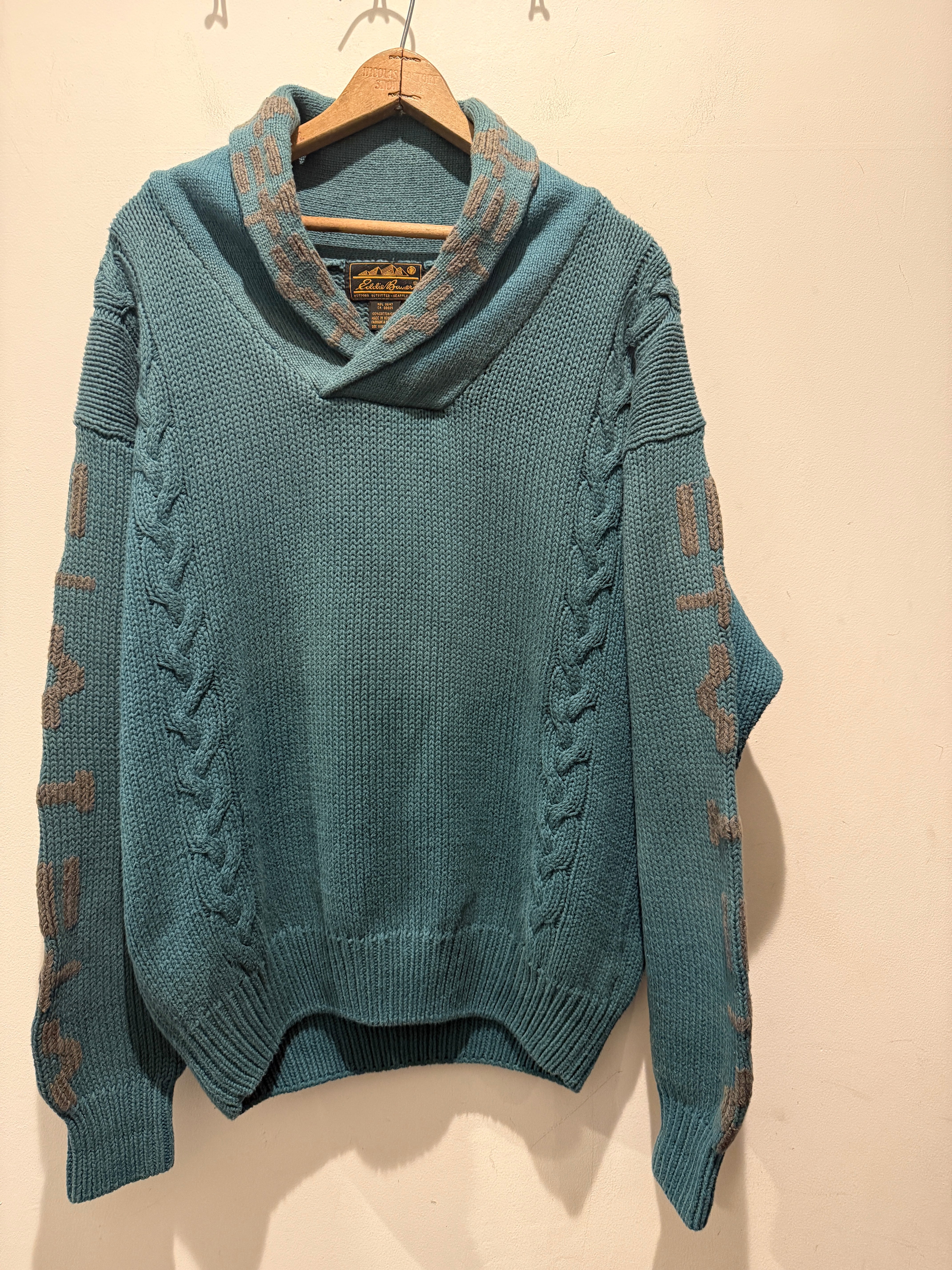 1980年代〜90年代エディバウアーのコットンニットです。80年代後期〜90年代前期の黒タグ付きエディーバウアーです。グリーンカラーでショルカラー、グレーの模様が入ったコットンニットとあまり見ない1着となります。ケーブル編みも入りデザインが凝っていてるのもポイントですね。ボックスシルエットと形も良くユニセックスでオススメなアイテムです。