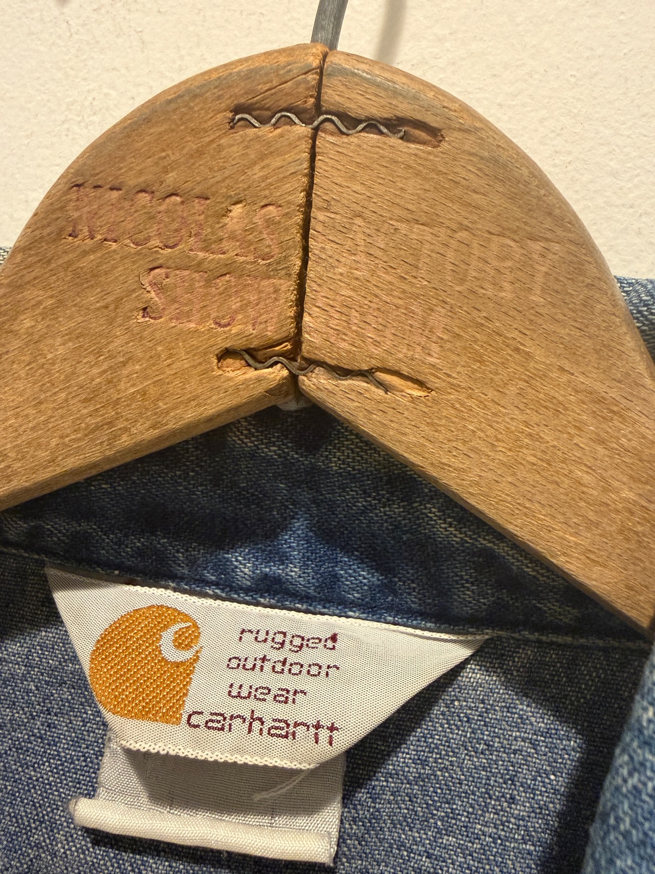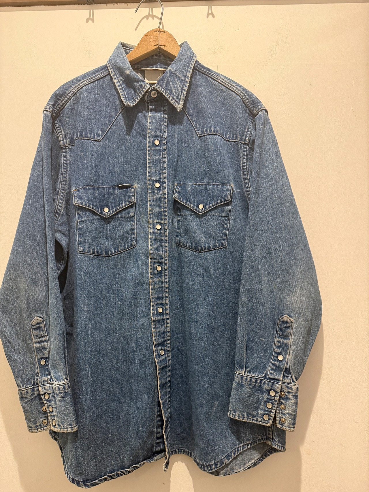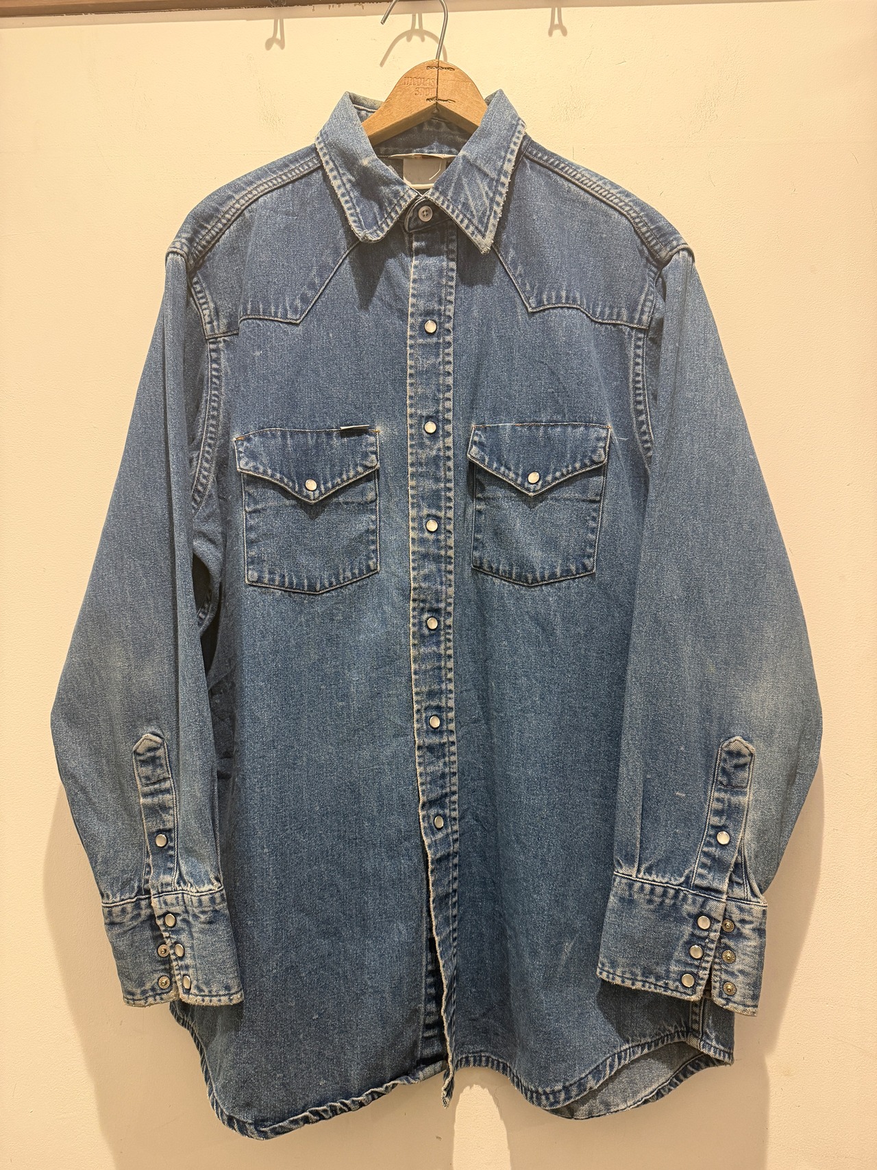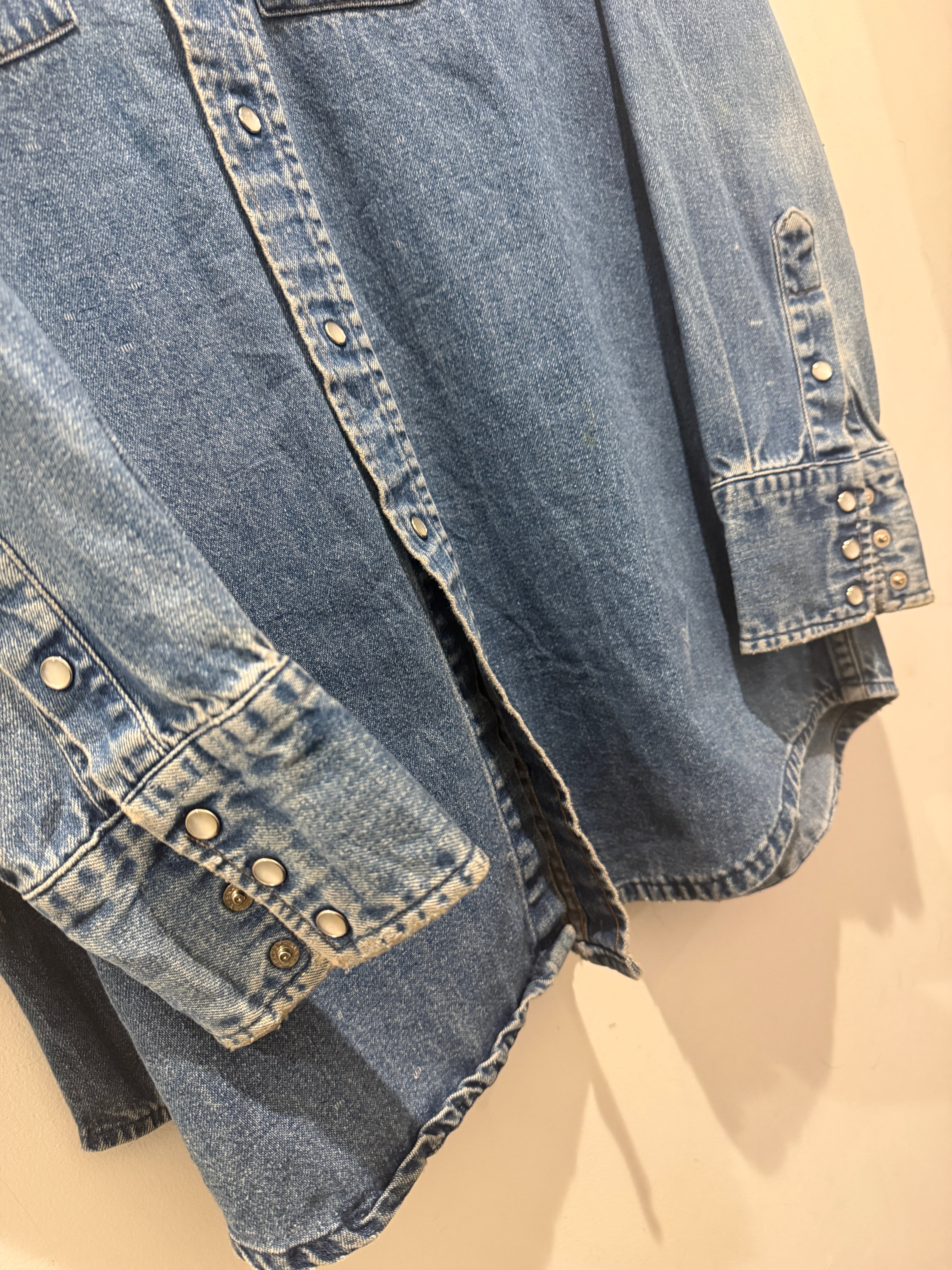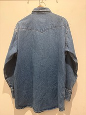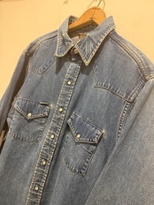 90年代カーハートのデニムシャツです。良い感じに縦落ちしているデニムシャツです。ウエスタンタイプは身幅が細くて着丈長いのが多い印象ですが、こちらは身幅もしっかりあって着丈も長すぎない良いサイズ感とオススメな1着です。