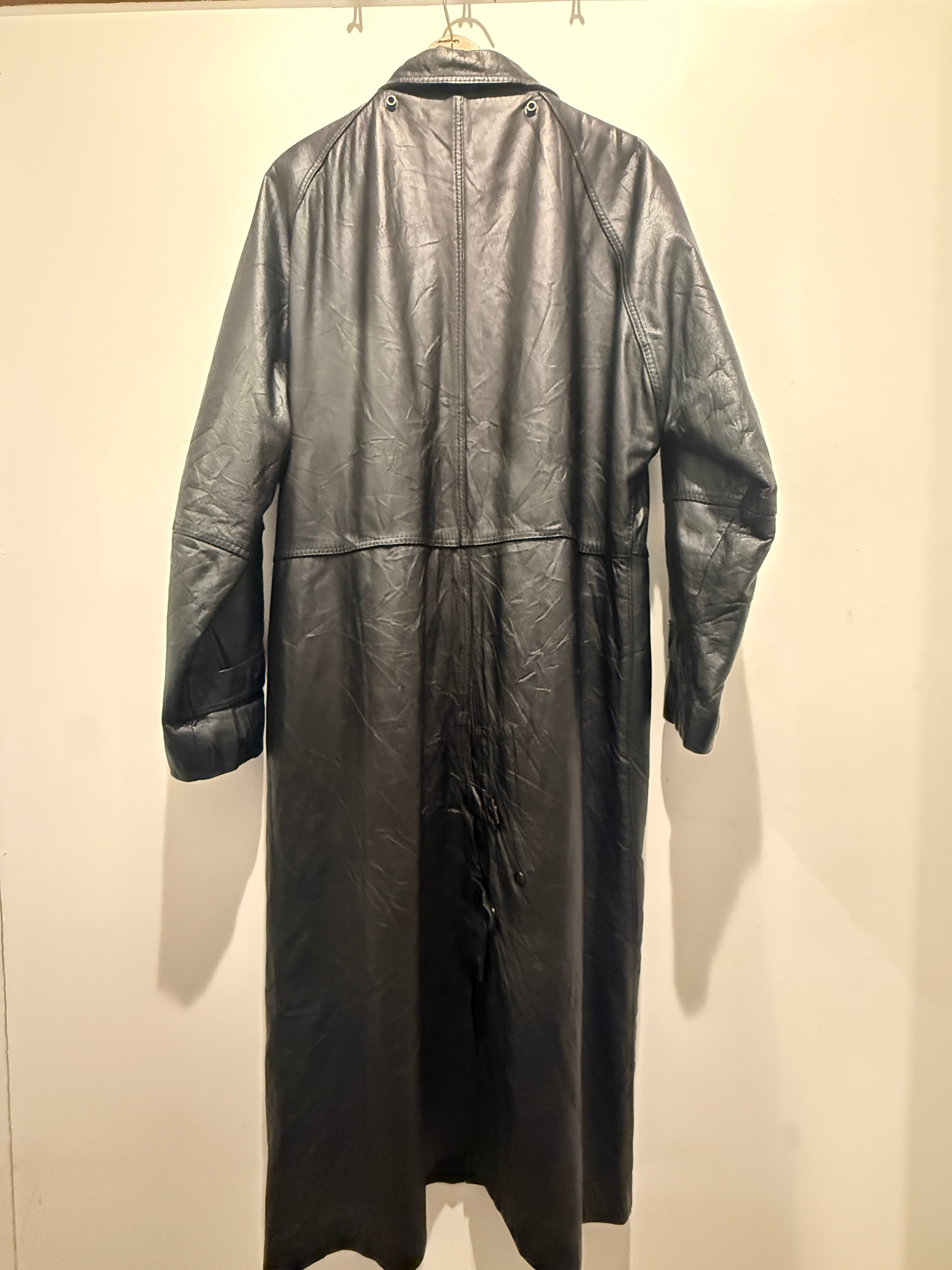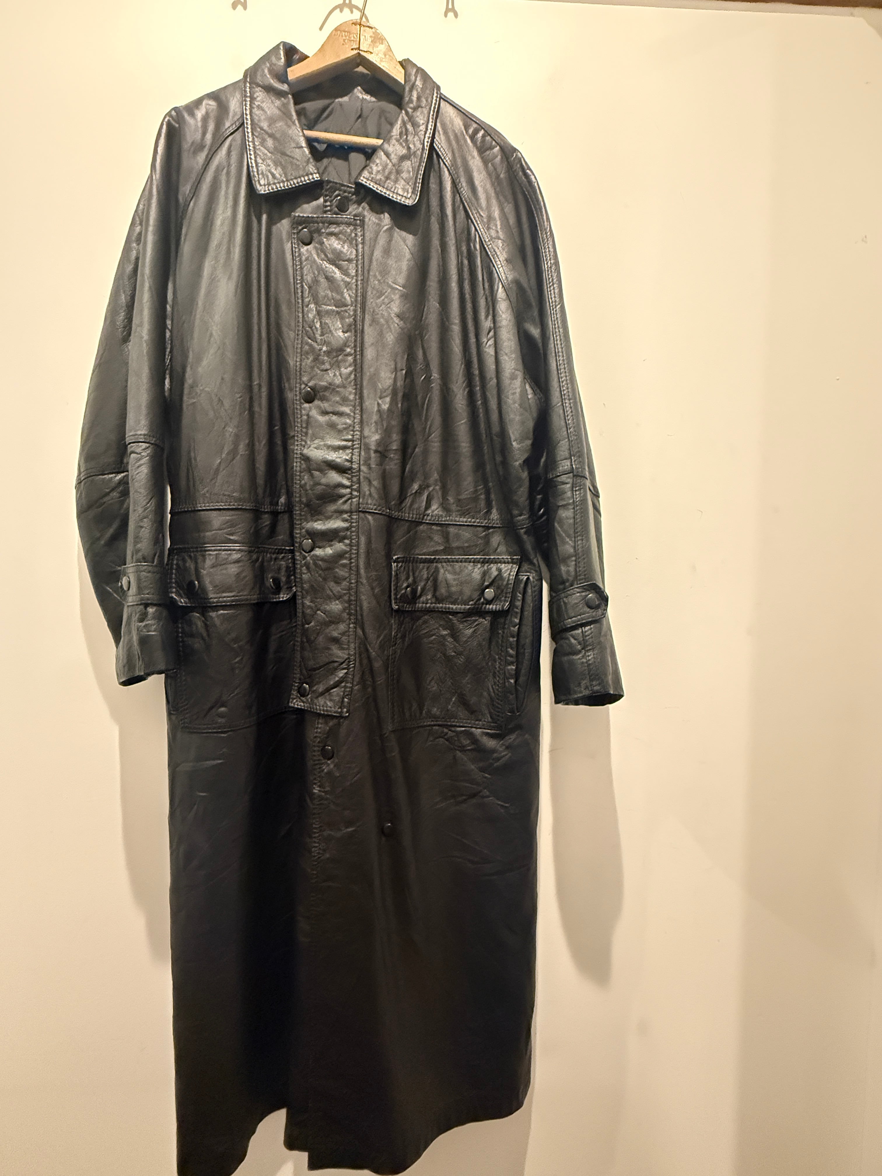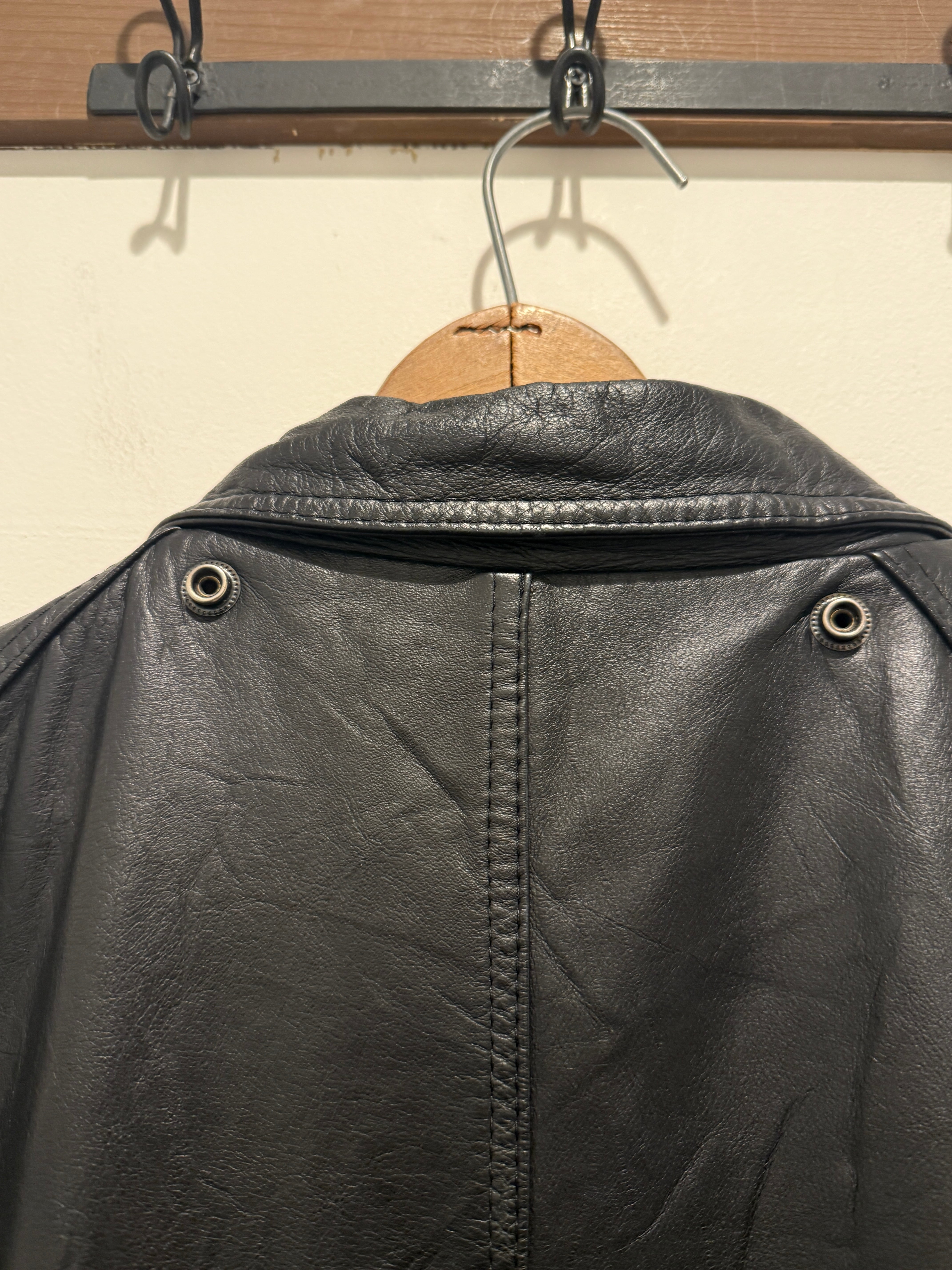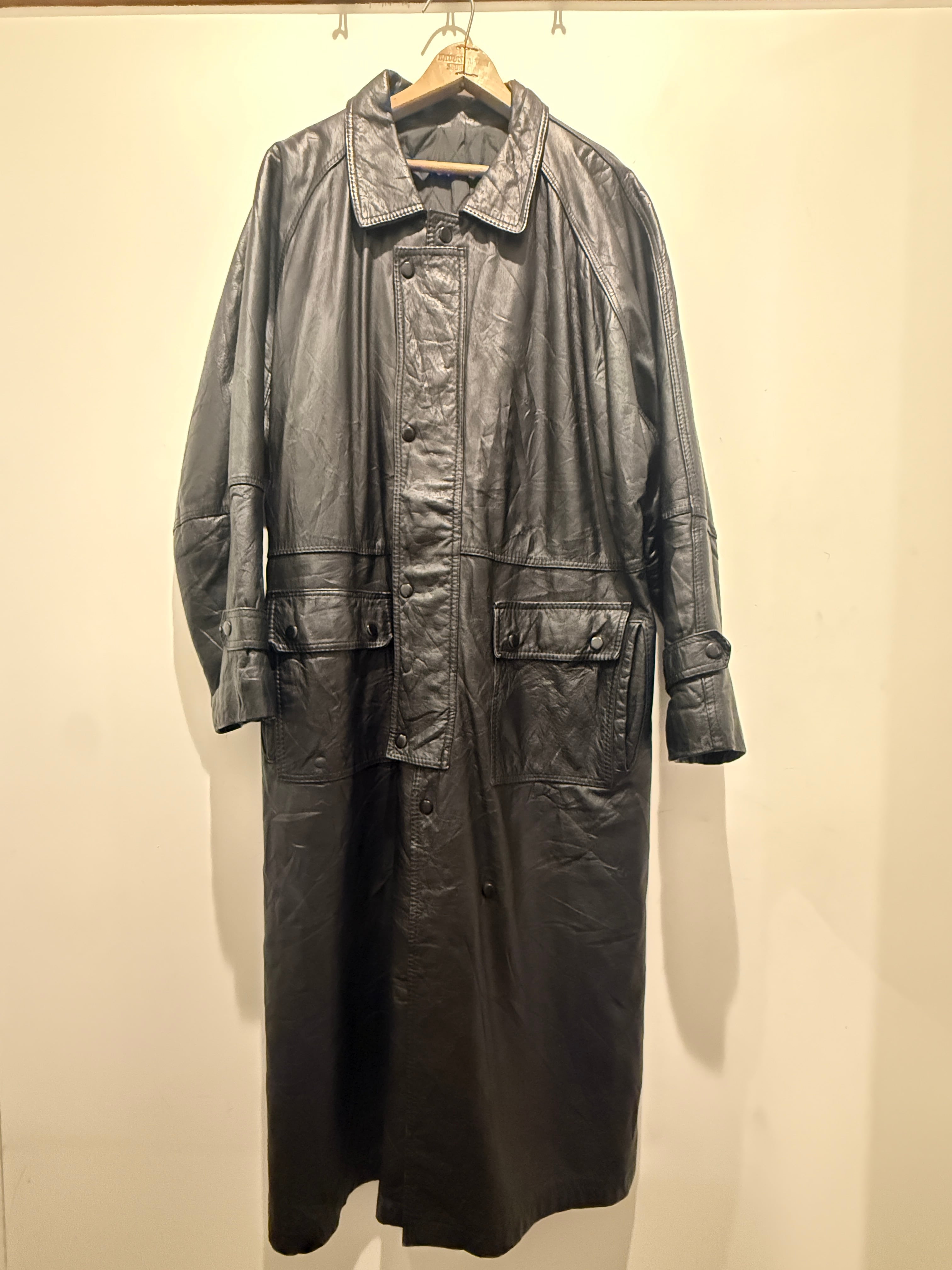 90年代のレザーコートです。ブラックのレザーで珍しいコートとなります。レディースでは見かけますがしっかりメンズのアイテムでは中々見つかりませんね。ラグランスリーブで肩もしっかり落ちて身幅も広めと最高なレザーコートです。タグはありませんが革質も良く、当時の値段は高そうな1着ですね。コンディションも良くオススメです。