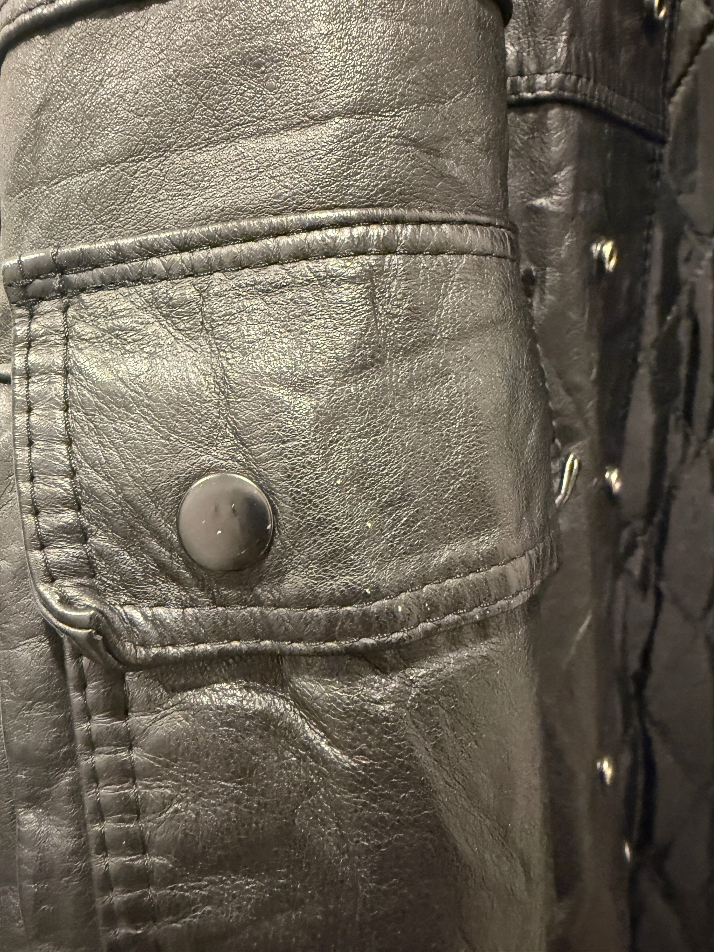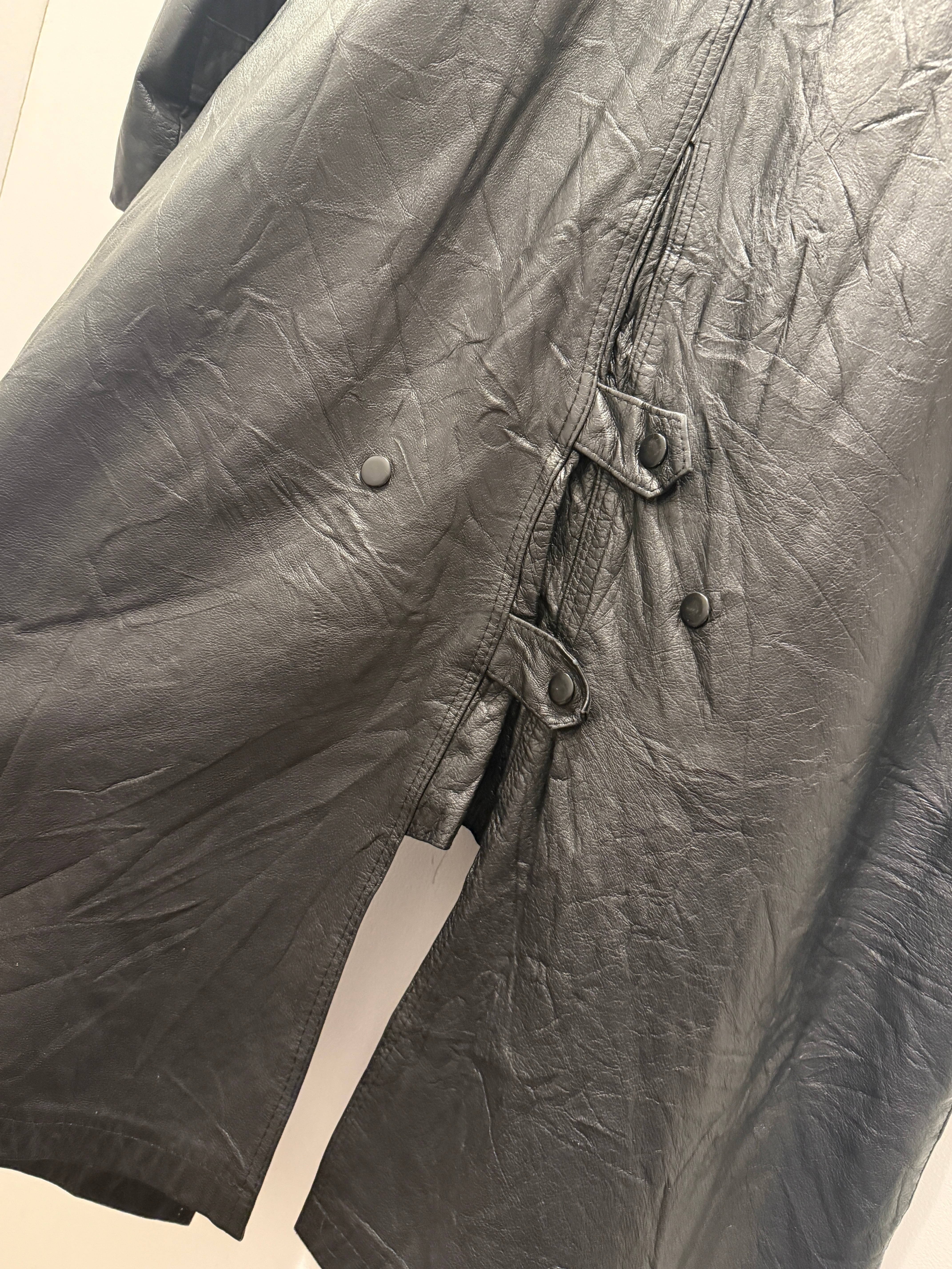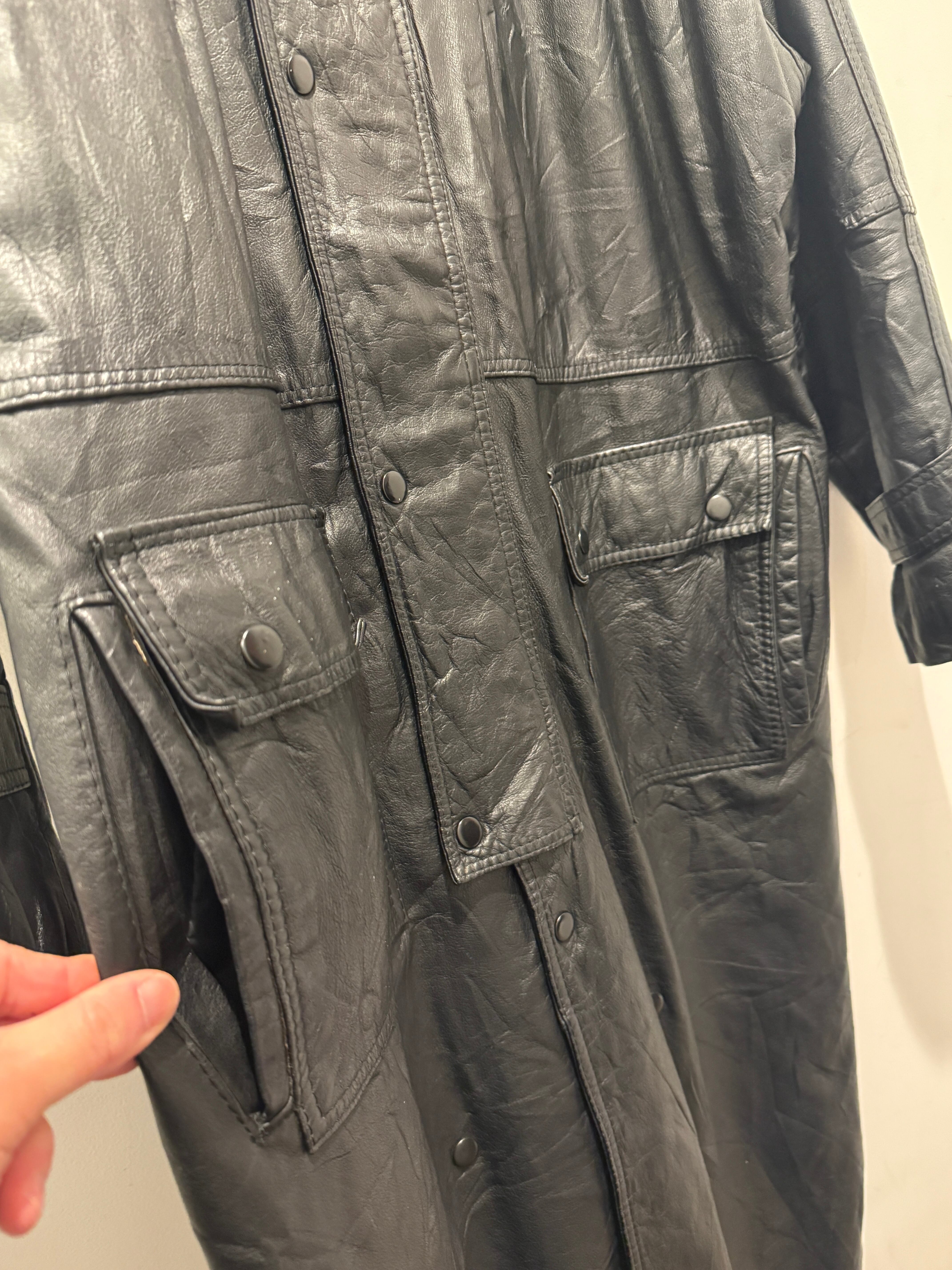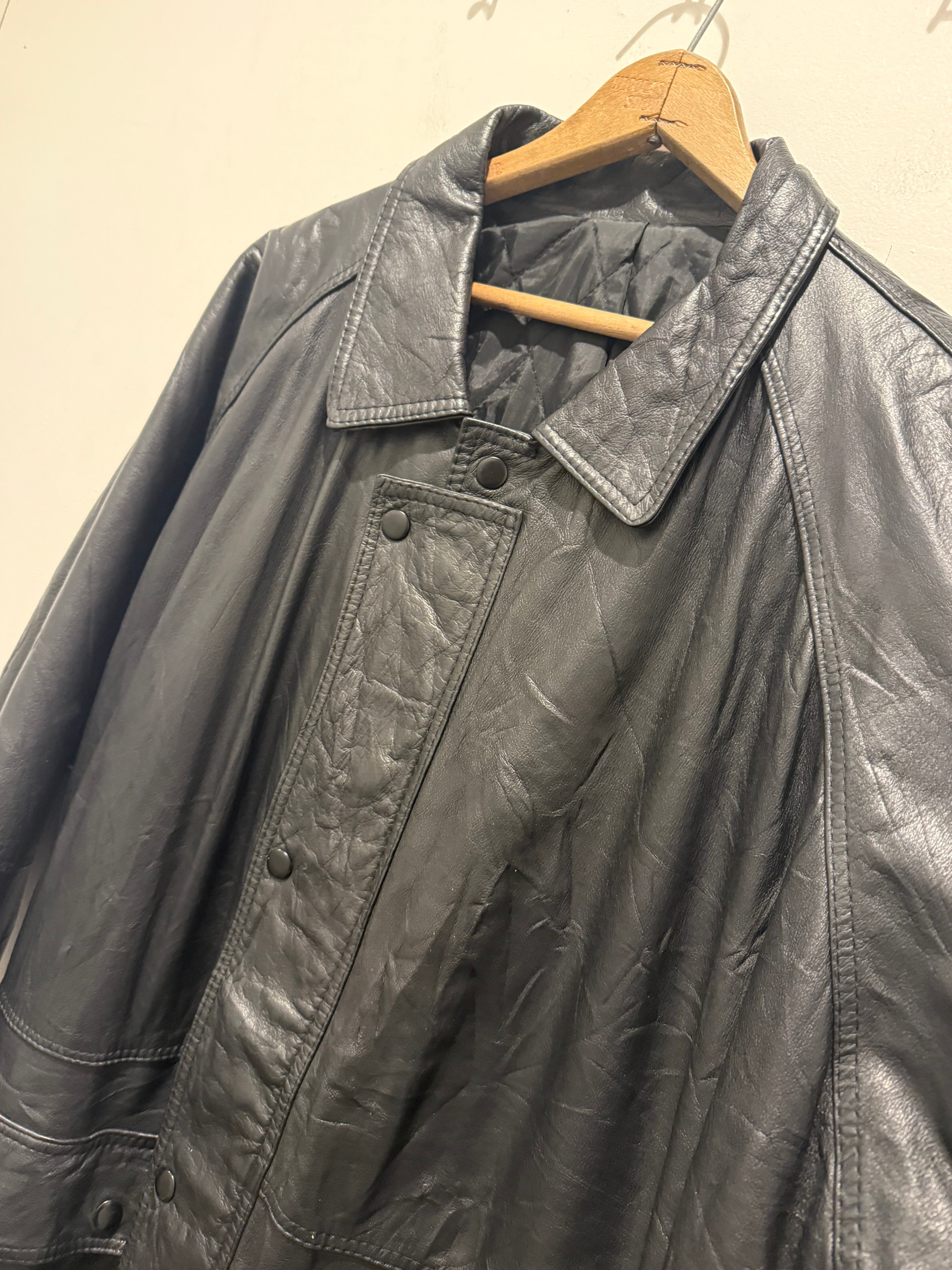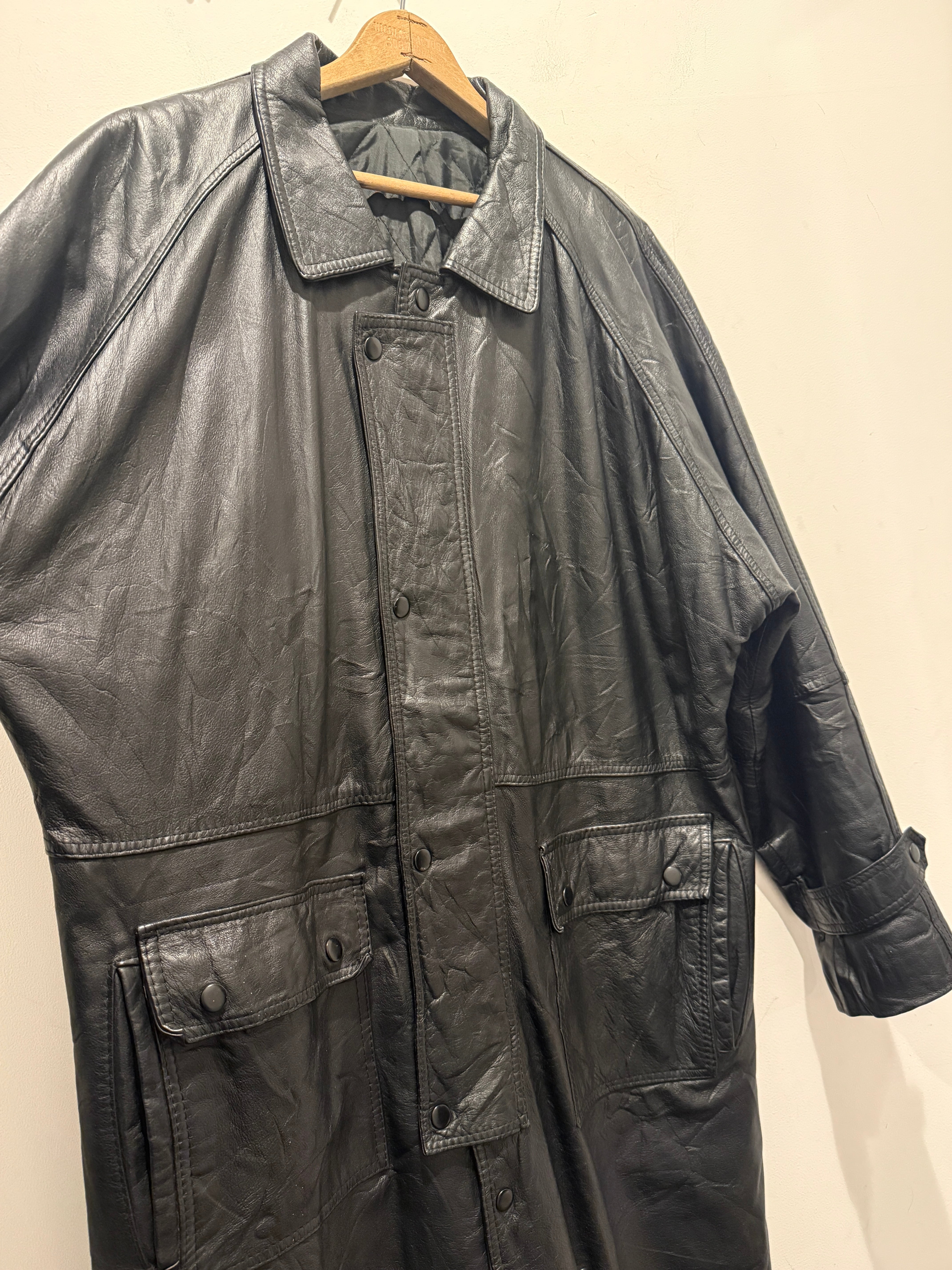 90年代のレザーコートです。ブラックのレザーで珍しいコートとなります。レディースでは見かけますがしっかりメンズのアイテムでは中々見つかりませんね。ラグランスリーブで肩もしっかり落ちて身幅も広めと最高なレザーコートです。タグはありませんが革質も良く、当時の値段は高そうな1着ですね。コンディションも良くオススメです。