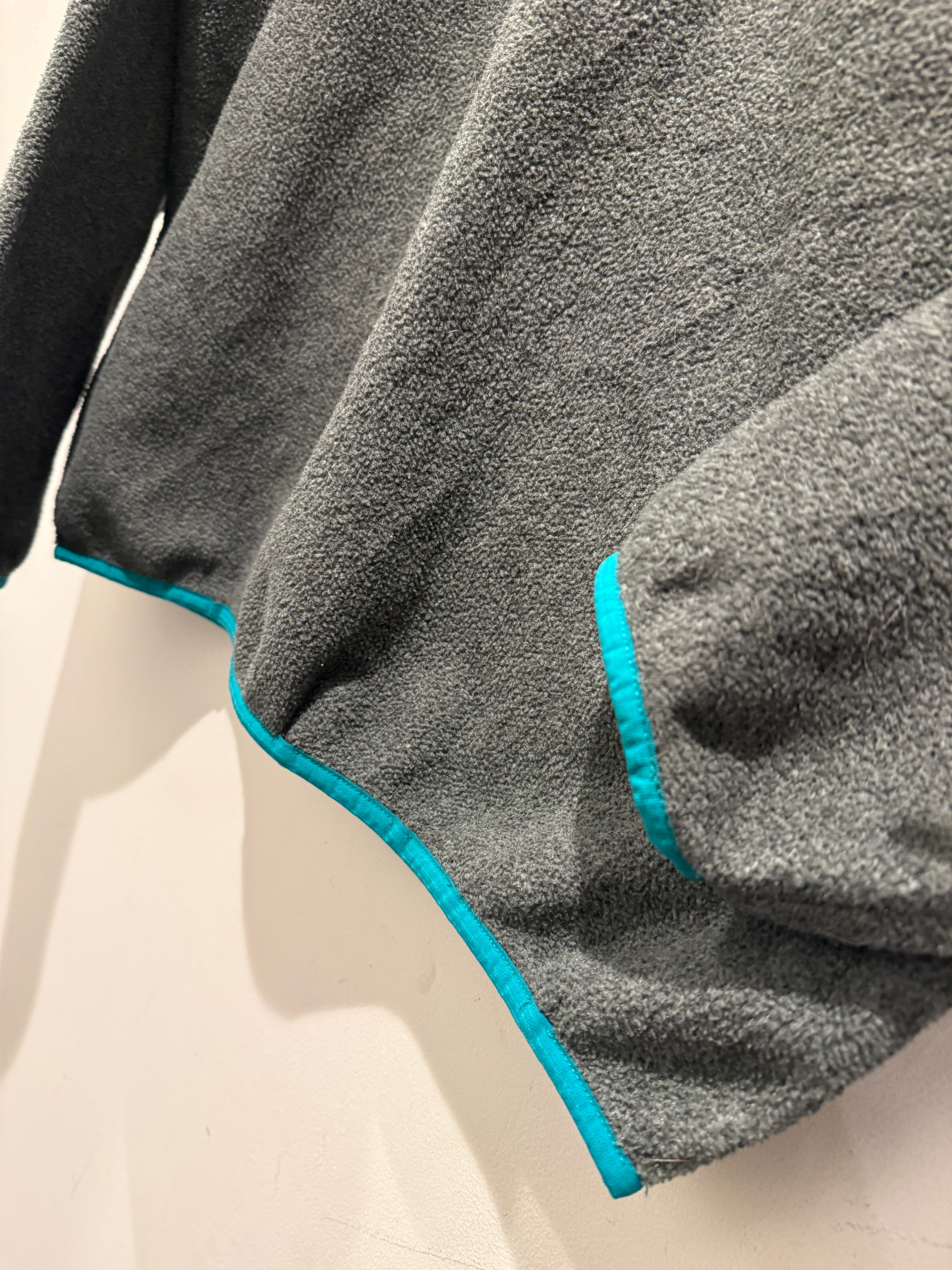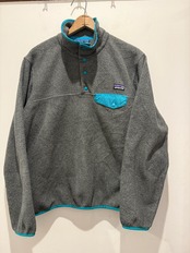 パタゴニアのシンチラスナップTです。チャコールグレーボディにエメラルドグリーンのパイピングと良い配色の1着です。レディースのスナップTですが作りは大きめです。2013年の物でコンディションも良くオススメです。