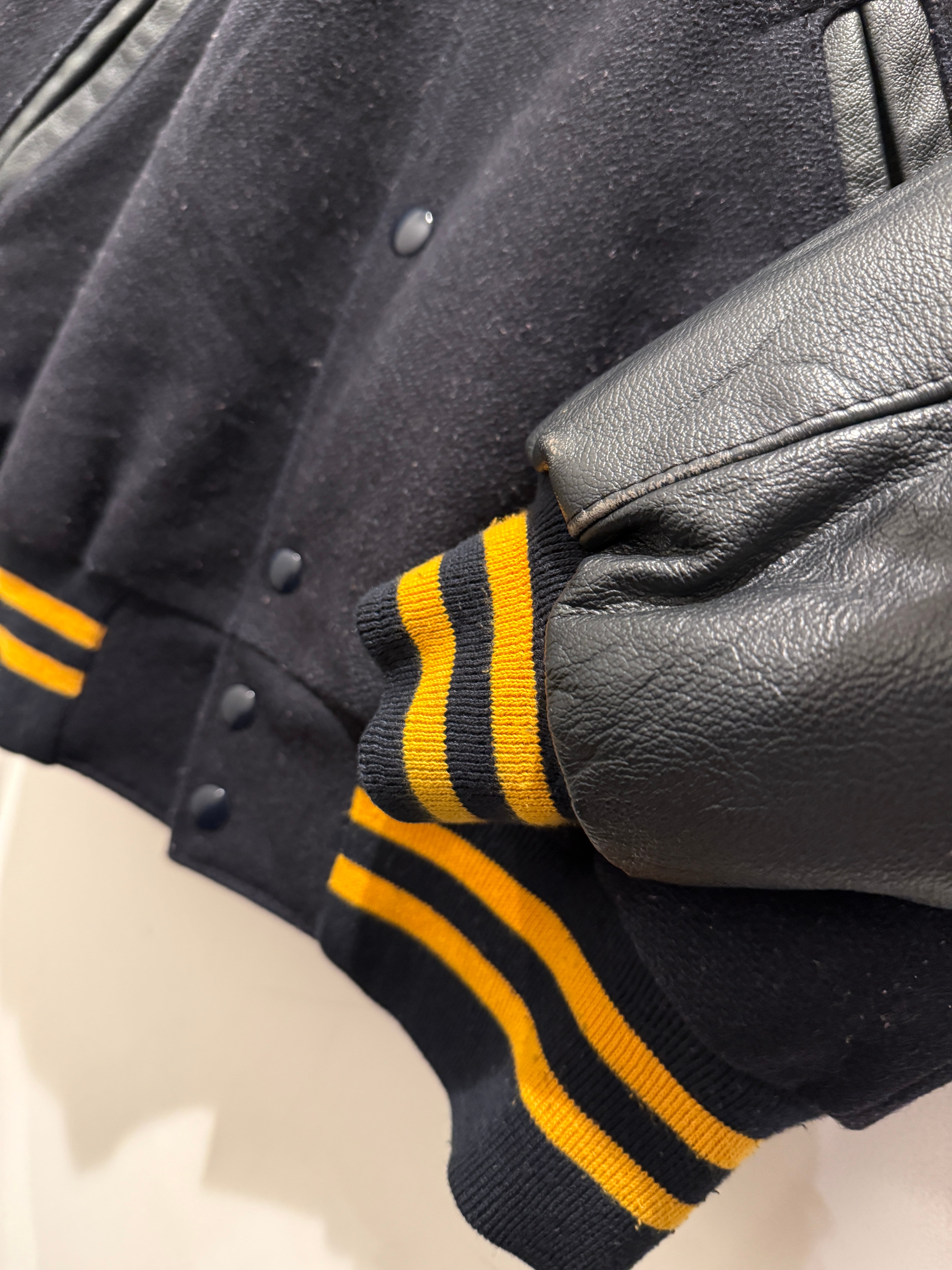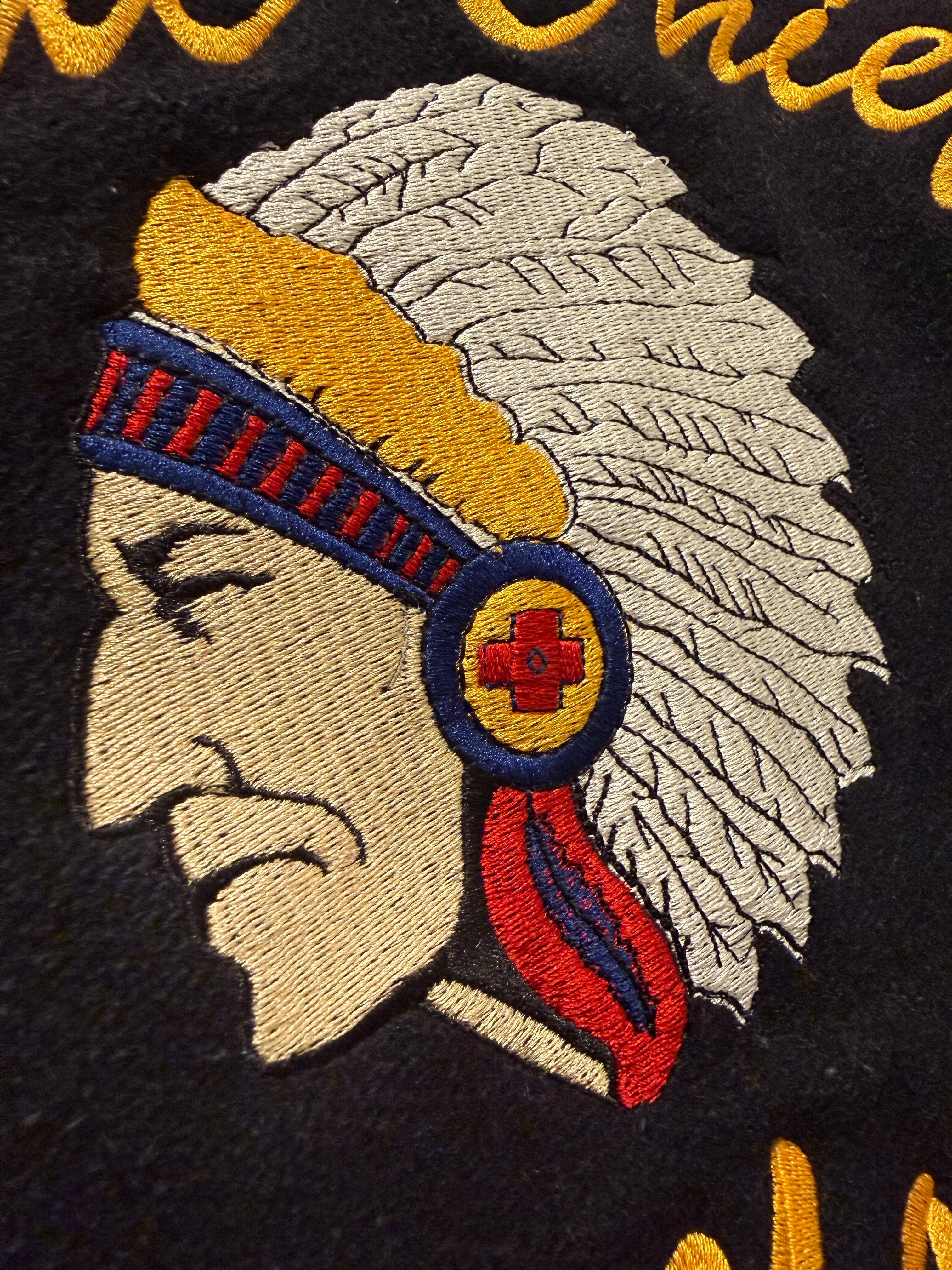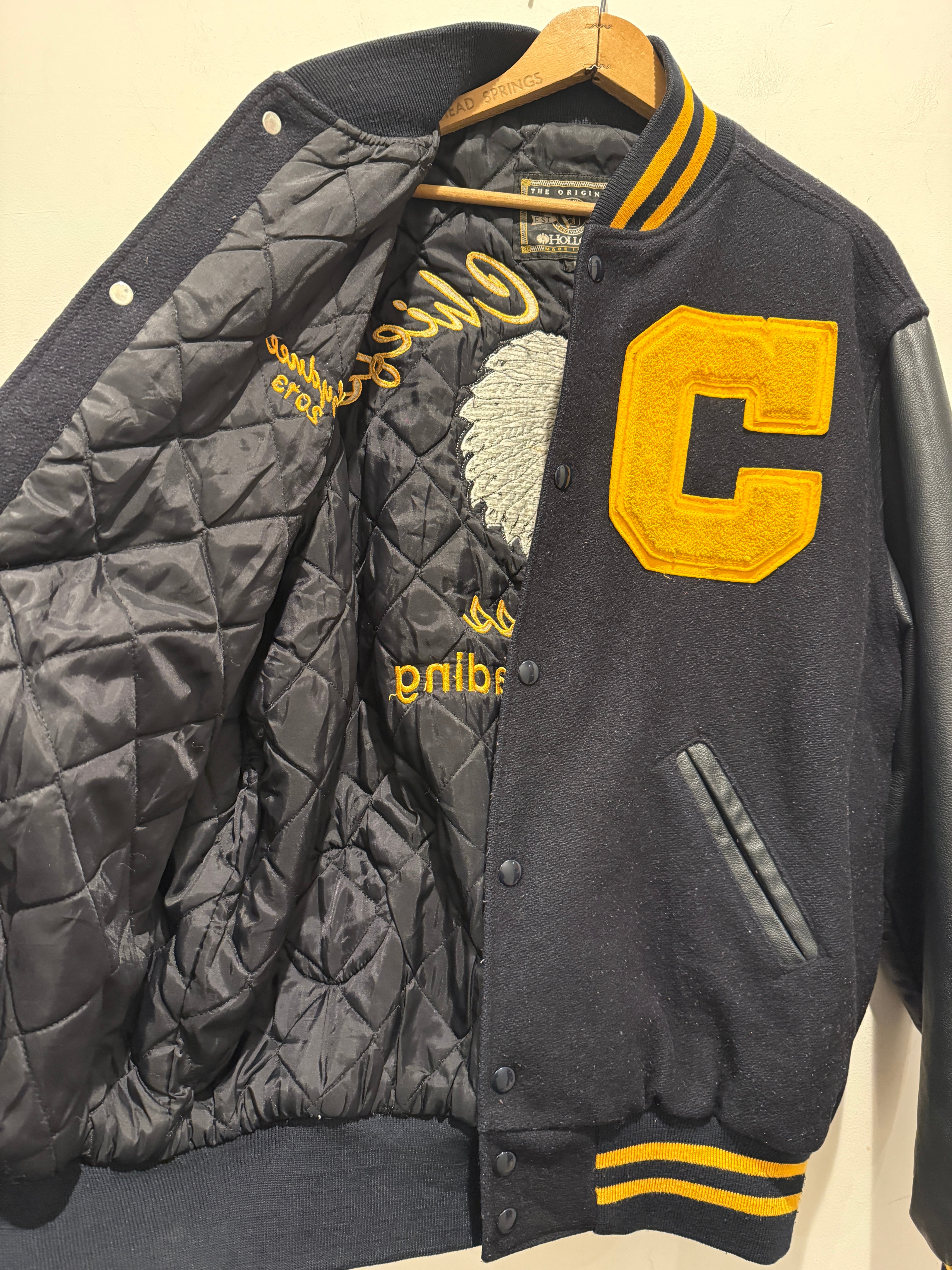 2013年アメリカ製ホロウェイのバーシティジャケットです。ネイビー×イエローの配色がとても良く、レザー部分もネイビーとなります。そして何よりバッグのインディアンヘッドの刺繍が最高ですね。それだけでは無くワッペンも付く豪華な1着となります。年代は浅めですがしっかりアメリカ製でインディアン物とオススメなスタジャンです。