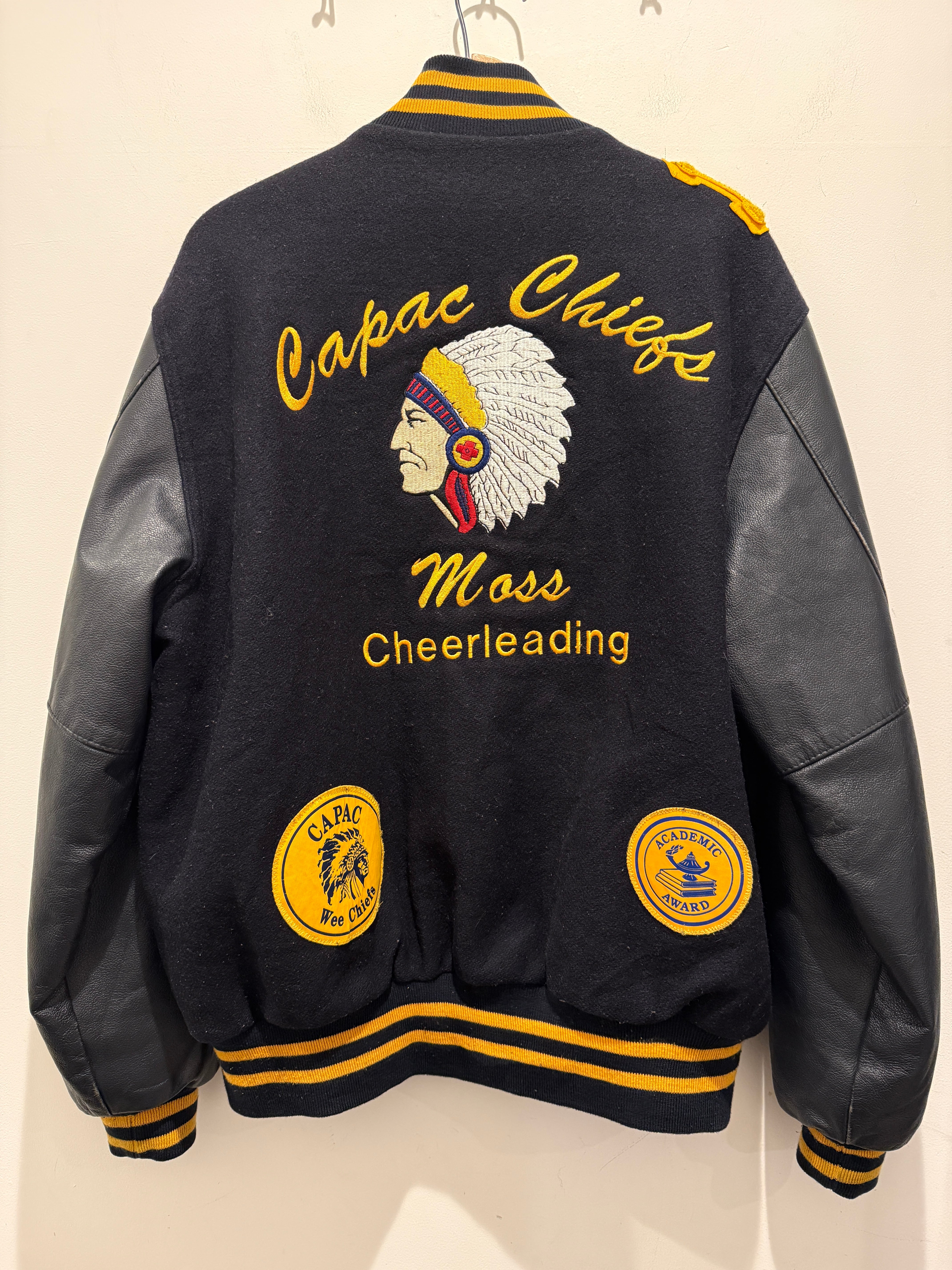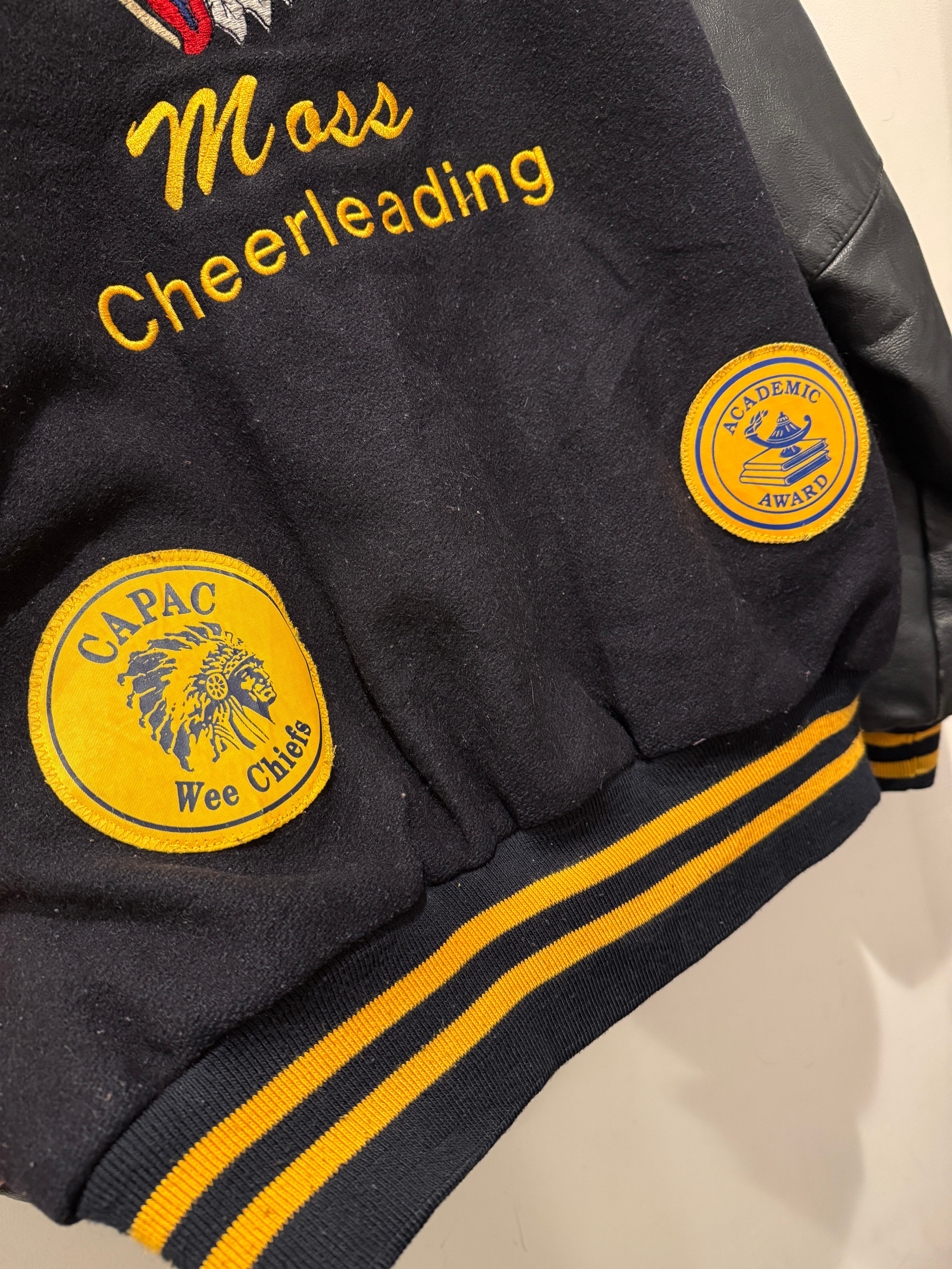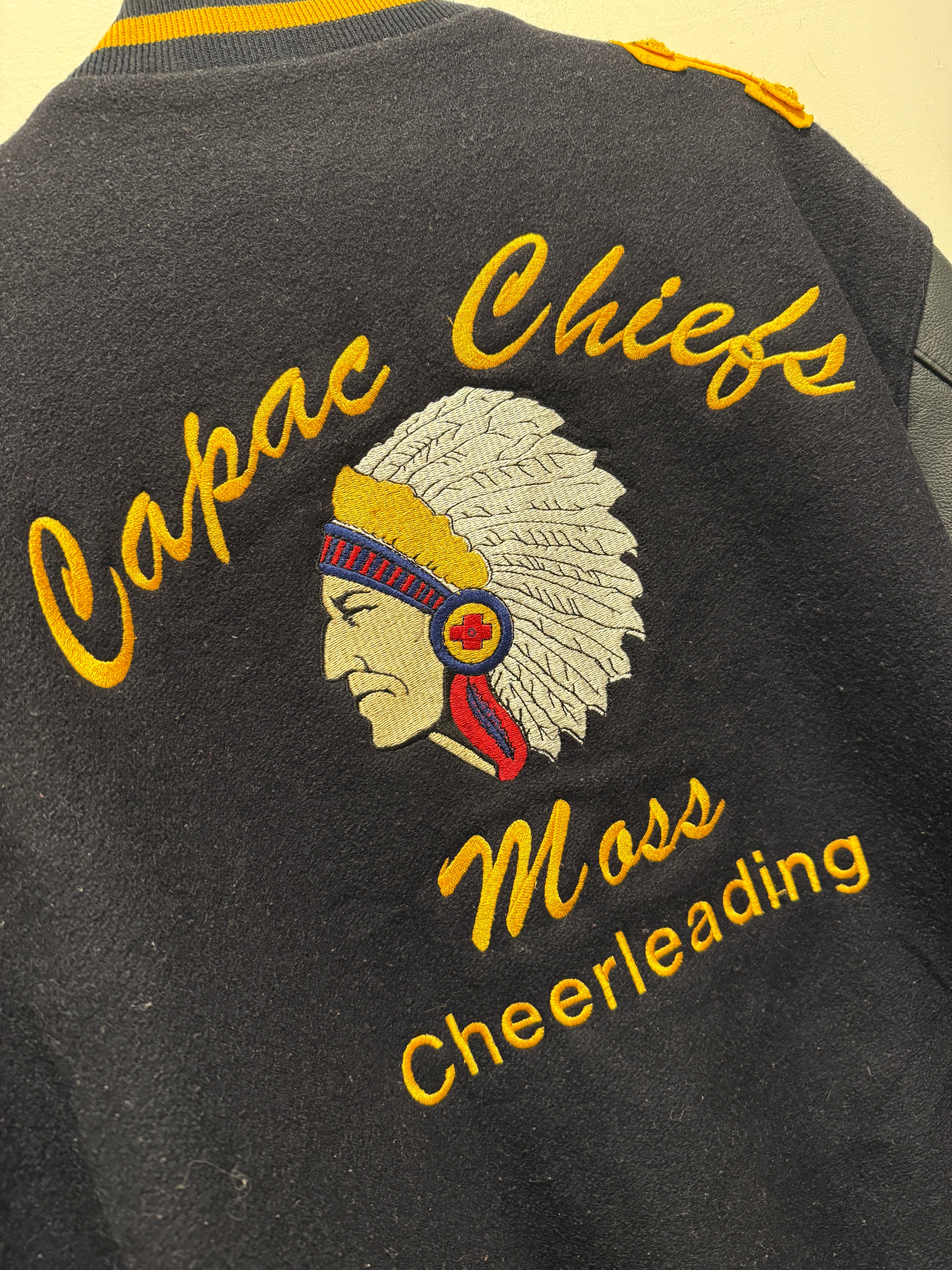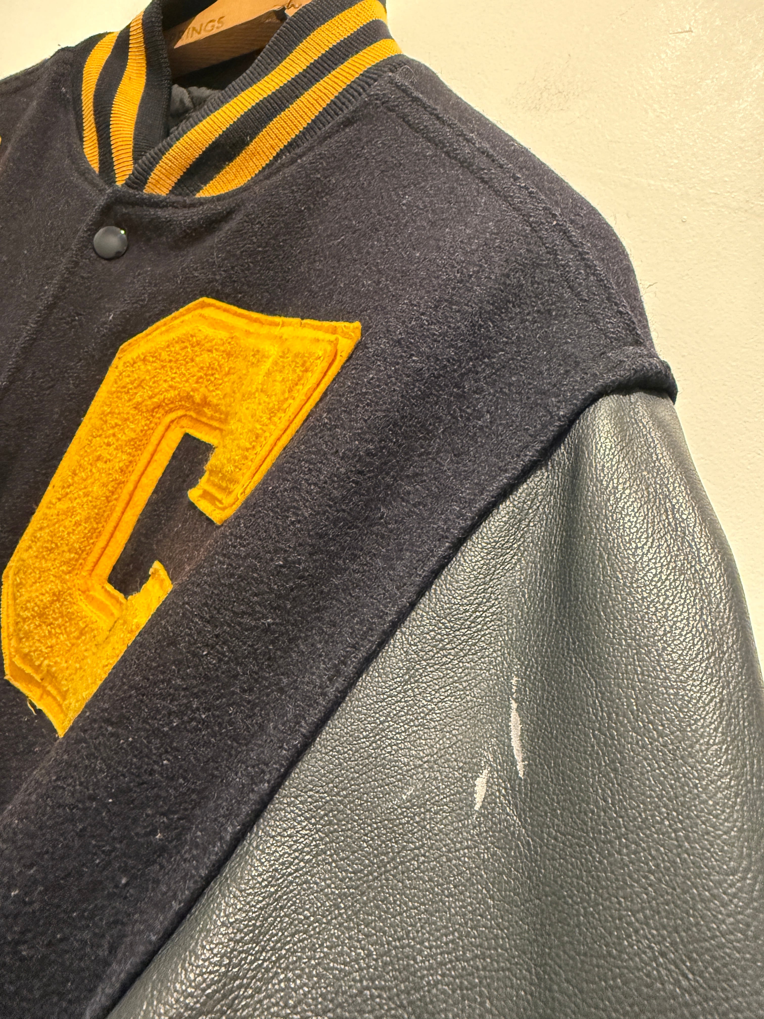 2013年アメリカ製ホロウェイのバーシティジャケットです。ネイビー×イエローの配色がとても良く、レザー部分もネイビーとなります。そして何よりバッグのインディアンヘッドの刺繍が最高ですね。それだけでは無くワッペンも付く豪華な1着となります。年代は浅めですがしっかりアメリカ製でインディアン物とオススメなスタジャンです。