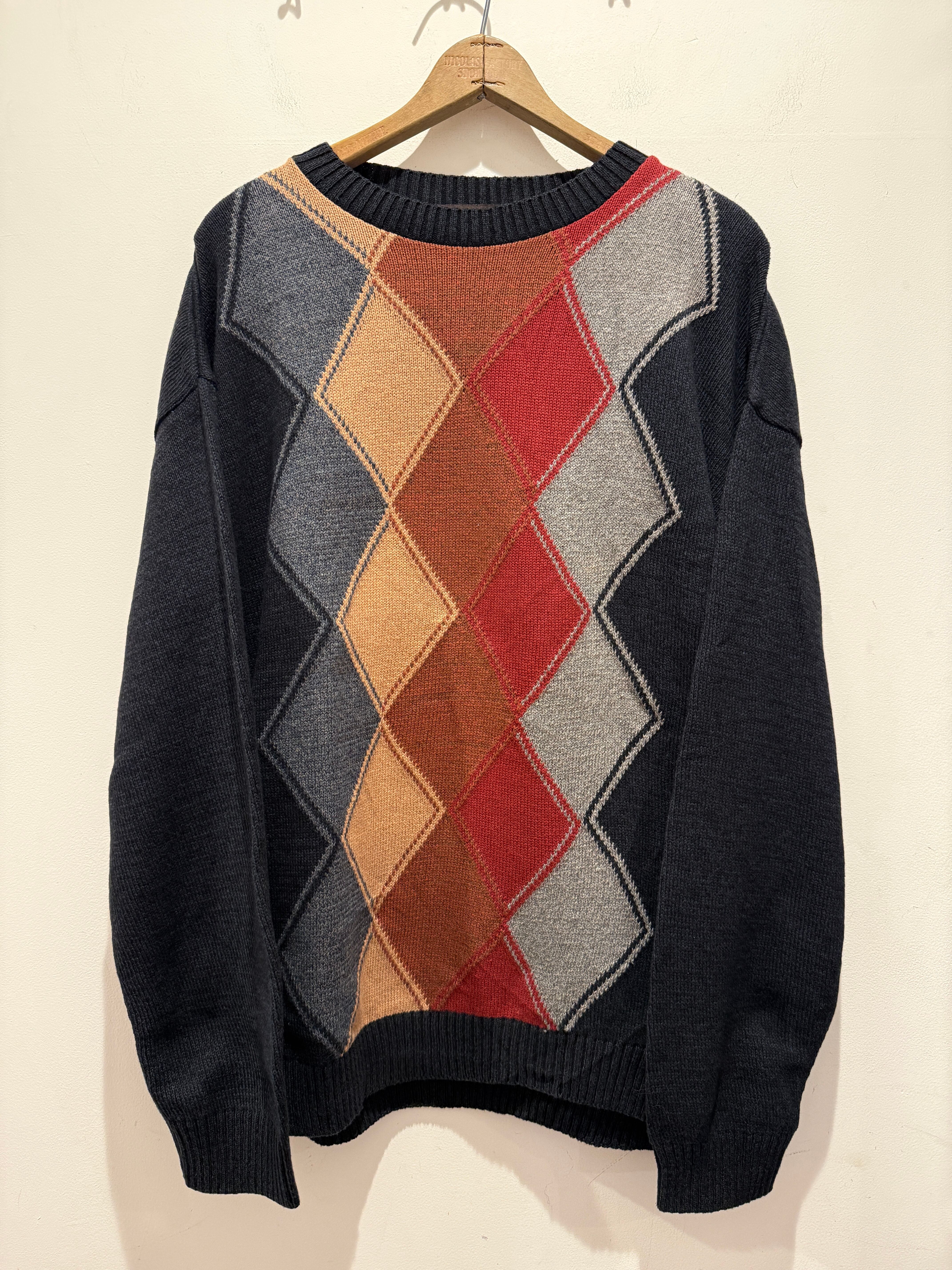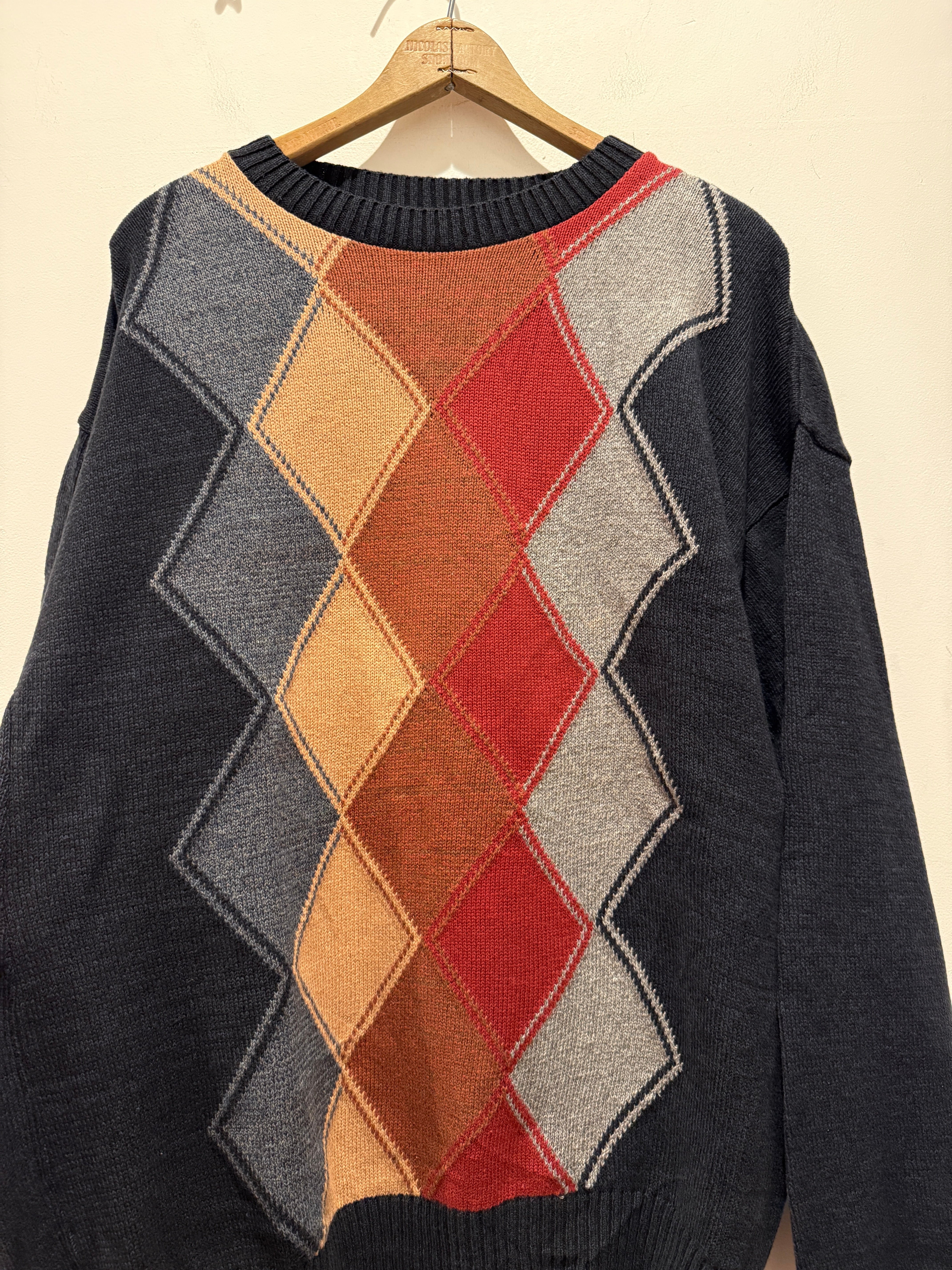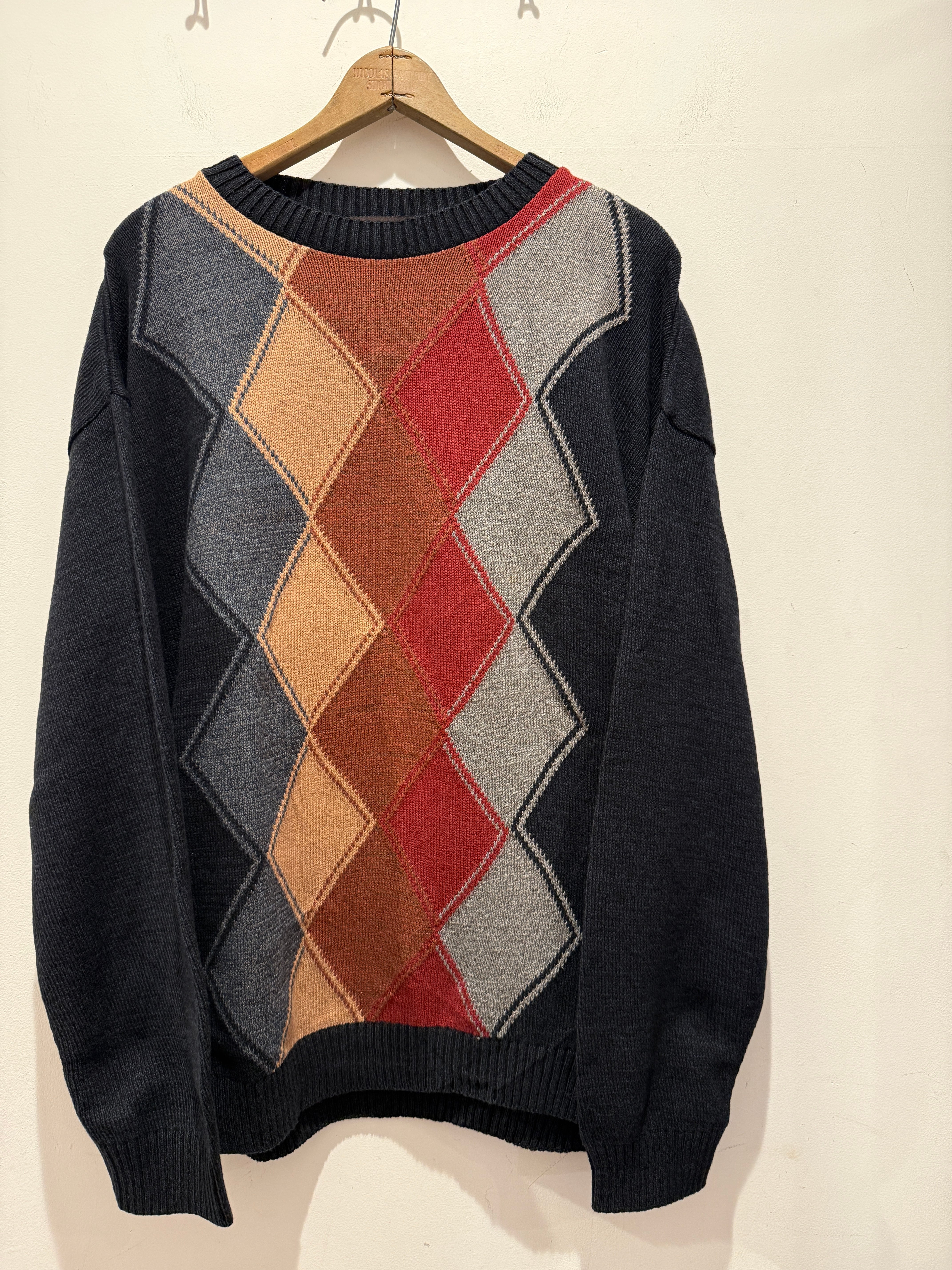 90年代アメリカ製のデザインコットンニットです。ブラックベースのボディカラーにアーガイル柄がとても良い1着です。フロントに柄でバッグが無地なのも良いですね。Mサイズ表記ですが大きめな作りとなっています。コンディションも良くしっかりアメリカ製とユニセックスでオススメなアイテムです。
