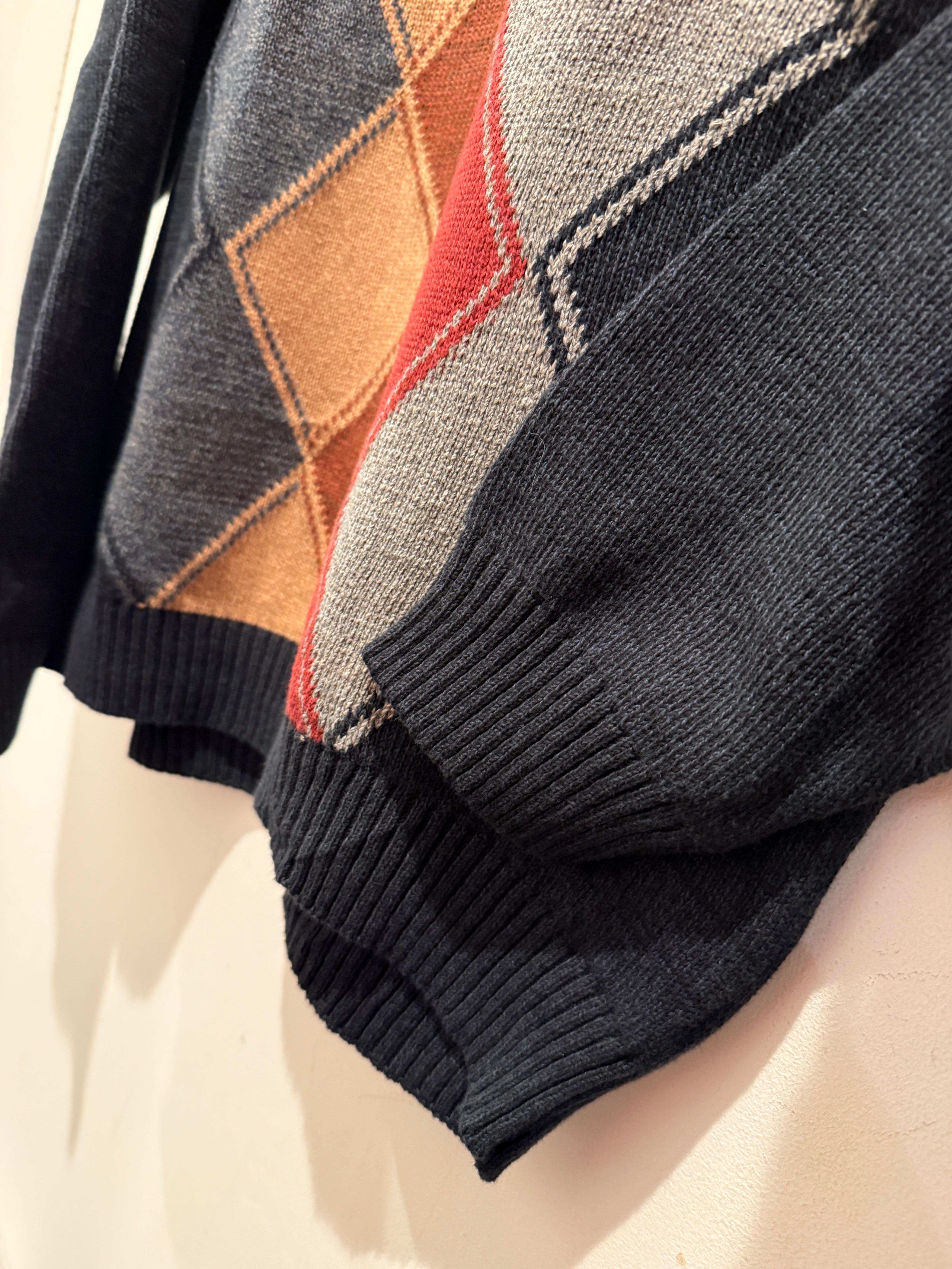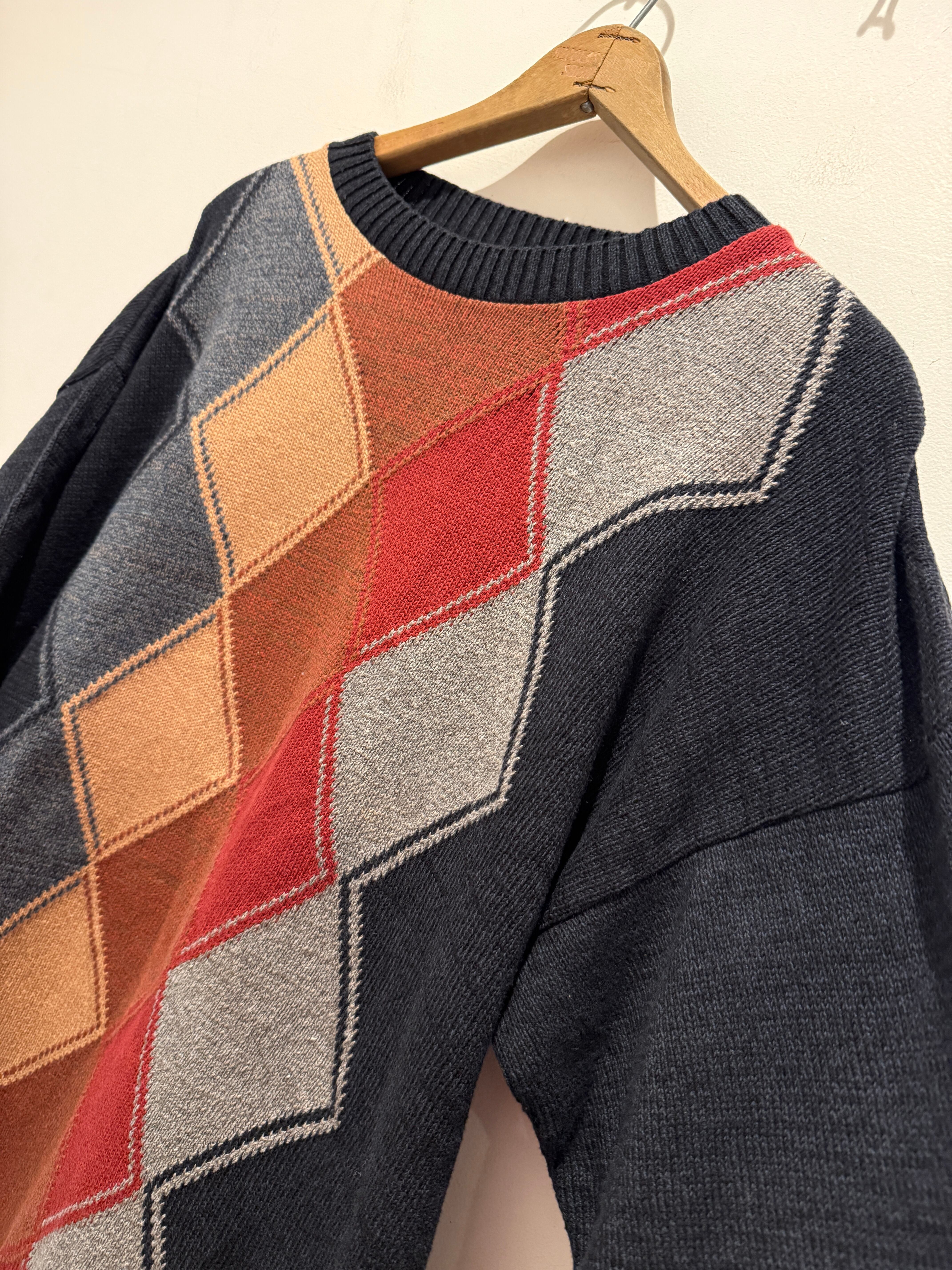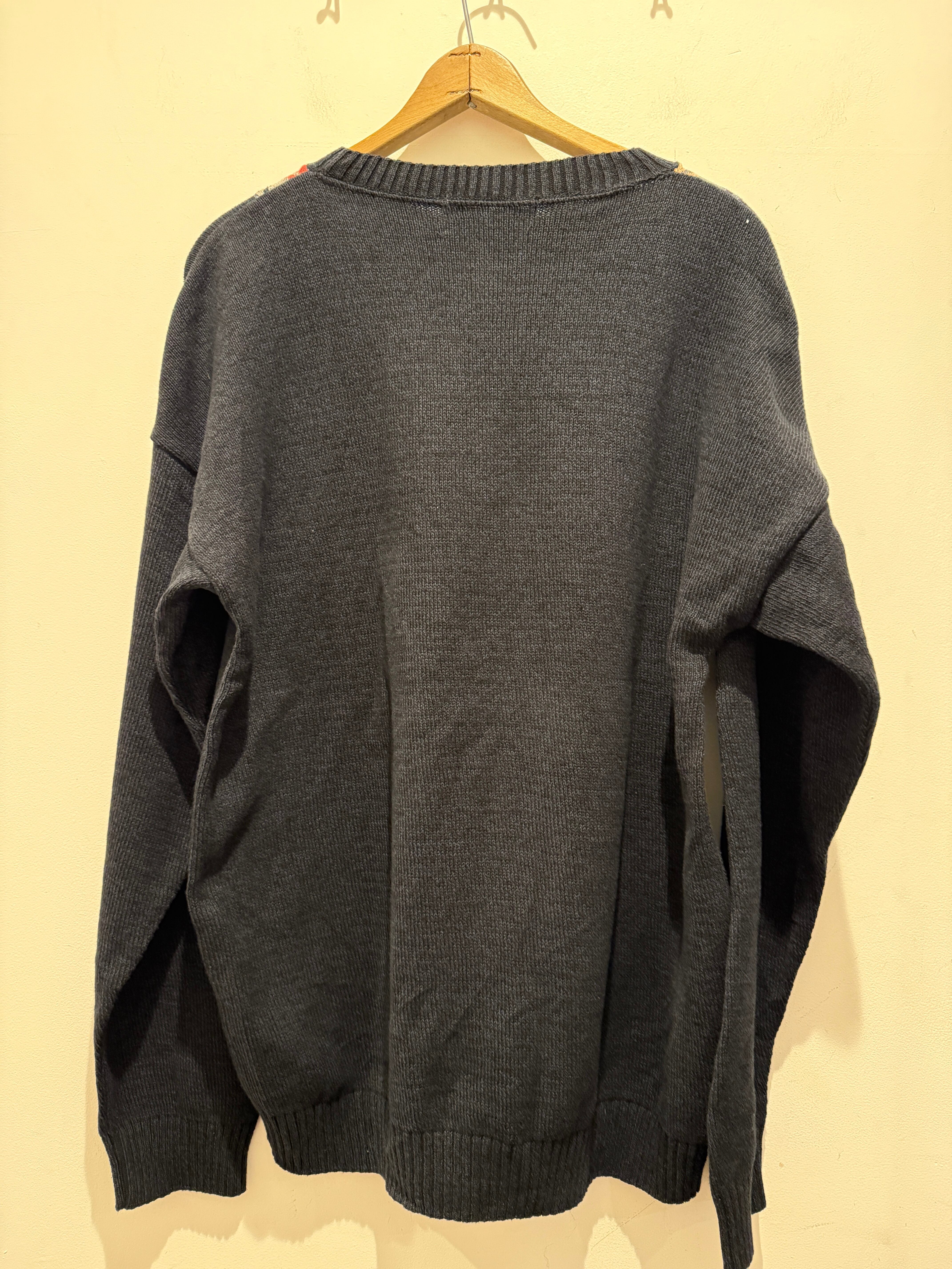 90年代アメリカ製のデザインコットンニットです。ブラックベースのボディカラーにアーガイル柄がとても良い1着です。フロントに柄でバッグが無地なのも良いですね。Mサイズ表記ですが大きめな作りとなっています。コンディションも良くしっかりアメリカ製とユニセックスでオススメなアイテムです。