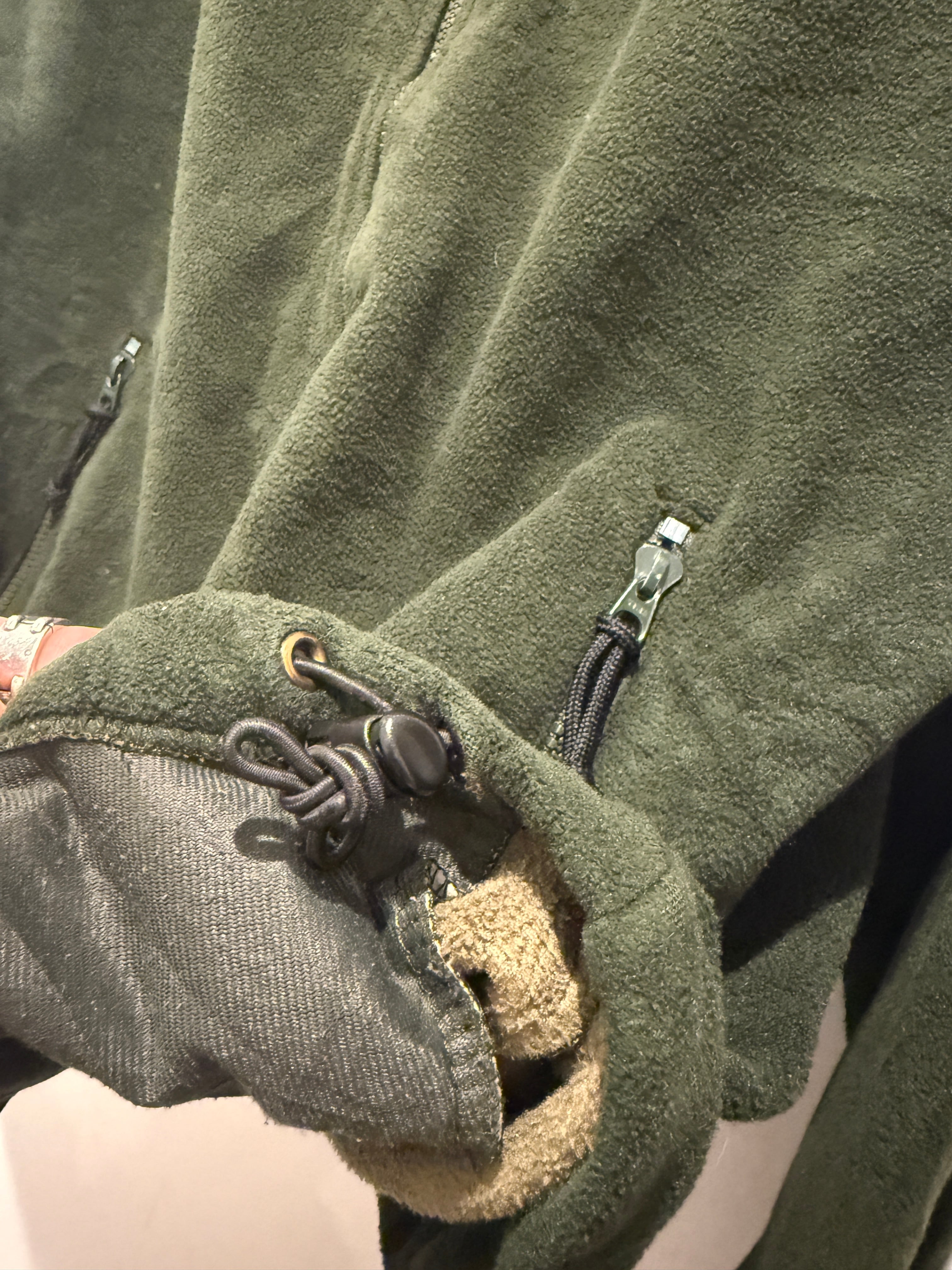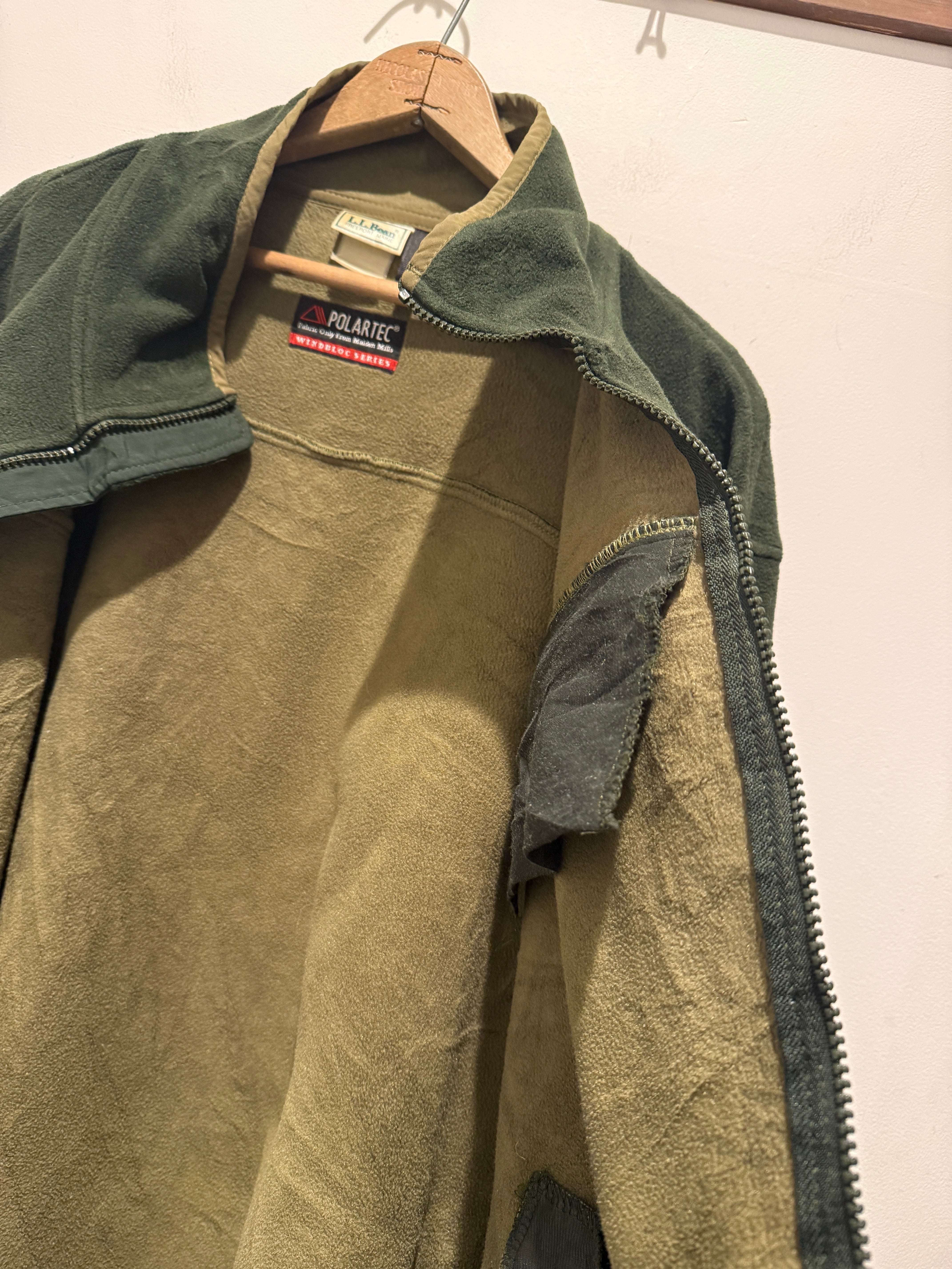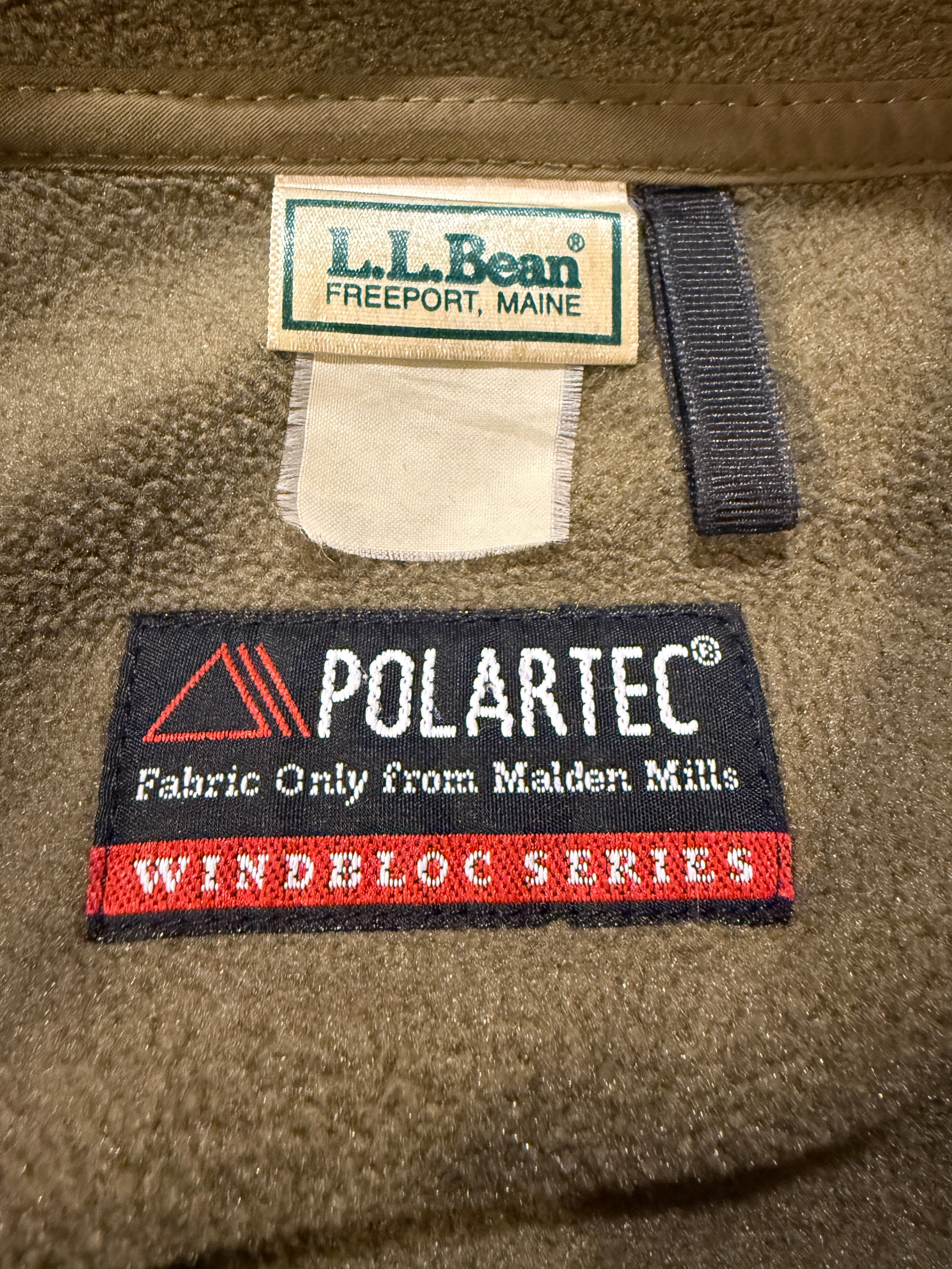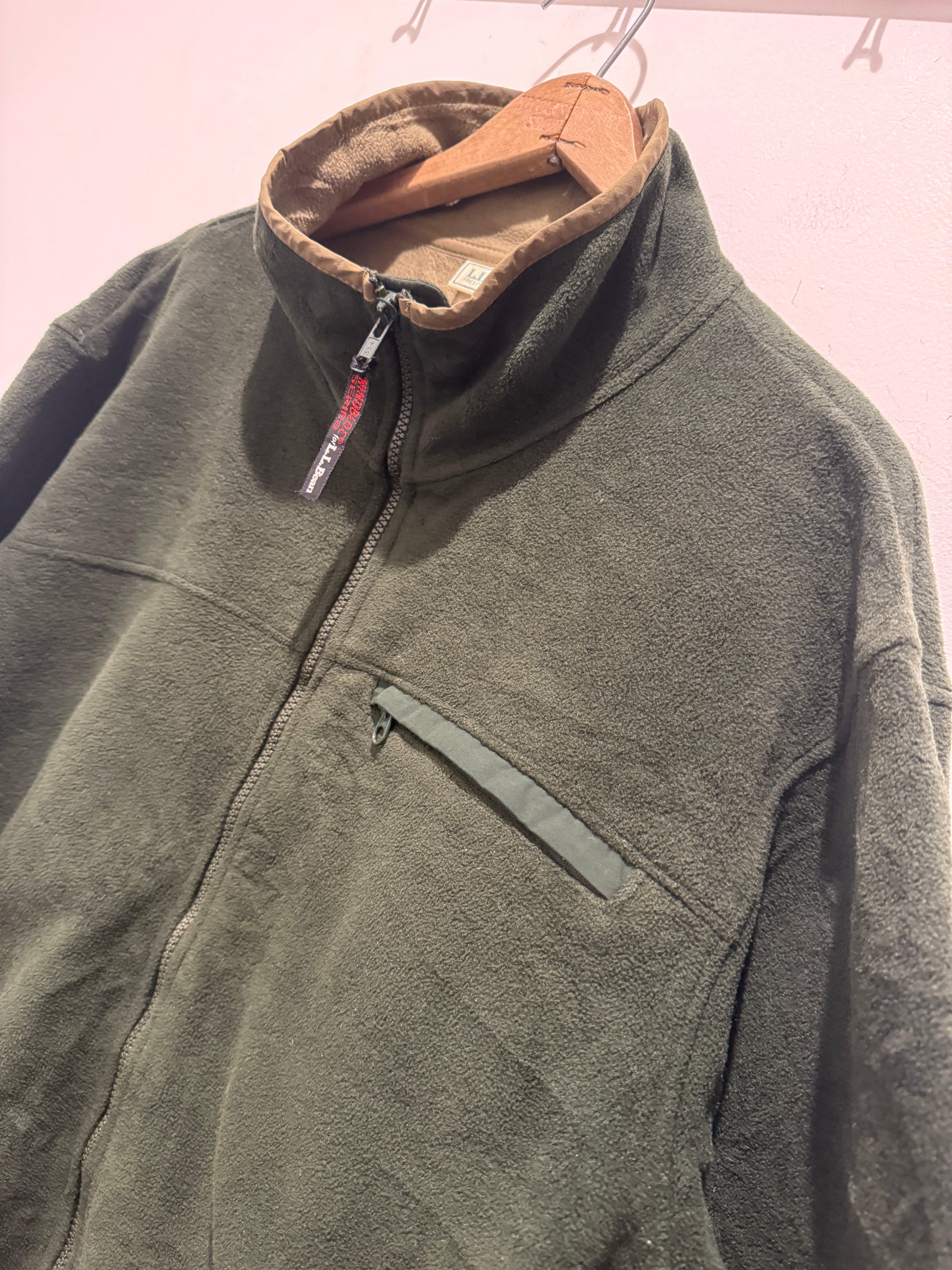 80年代〜90年代LLビーンのフルジップフリースです。表がオリーブグリーン、裏地がコヨーテカラーとミリタリーな配色がとても良い1着です。さり気無く裾に付くタグとドローコードで絞れるのも最高ですね。肉厚な生地感でポーラテックとアウターとしても着用出来てオススメです。