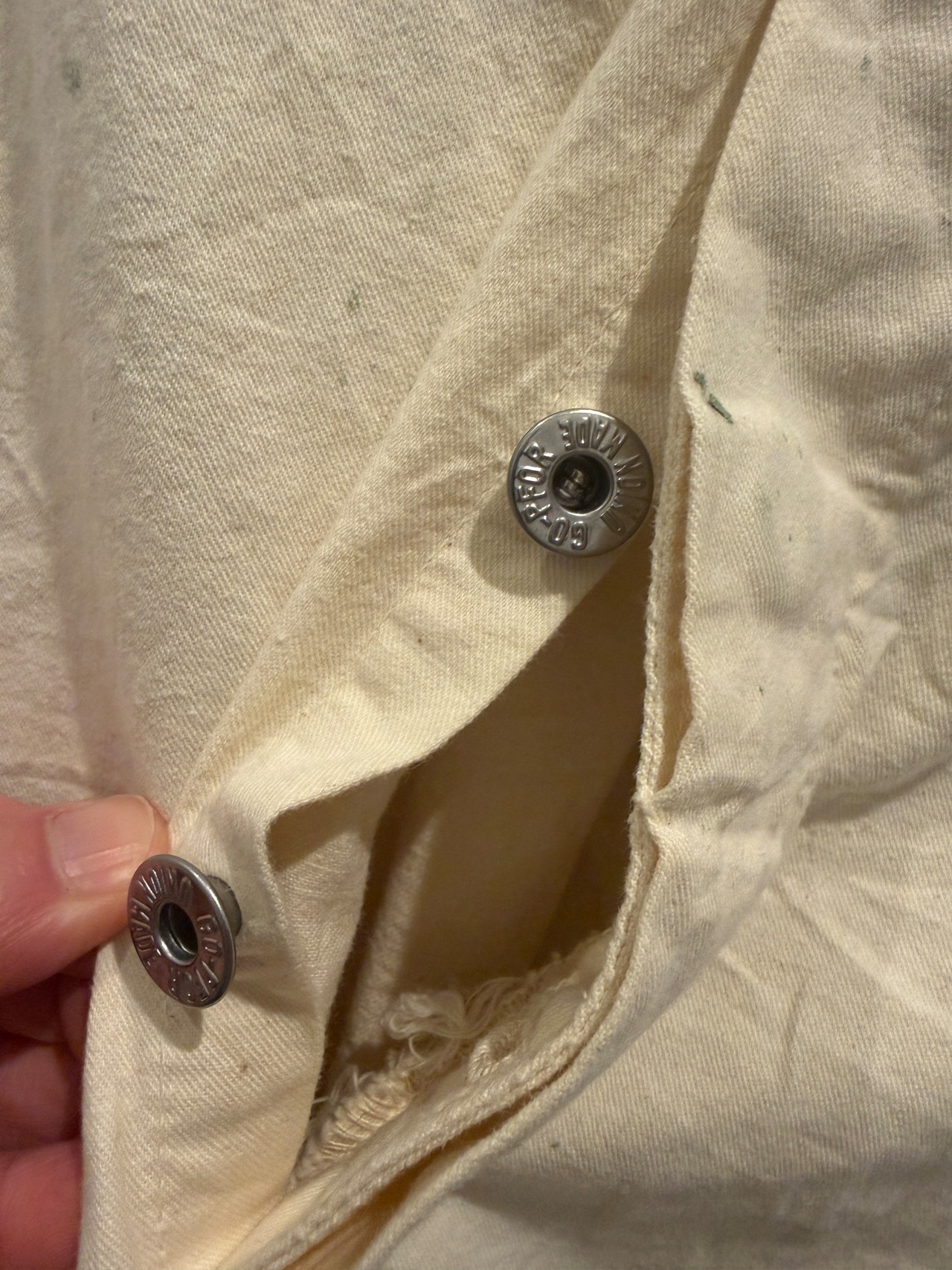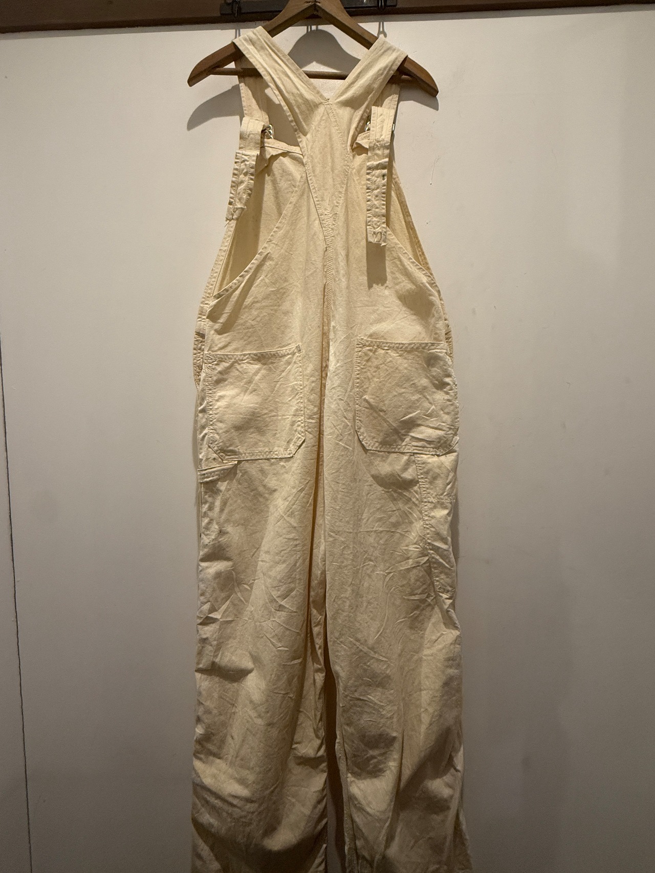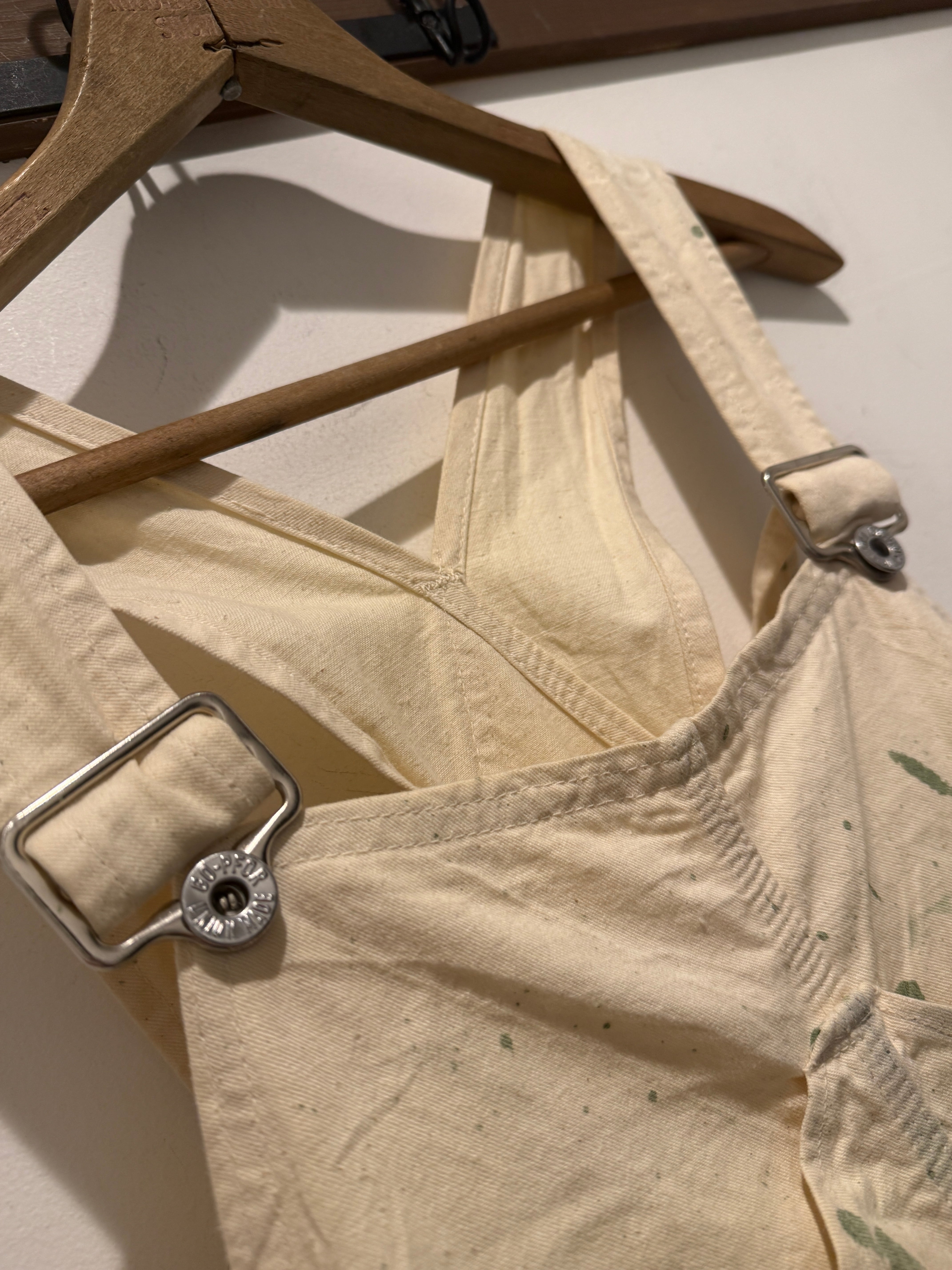 50年代ヴィンテージGO-PFORのオーバーオールです。アメリカ・ミネソタ州ニコレット郡の都市、セントピーターのJOHNSON&COMPANYのブランドGO-PFOR。こちらは生成りのオーバーオールで山ポケ仕様がとても良い1着です。アルミのドーナツボタンでユニオンタグも残っています。またフラッシャーが付いていたと思われるホッチキスの針も残っていてペンキなど雰囲気も最高でサイズ感も良くオススメなオーバーオールです。