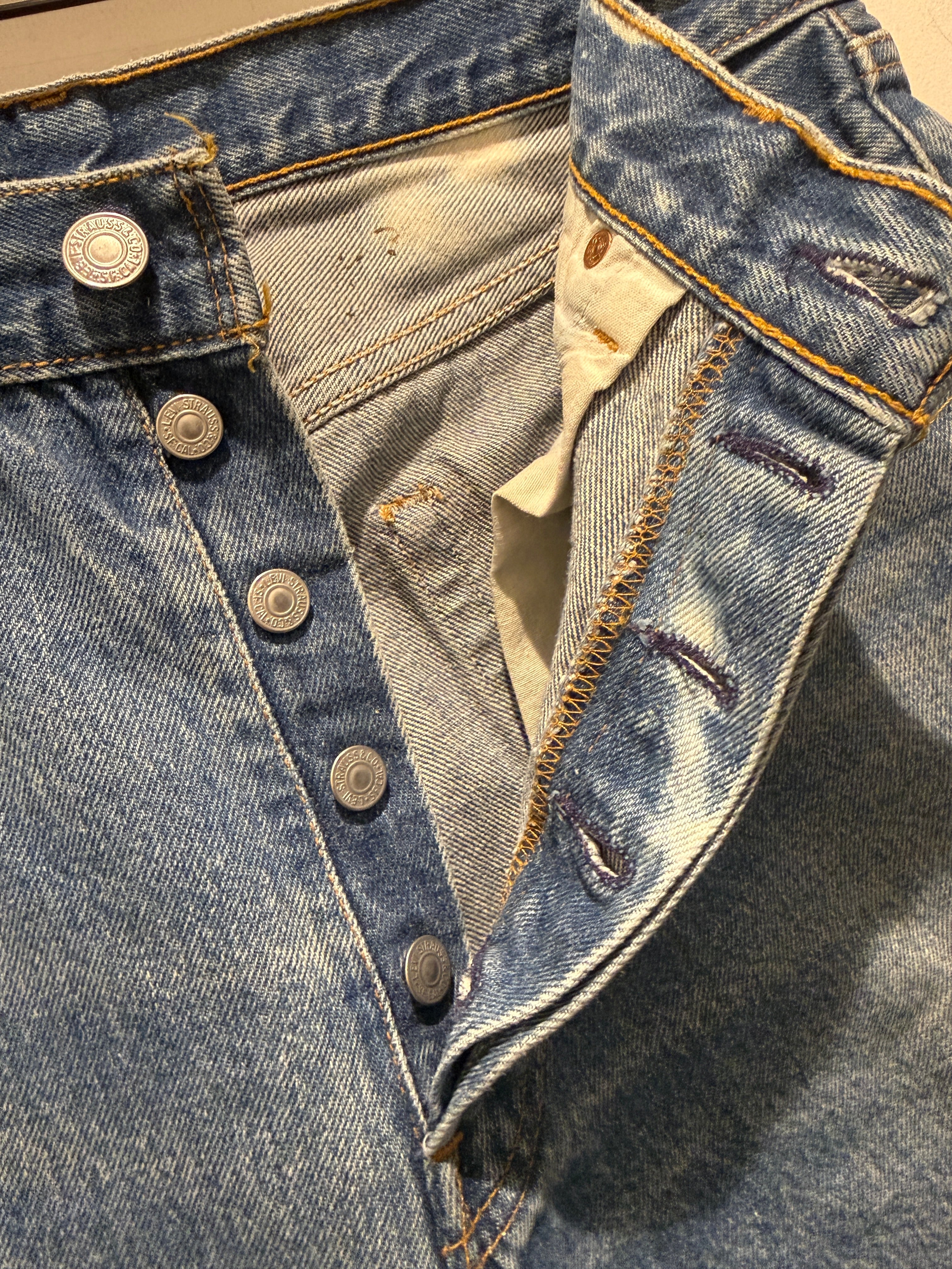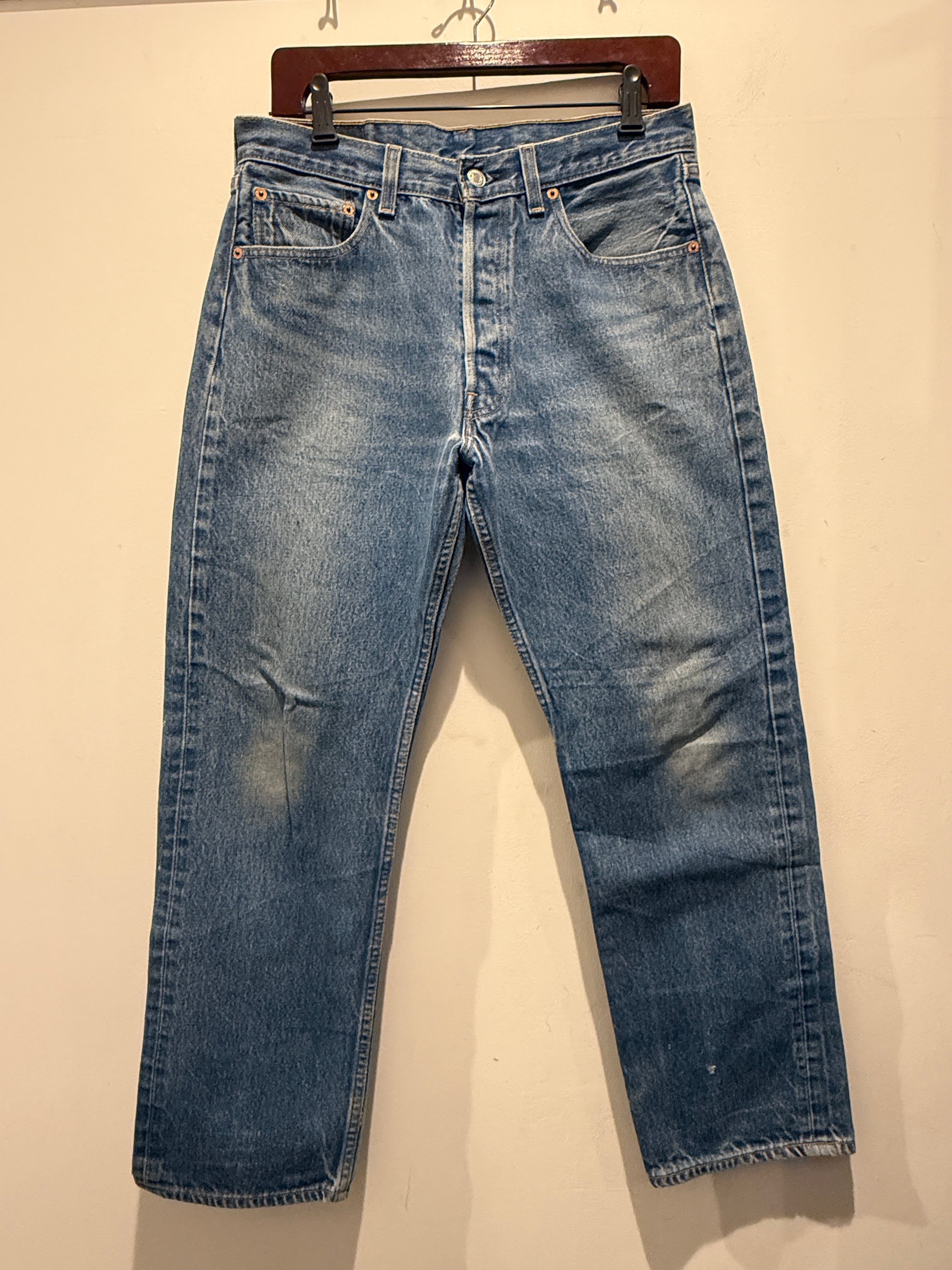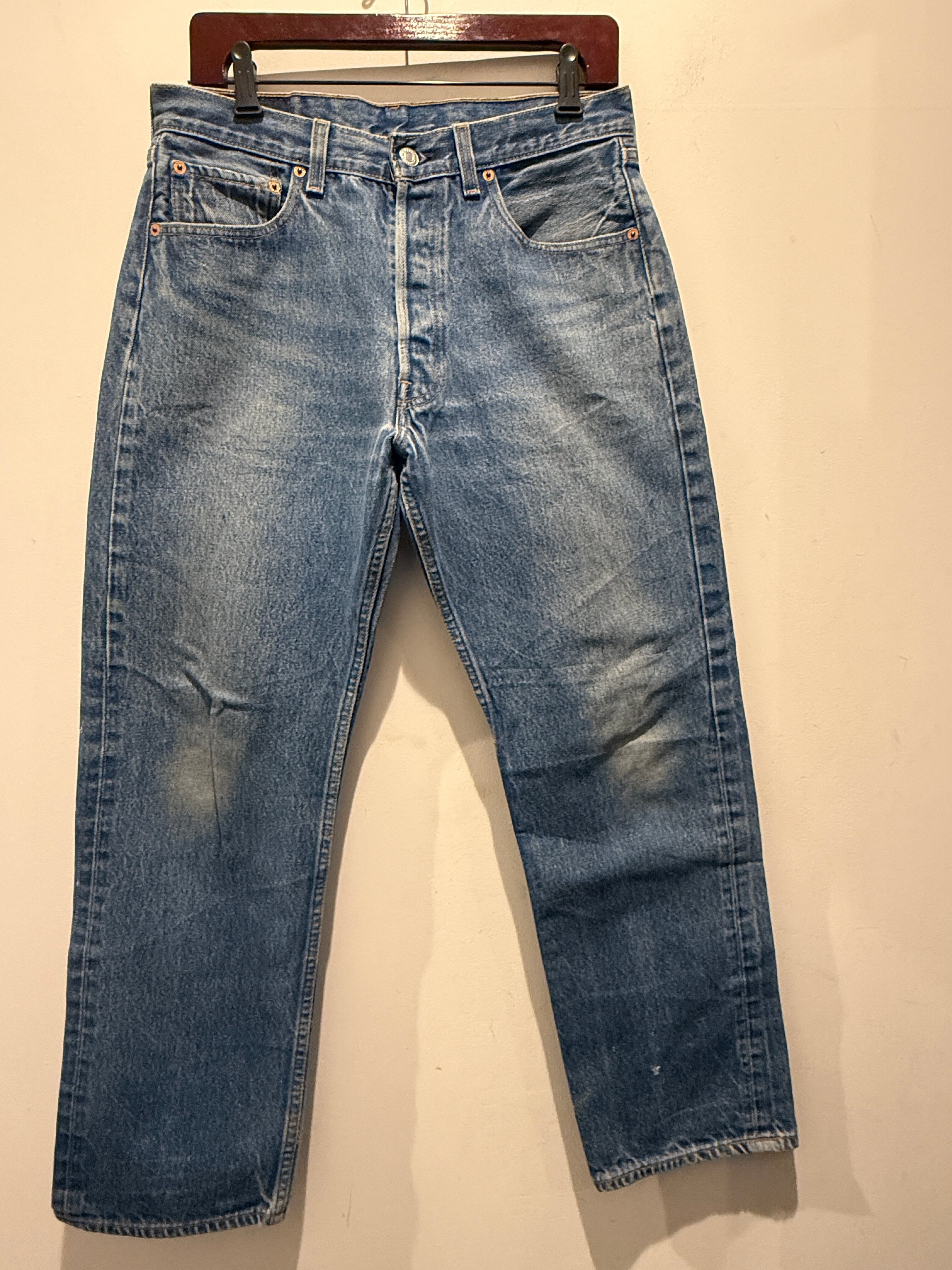 90年代アメリカ製リーバイス501デニムパンツです。1997年3月製造の501でトップボタン裏555のバレンシア工場で作られた1本となります。うっすらとヒゲもあり、良い色落ち感のデニムとなります。実寸でW32×L29とサイズ感も良くオススメです。