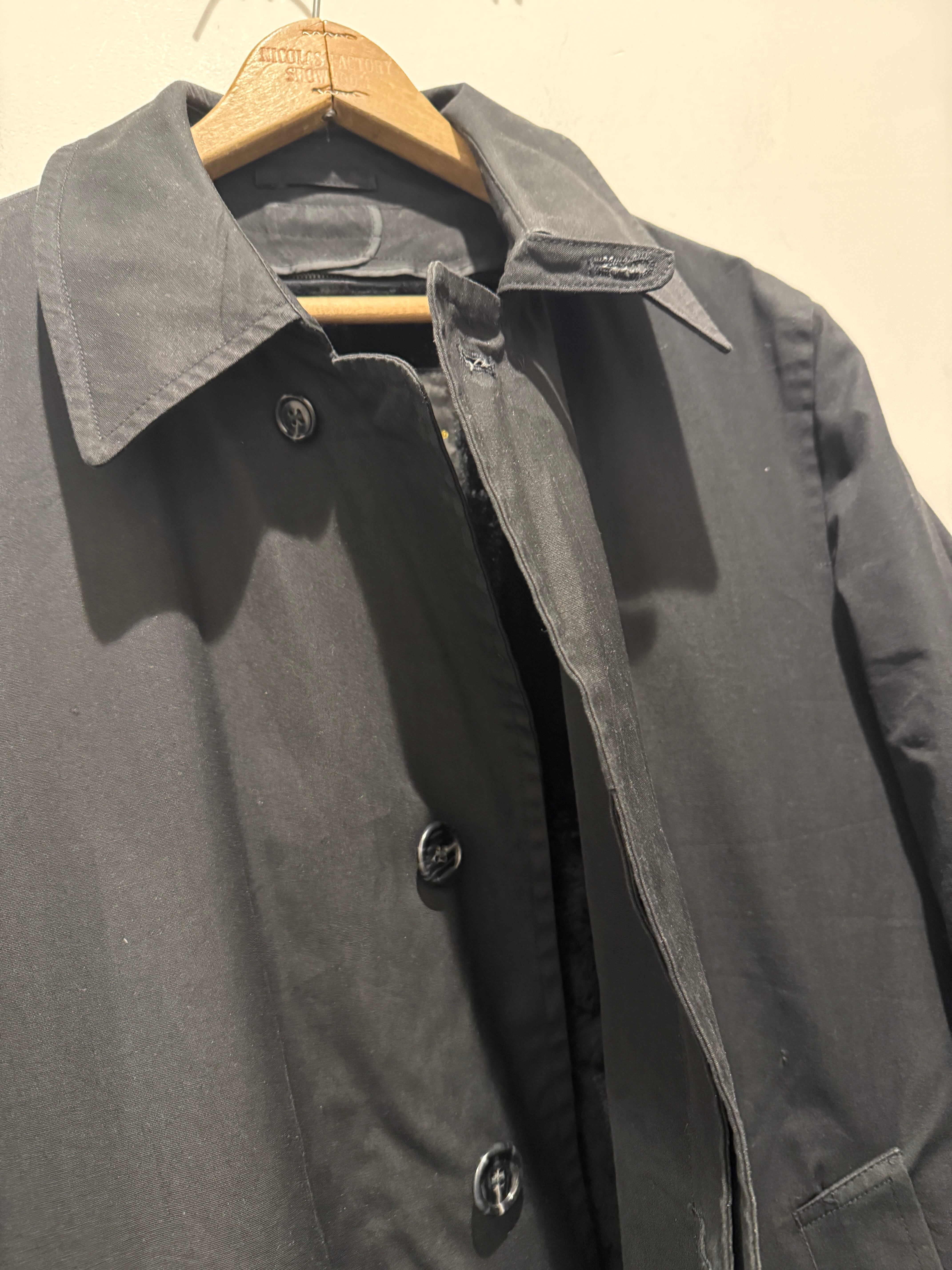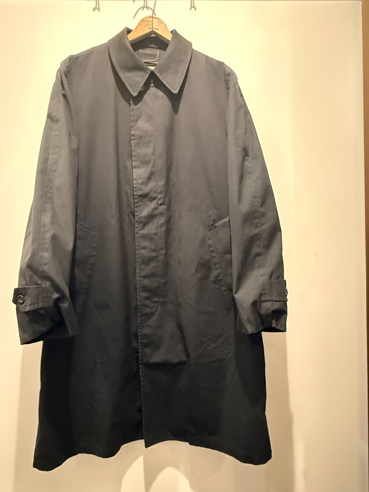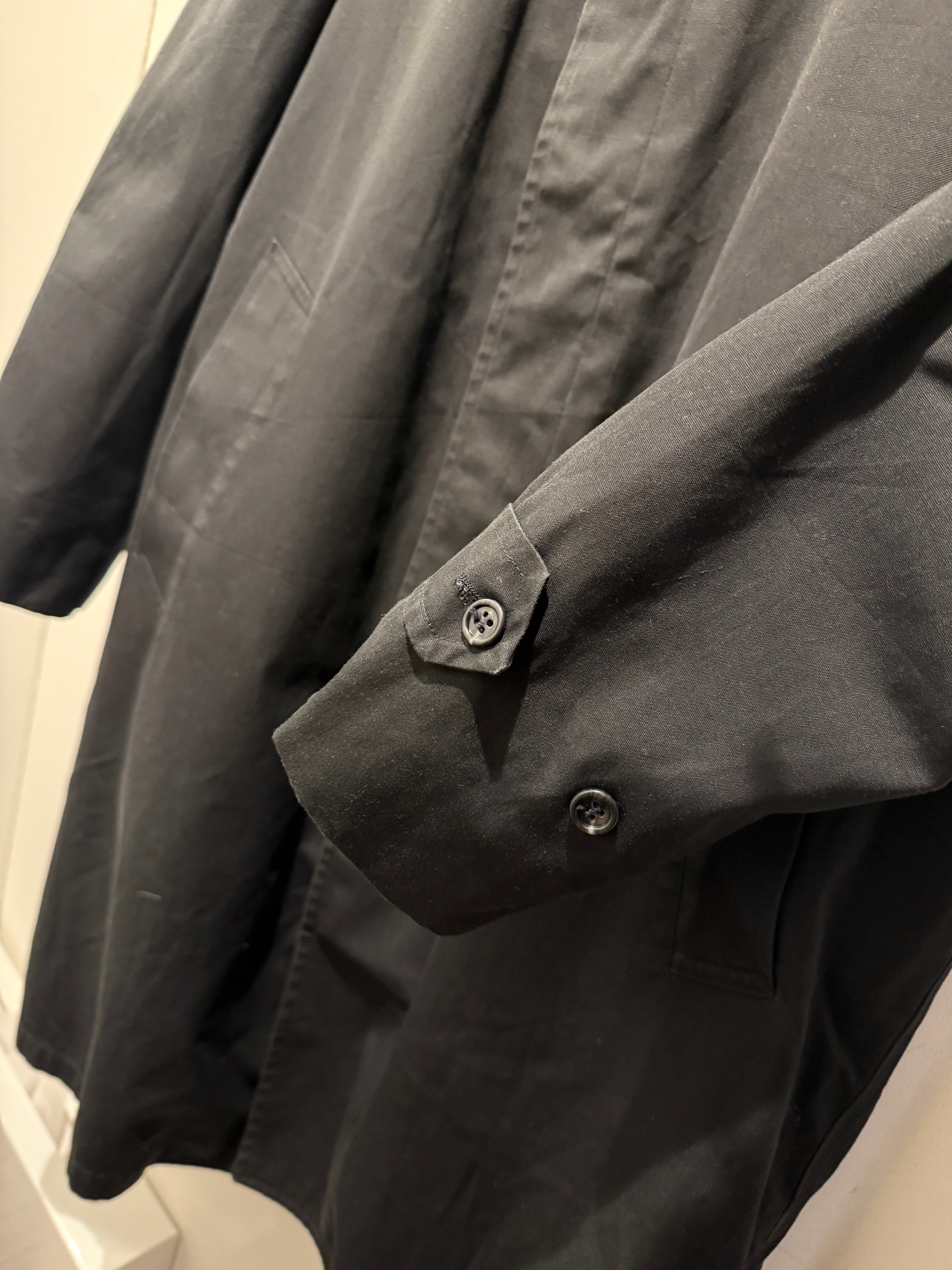 70年代ロンドンフォグのバルマカーンコートです。ブラックカラーでライナーのジッパーはアルミのTALONとなります。無地のブラックカラーで、はりのある生地感が上品な印象です。エポーレットが付かず中のライナーのボアもフカフカなのが最高ですね。ライナーも取り外し可能で春、秋、冬と3シーズン使えるコートです。コンディションも良く普段着でもビジネスでも使えてオススメなアウターです。