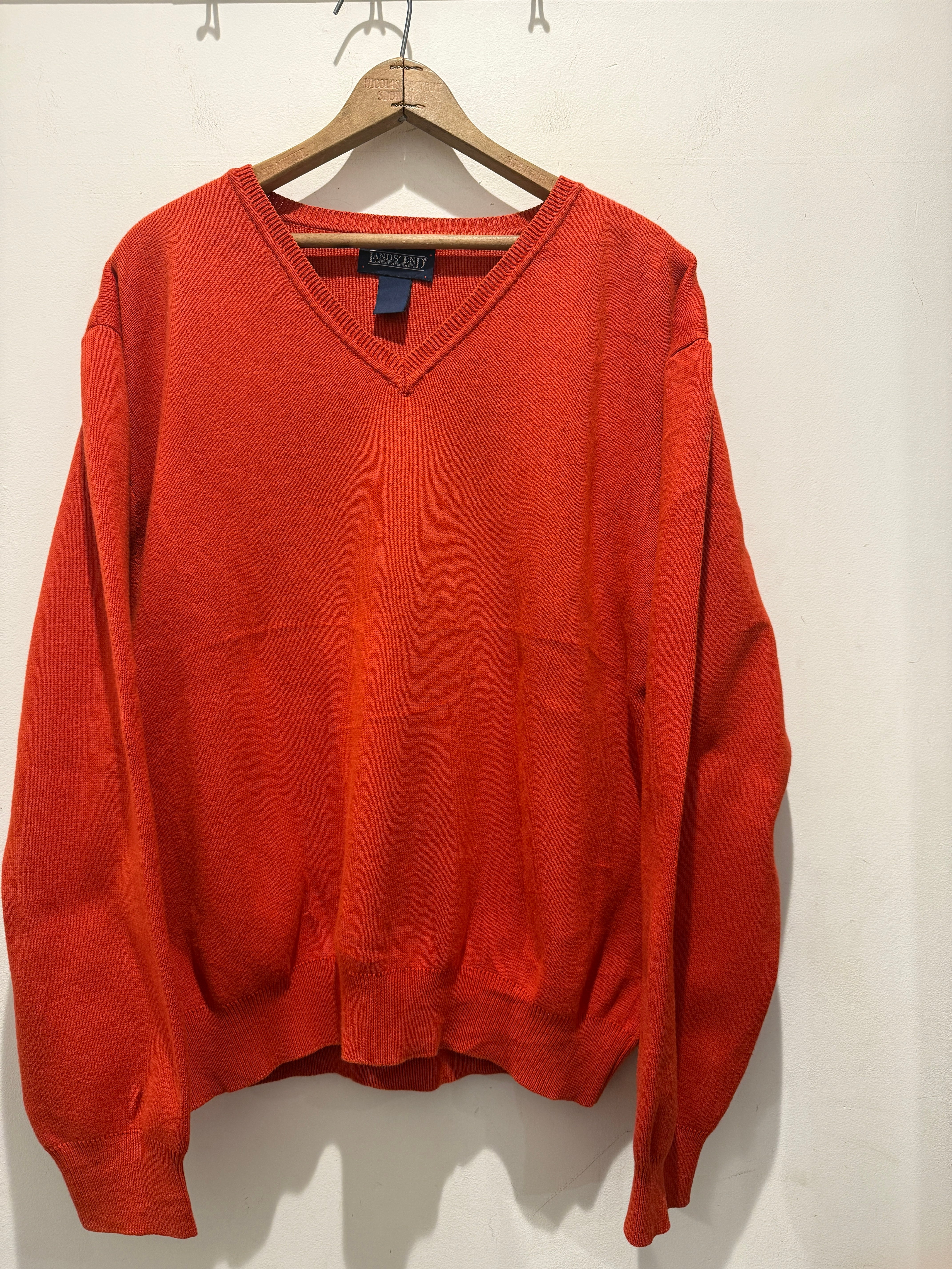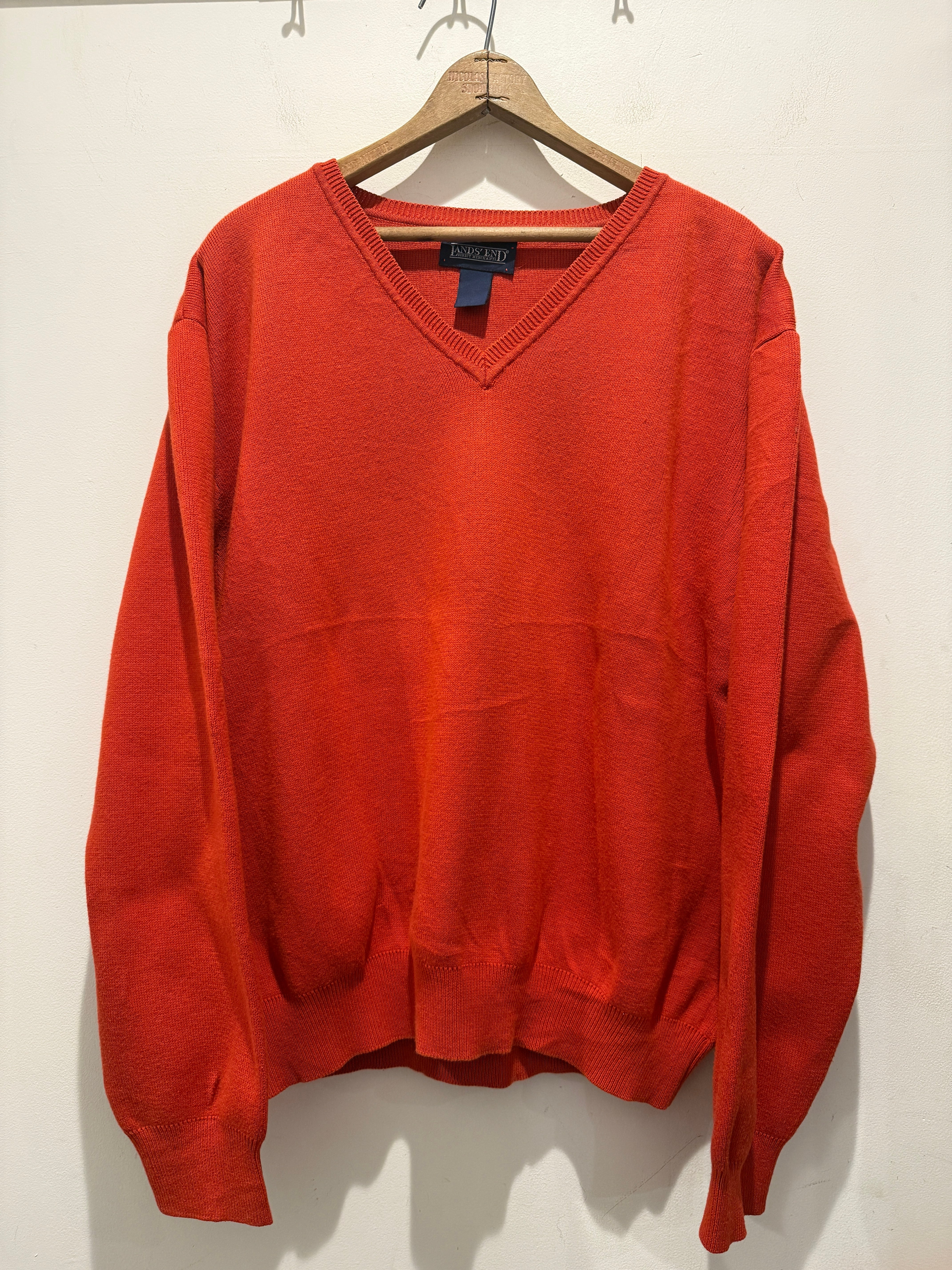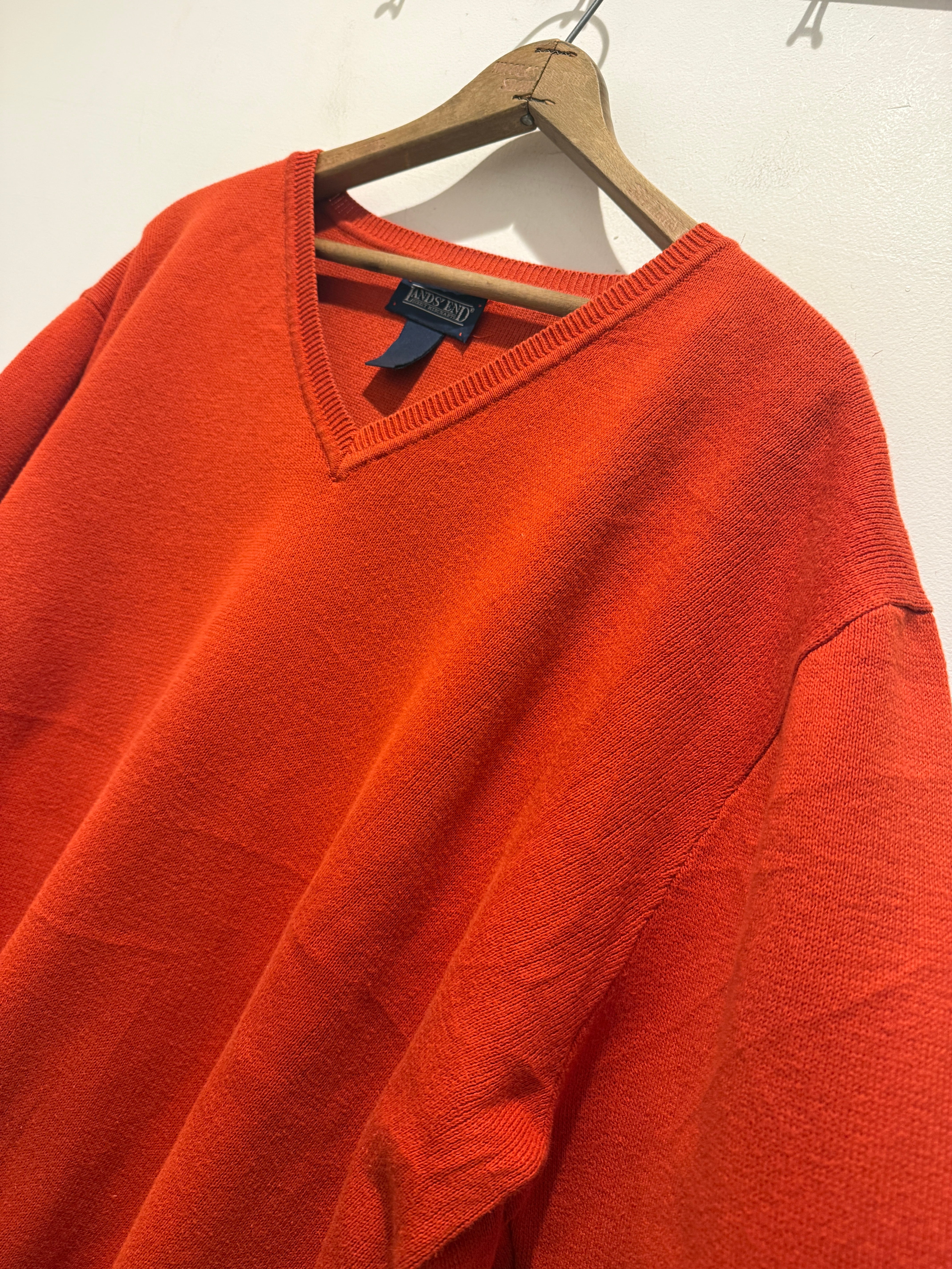 90年代アメリカ製ランズエンドのコットンニットです。あまり見かけないオレンジカラーがとても良い1着です。浅めのVネックで身幅たっぷりの着丈短めなシルエットも最高ですね。タグの印字が薄くなっていますがアメリカ製は確認出来ます。コンディションも良くアウターのインナーとしての差し色としても使えてオススメです。