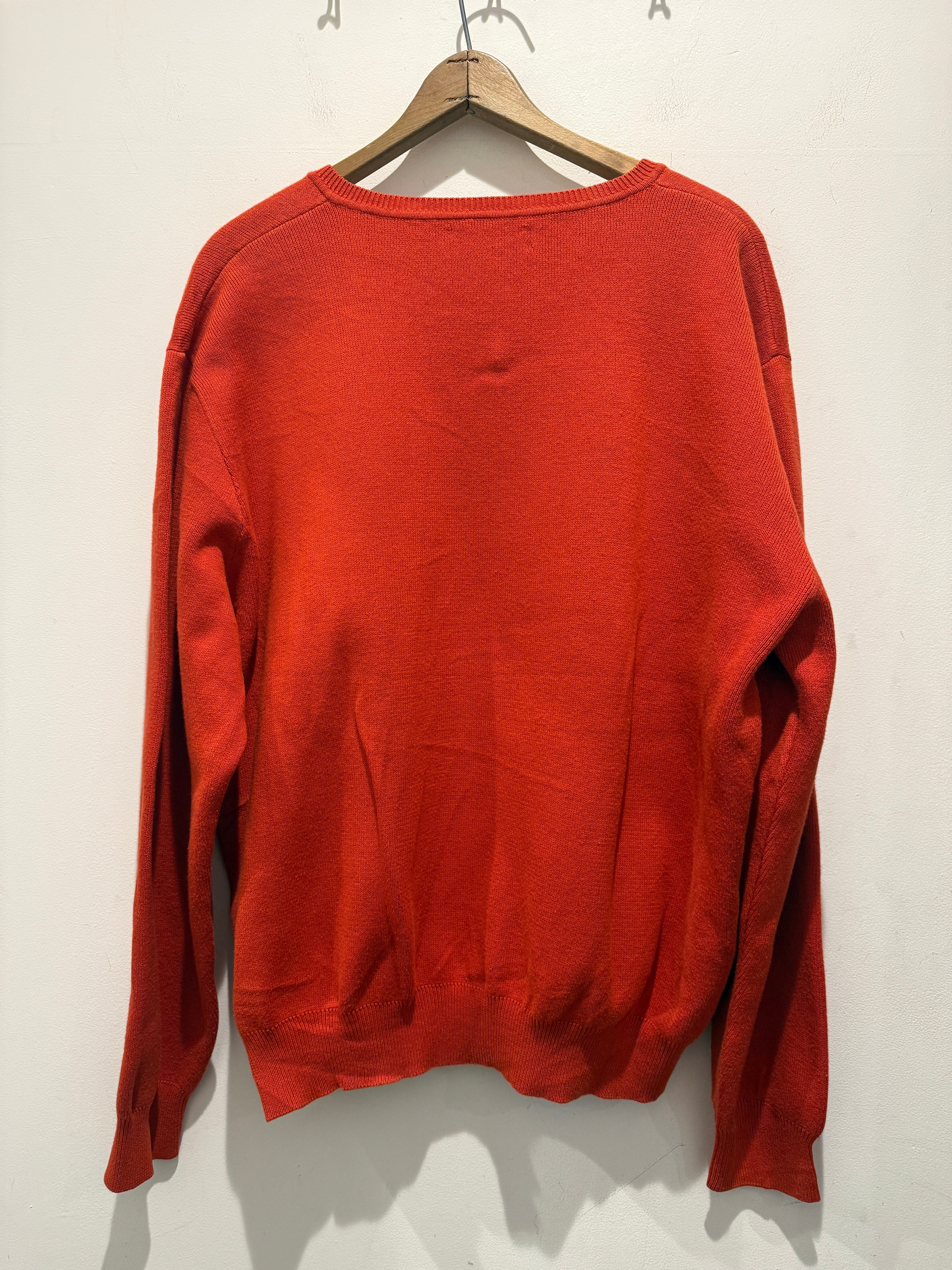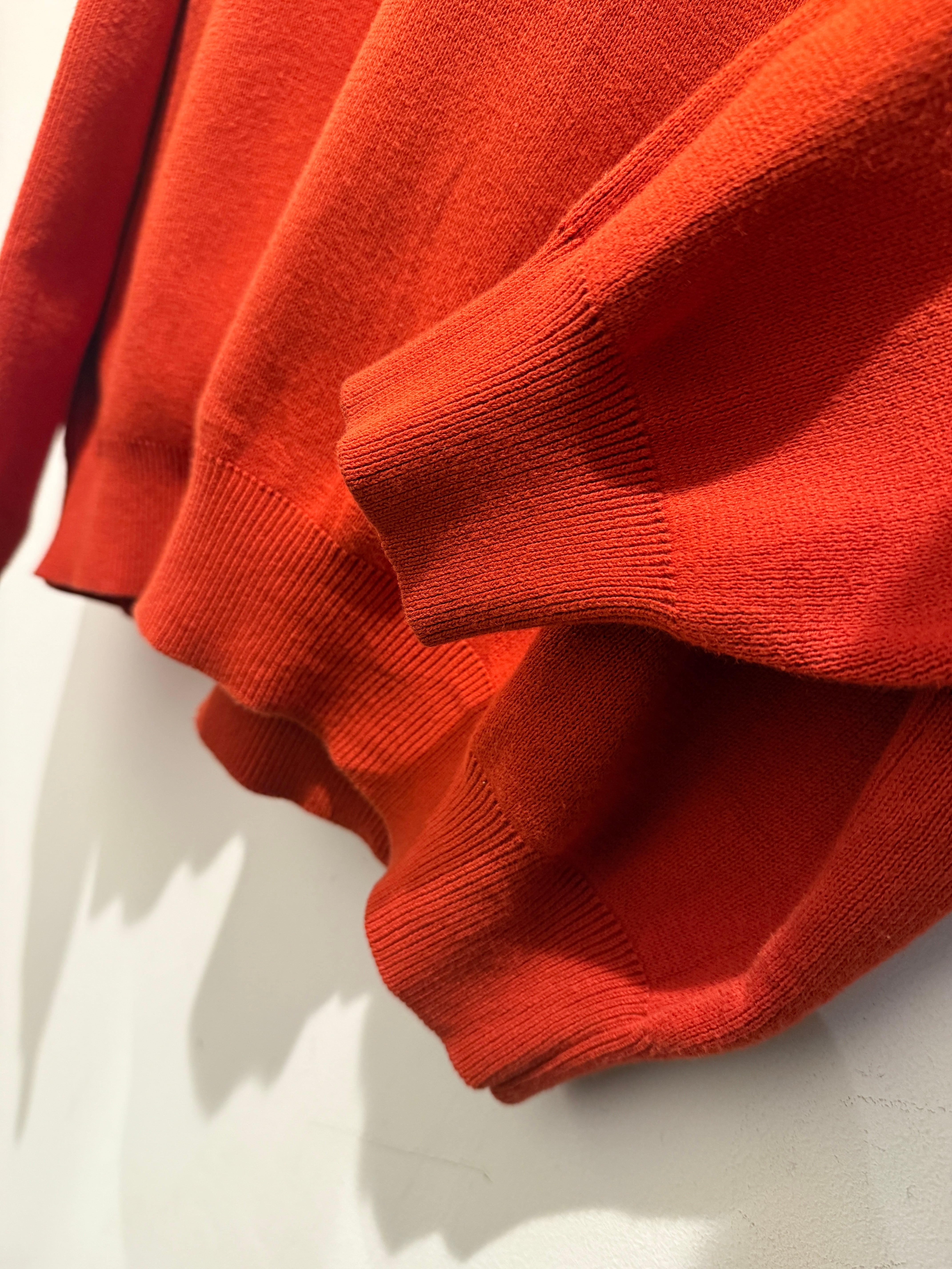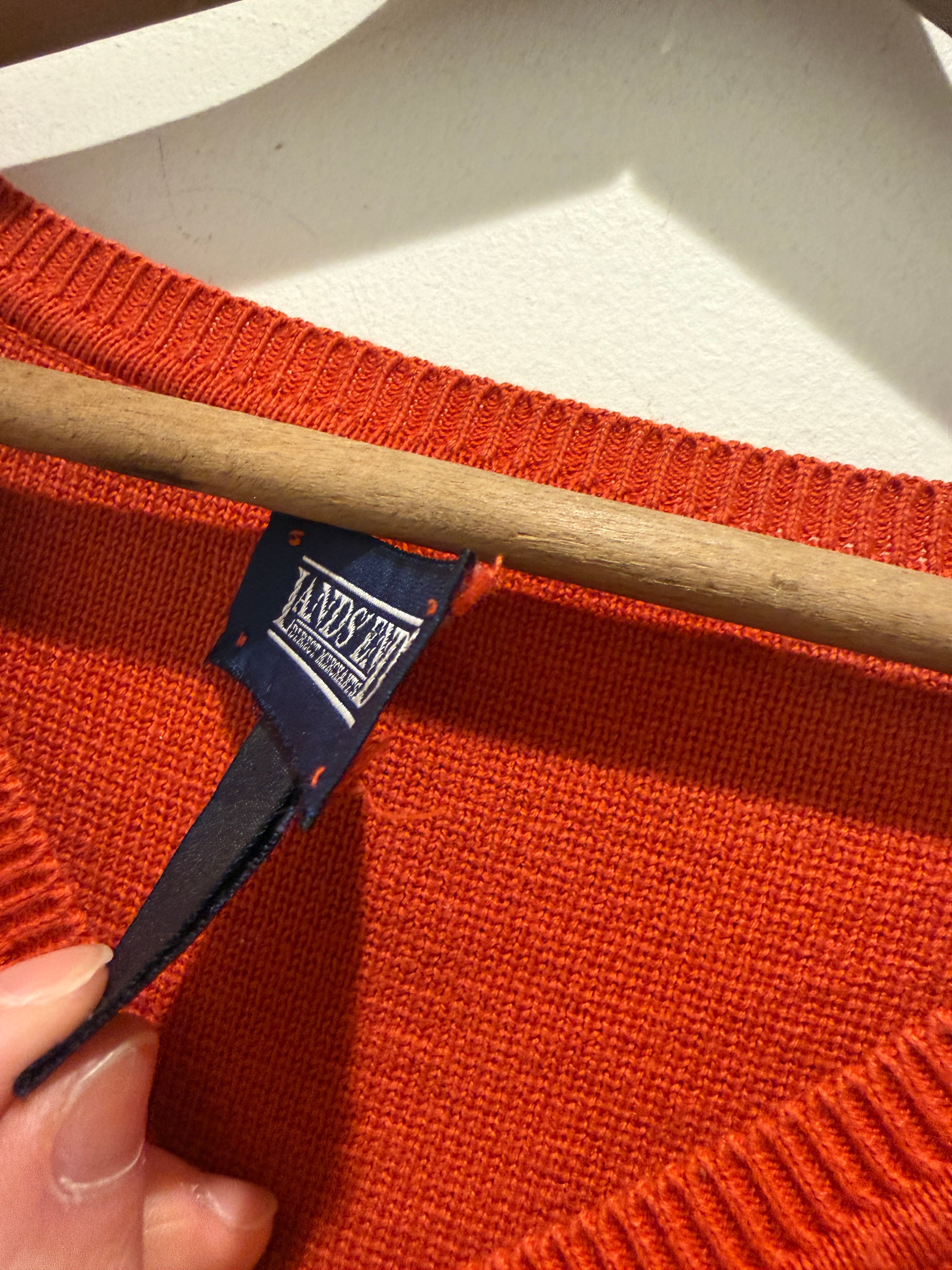 90年代アメリカ製ランズエンドのコットンニットです。あまり見かけないオレンジカラーがとても良い1着です。浅めのVネックで身幅たっぷりの着丈短めなシルエットも最高ですね。タグの印字が薄くなっていますがアメリカ製は確認出来ます。コンディションも良くアウターのインナーとしての差し色としても使えてオススメです。